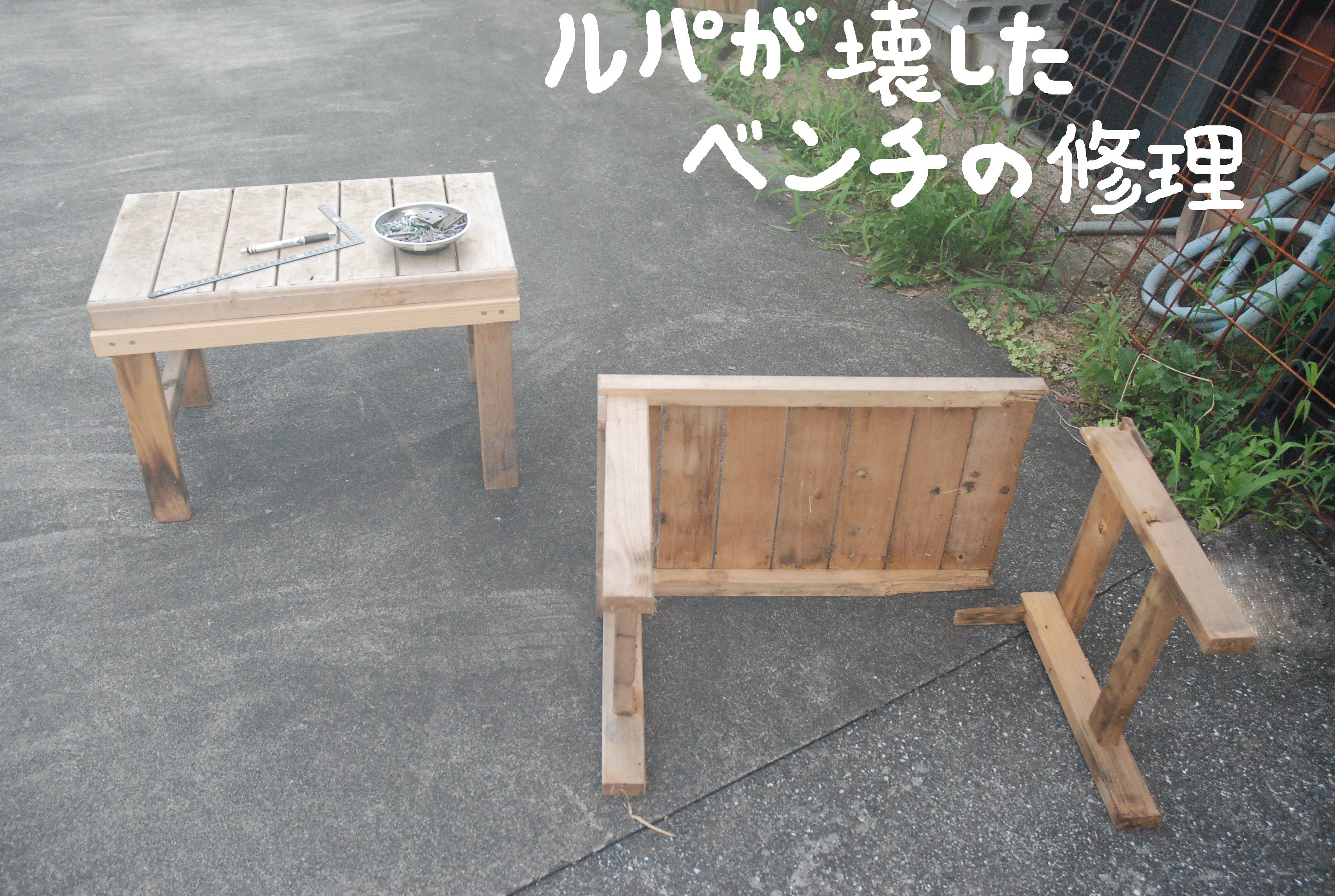ルパンは何でもかんでも破壊する。ついにキュウリ用のエサ箱を柵の外に設置した。写真①ベンチの修理,②ルパン用のエサ箱,③ミルクとの比較,④メラとミルのエサ箱,⑤丸オクラは大きくても柔らかいが…。