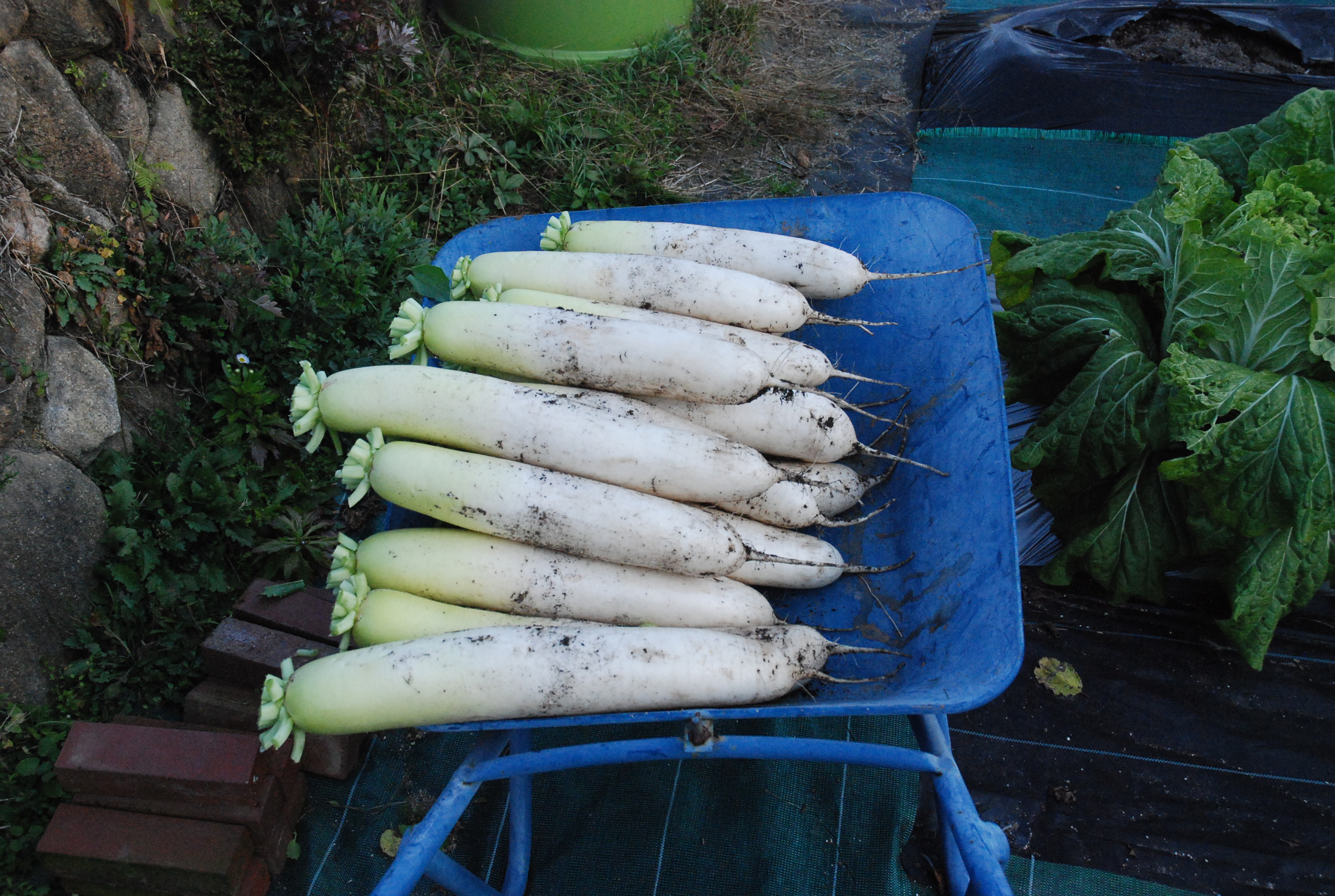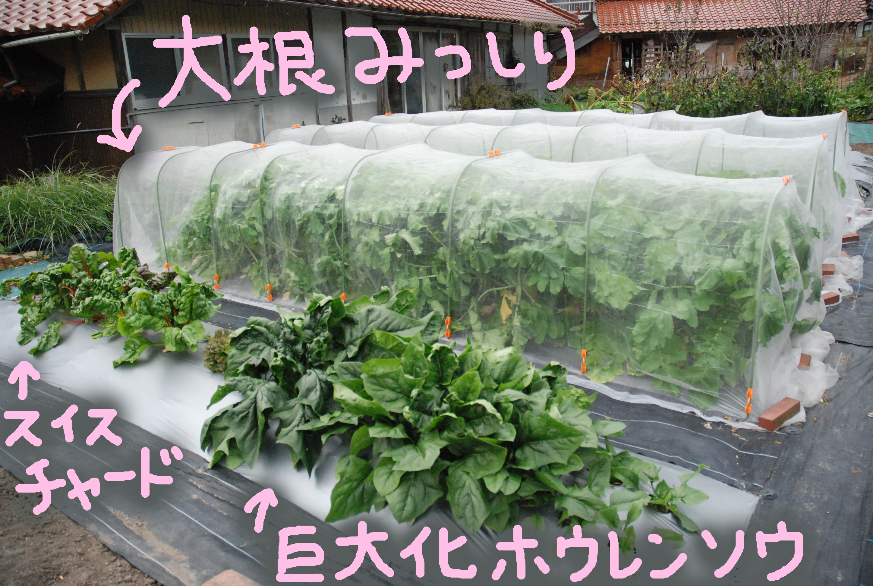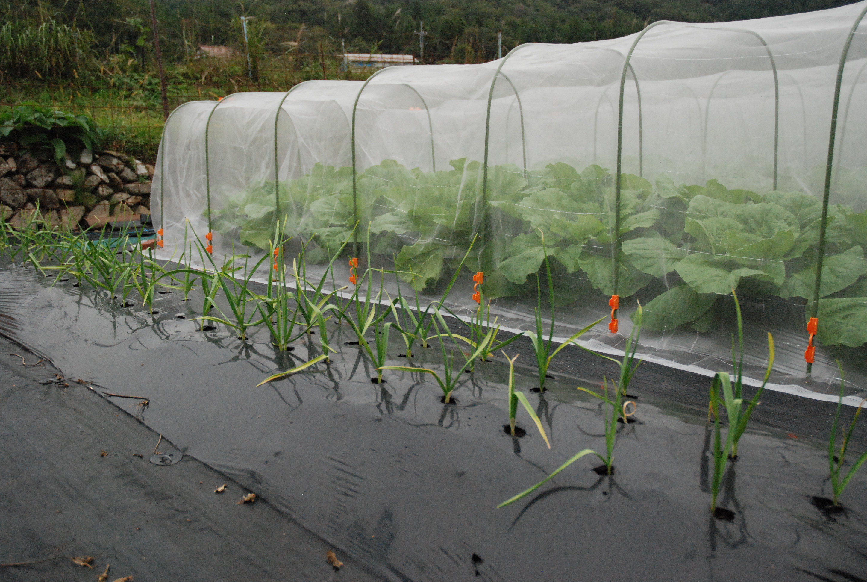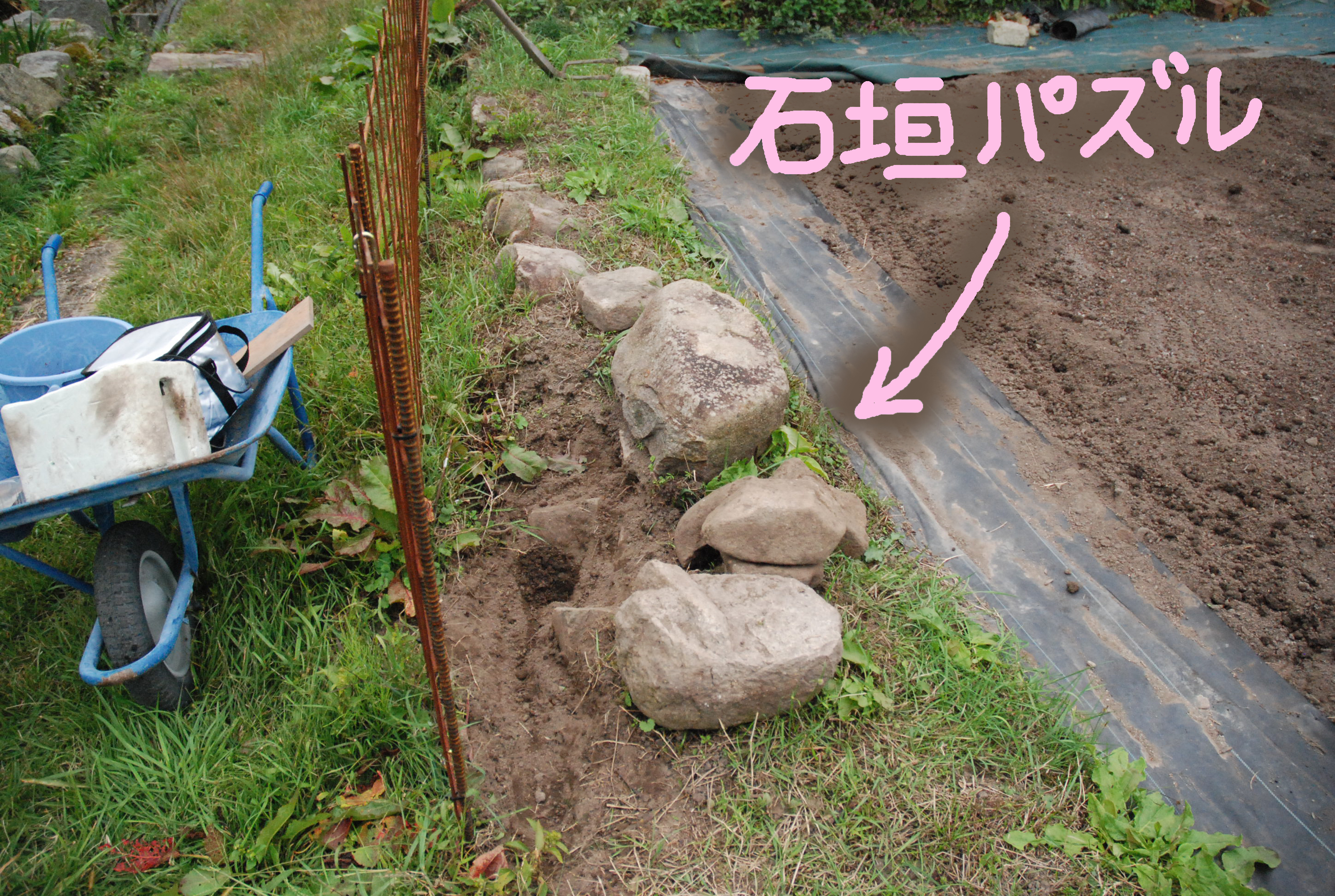 タマネギ植えた。白タマネギ400本,赤タマネギ50本。今年もまた植えすぎた~。大根と白菜は,防虫ネットの中で巨大化しています。親父が破壊した石垣を修復しようとするも,超難解立体パズルで,解けない!