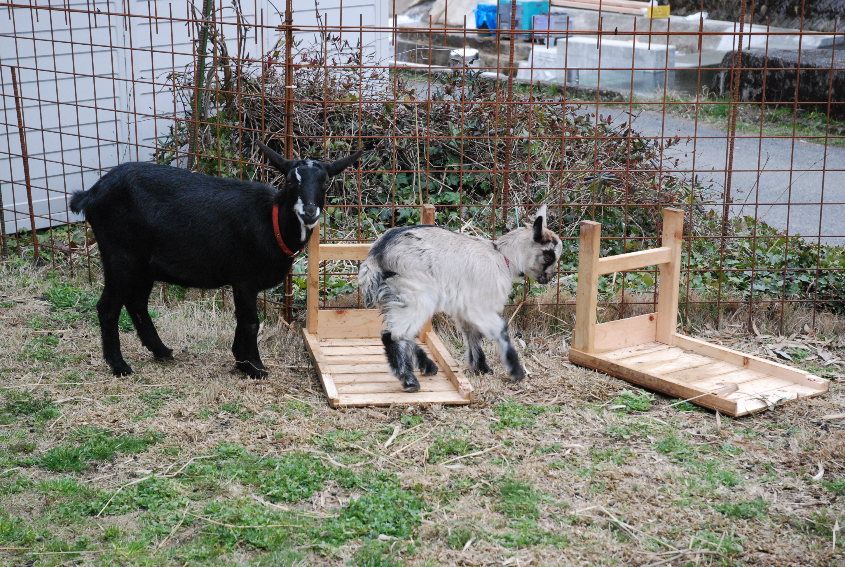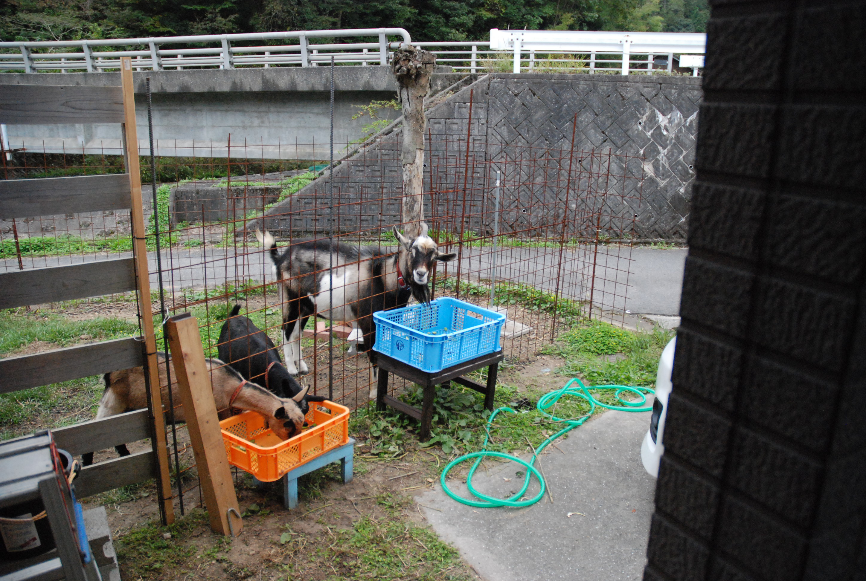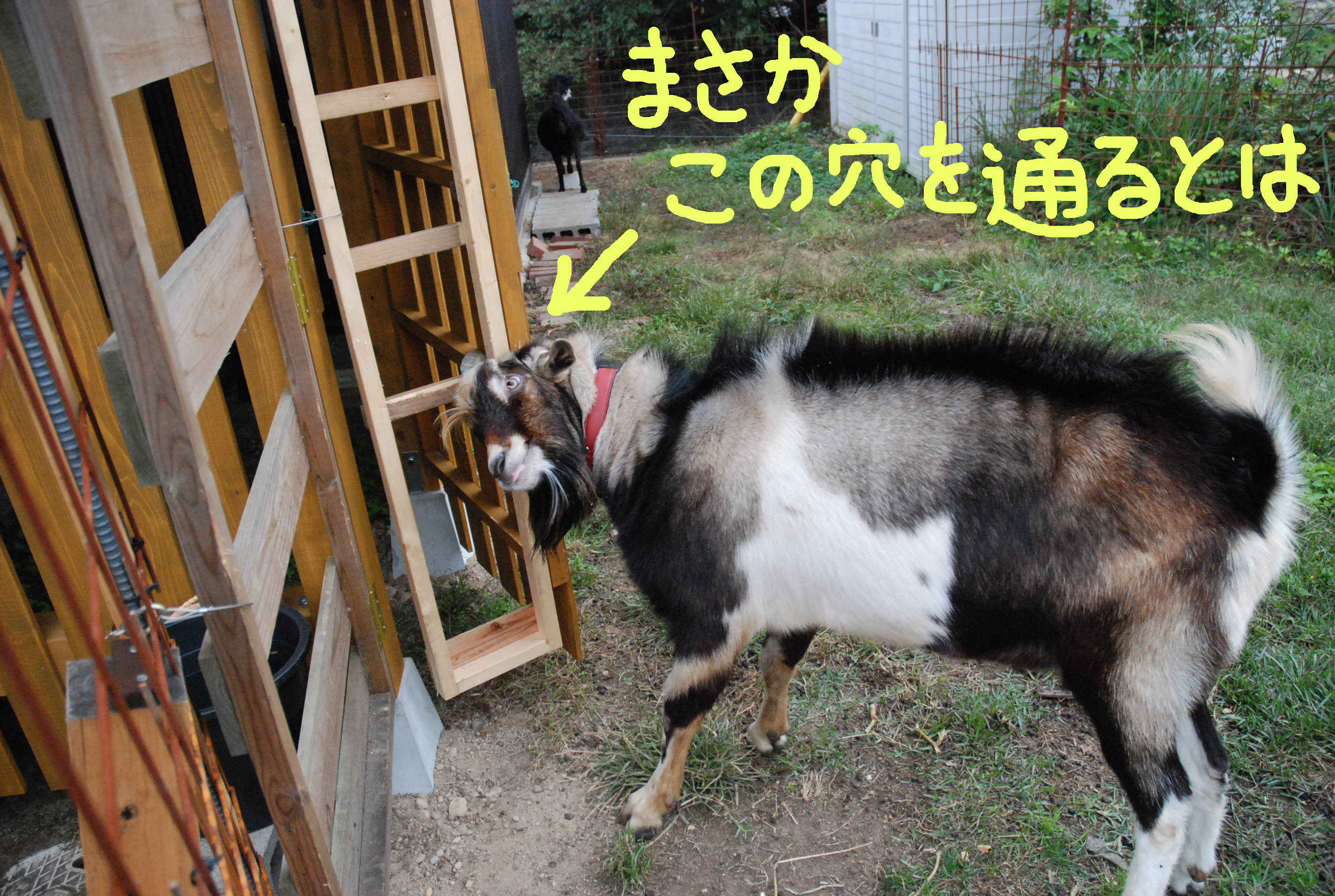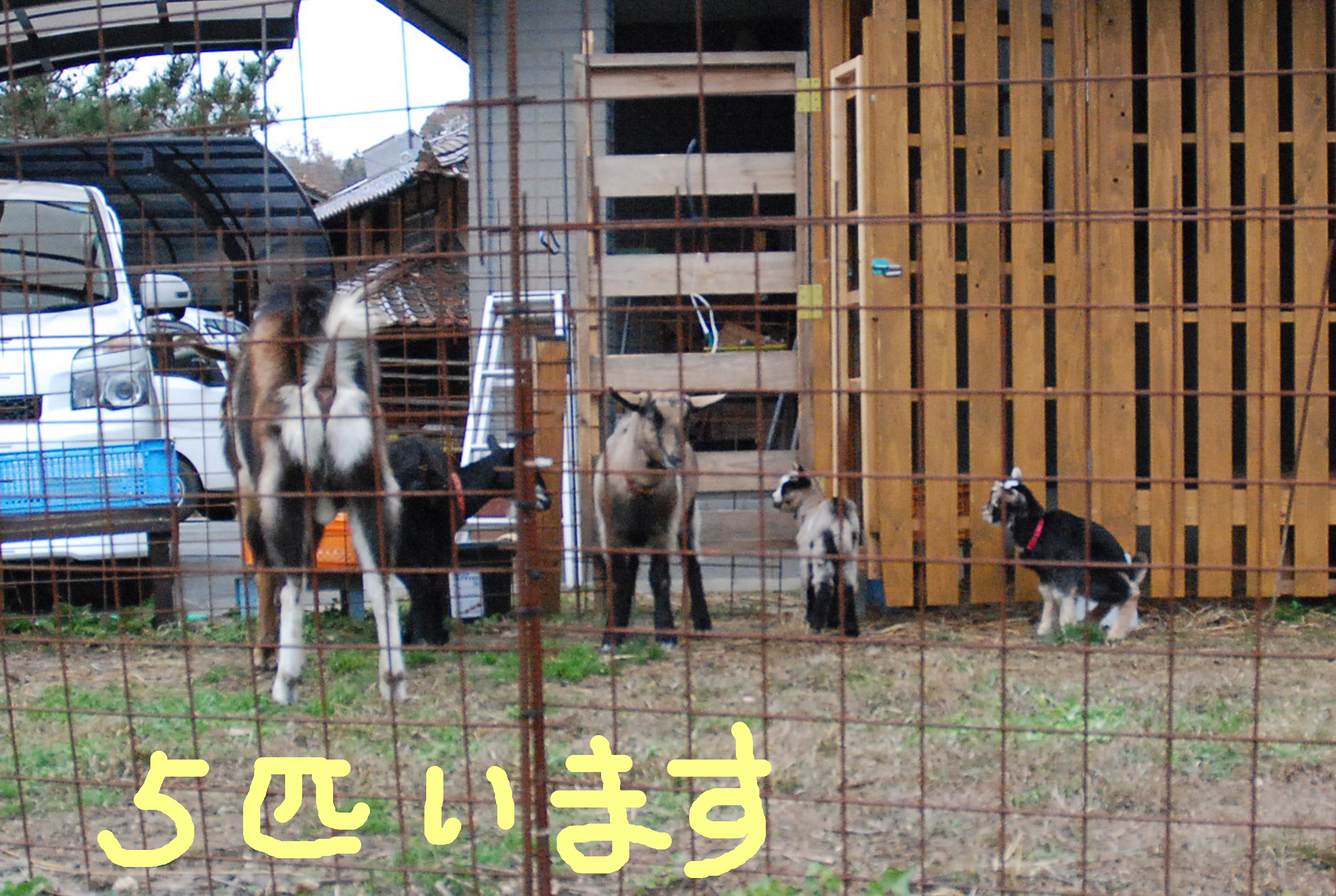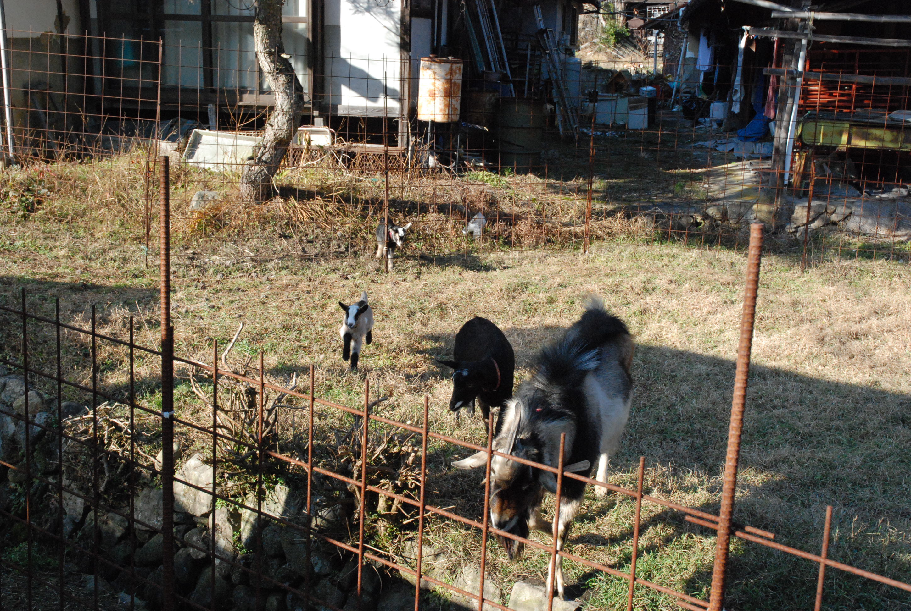 山羊ぅ一族全員が一度に脱走! 5匹を連れ戻すのは大変だった。大人山羊は人間に慣れているし,配合飼料で釣って確保したが、チビたちはパニックになって逃げ惑う。結束バンドを喰いちぎる山羊の歯の強さ!