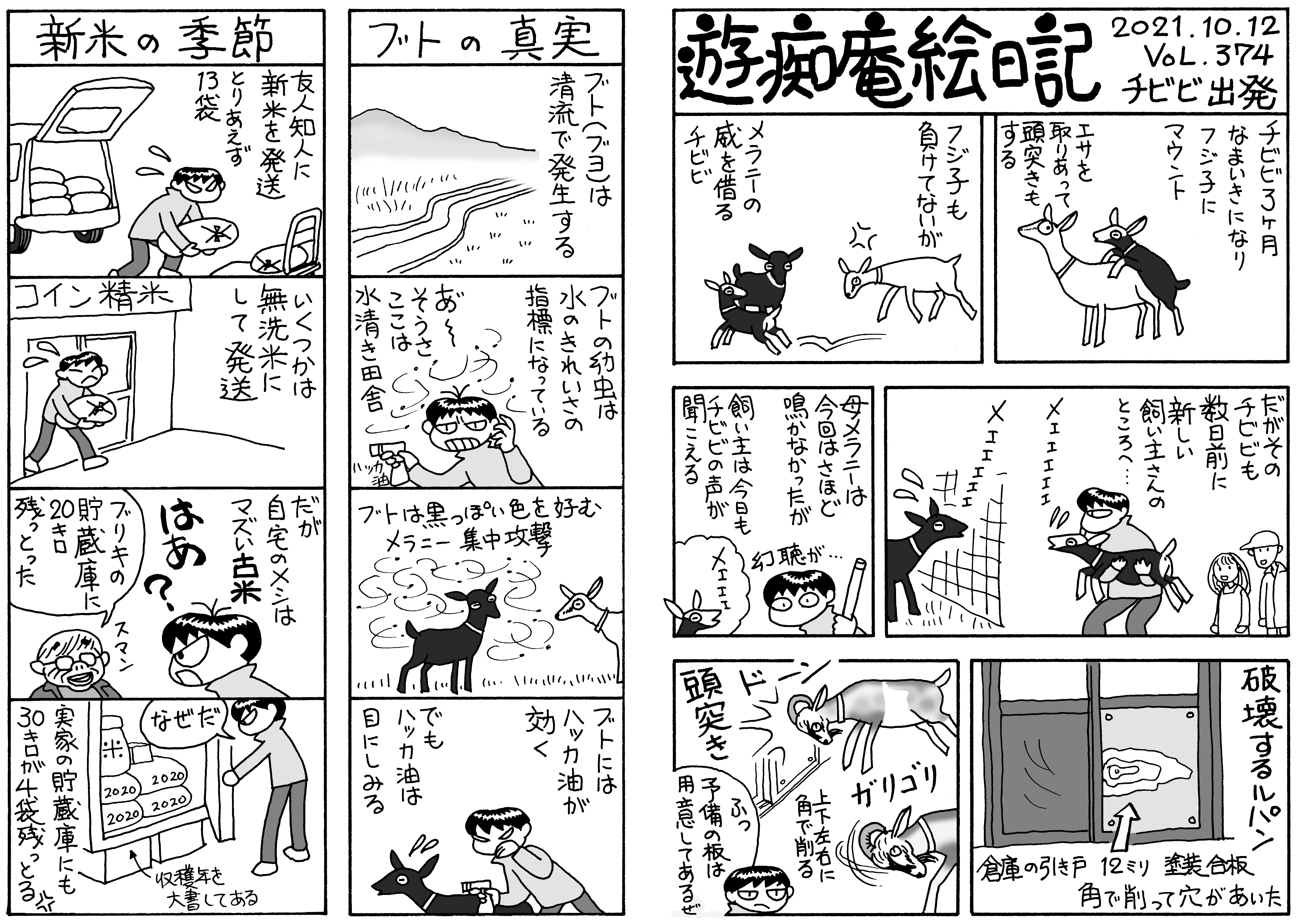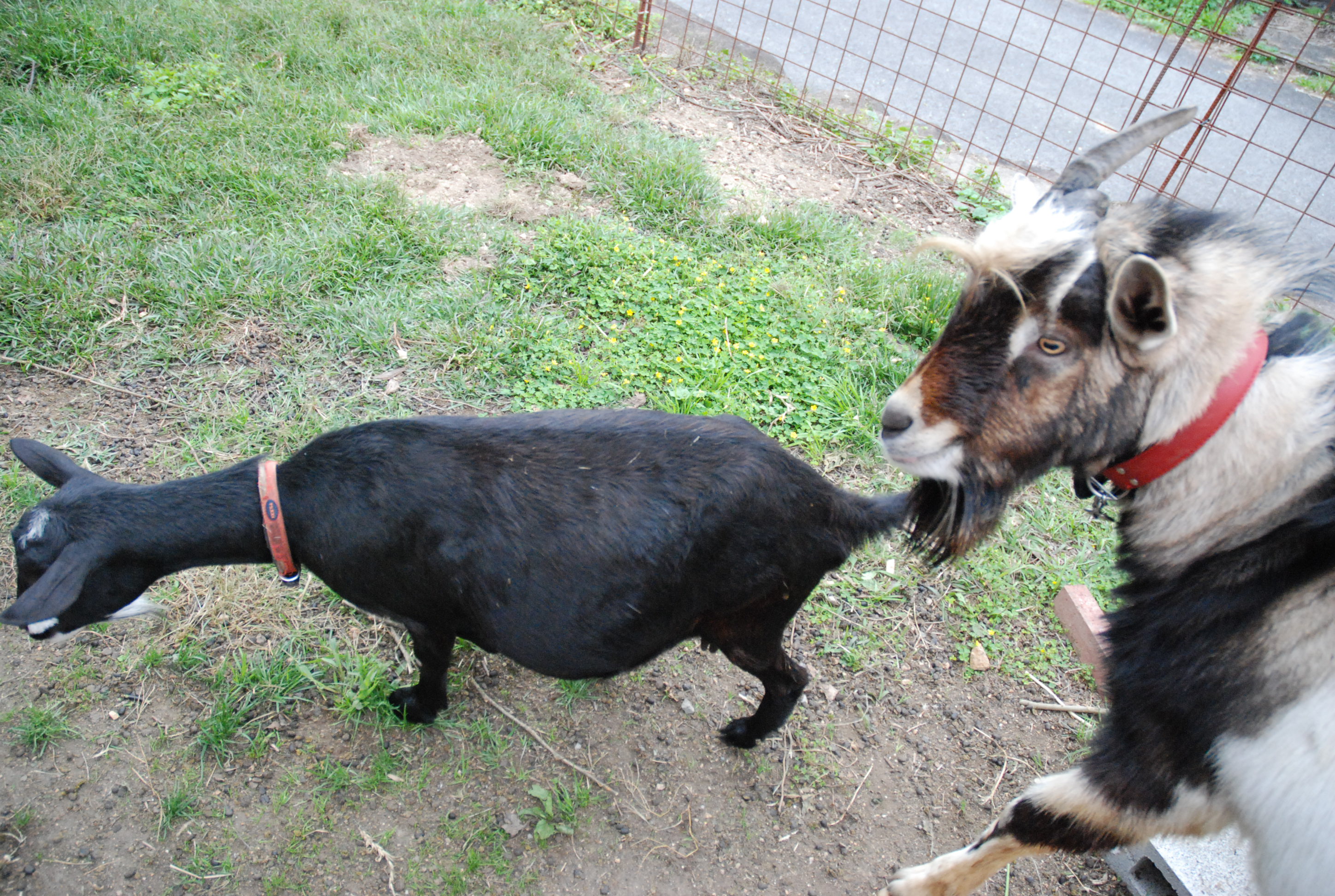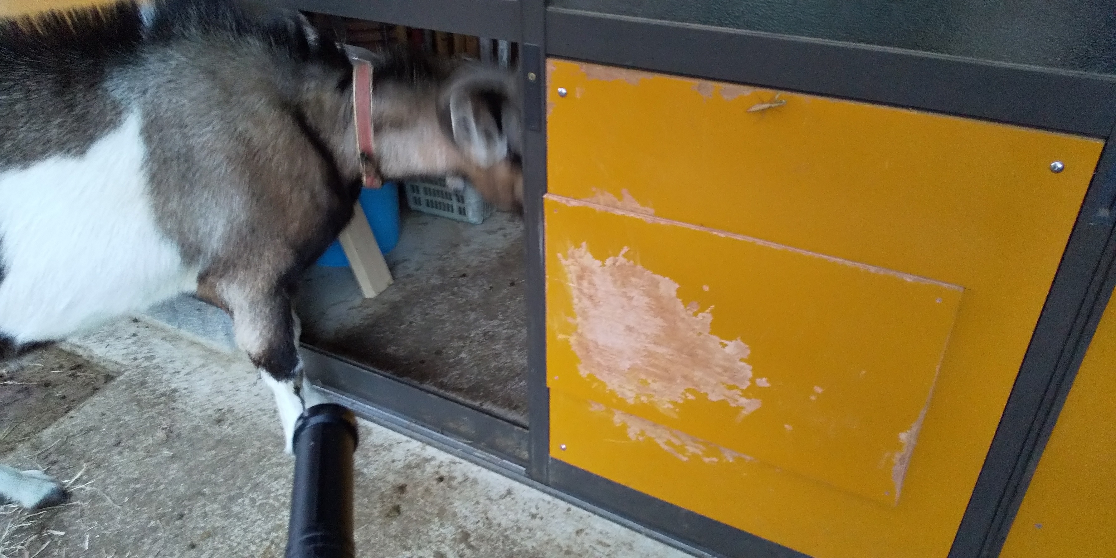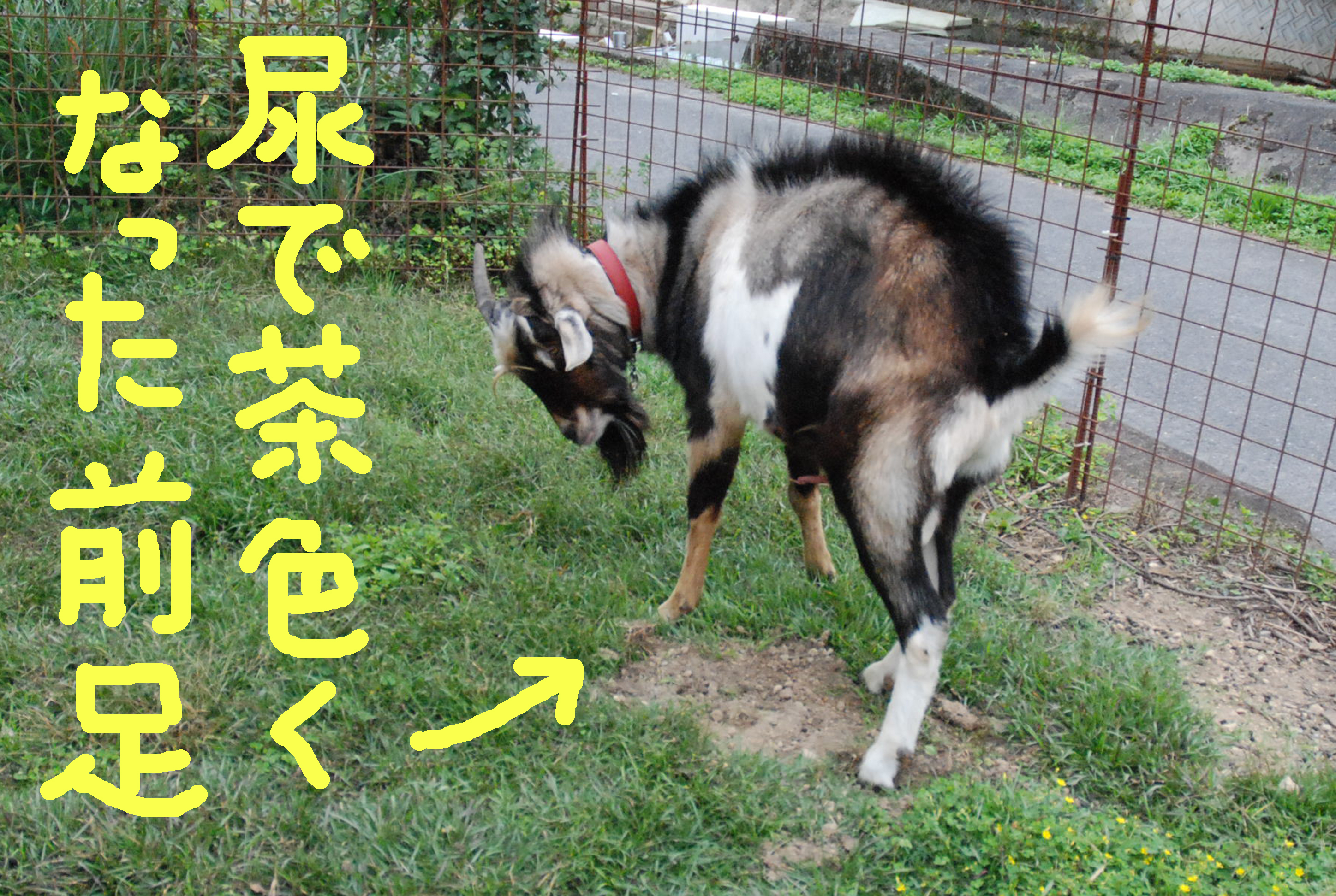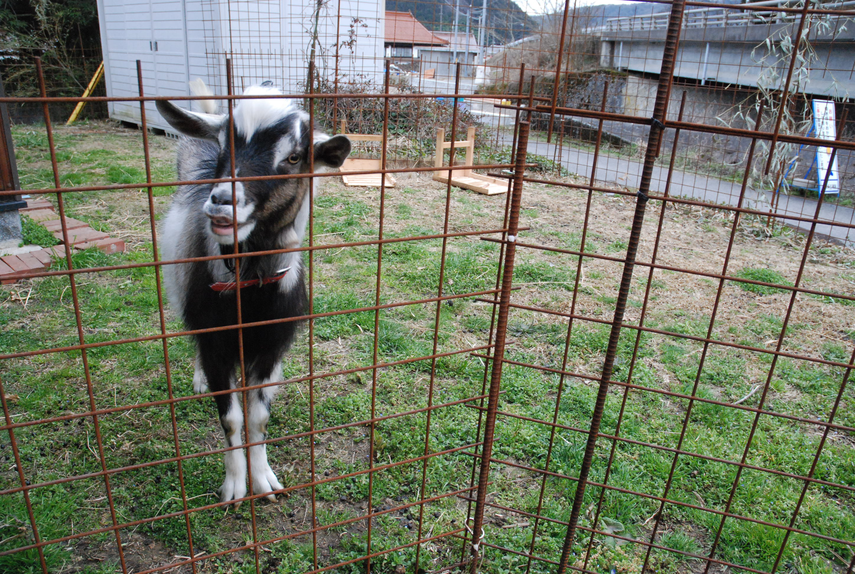 山羊ぅ一族全員が一度に脱走! 5匹を連れ戻すのは大変だった。大人山羊は人間に慣れているし,配合飼料で釣って確保したが、チビたちはパニックになって逃げ惑う。結束バンドを喰いちぎる山羊の歯の強さ!