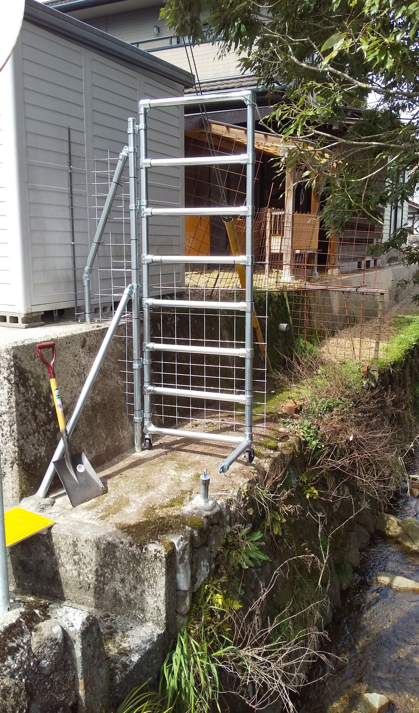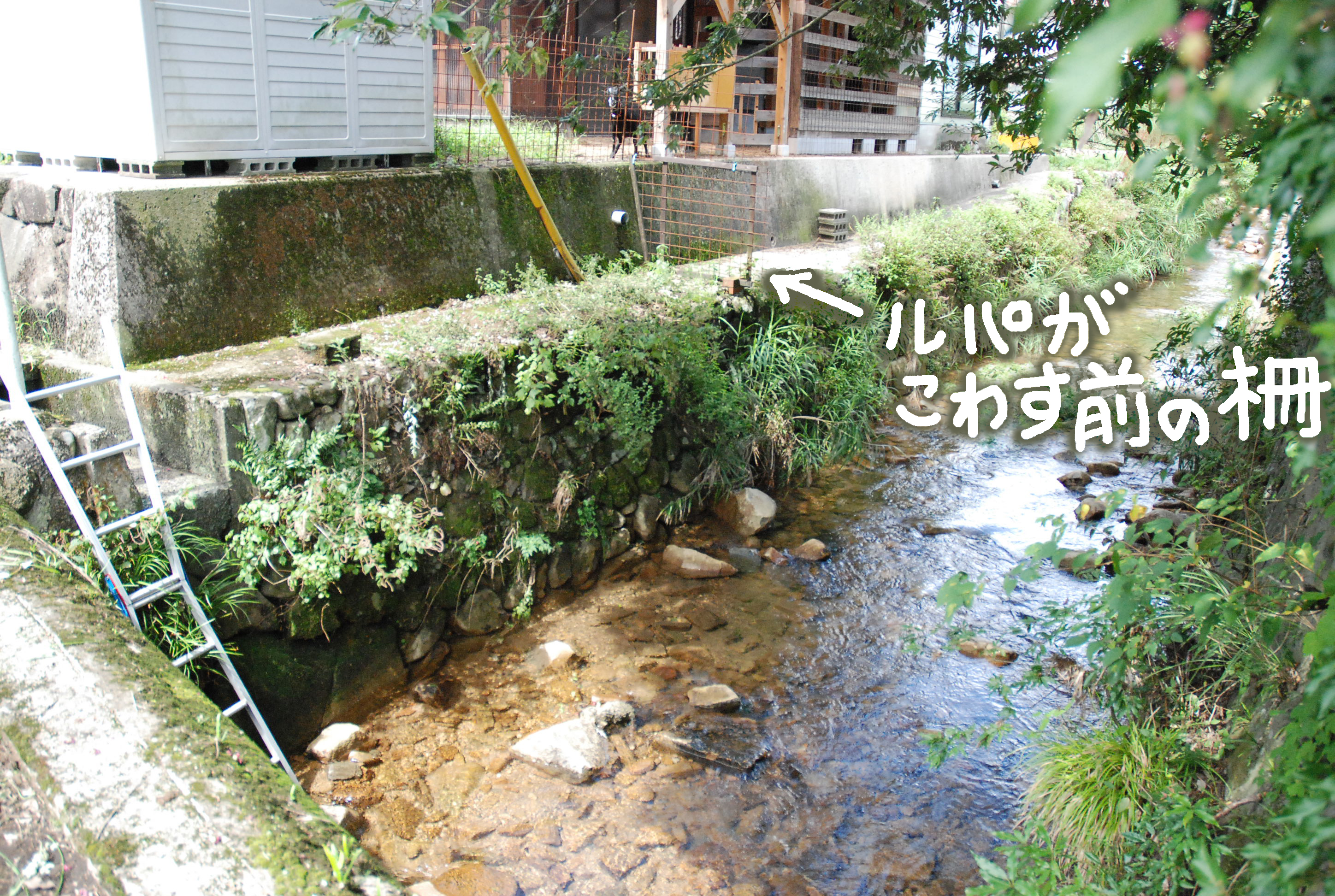 石垣の内側が空洞になっていた! 川に下りて写真を撮っていたらルパンが「ボクもそこへ行きたい」と柵を破壊。写真①ルパンが壊す前の柵,②壊している最中の柵。役場に言ったけど崩れないと修理は無理と。