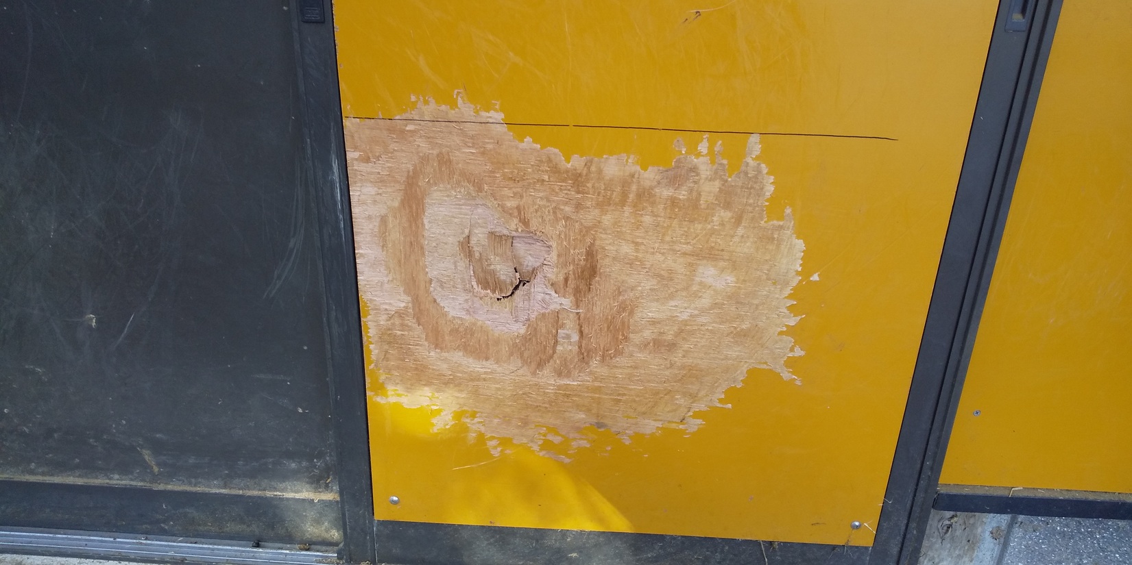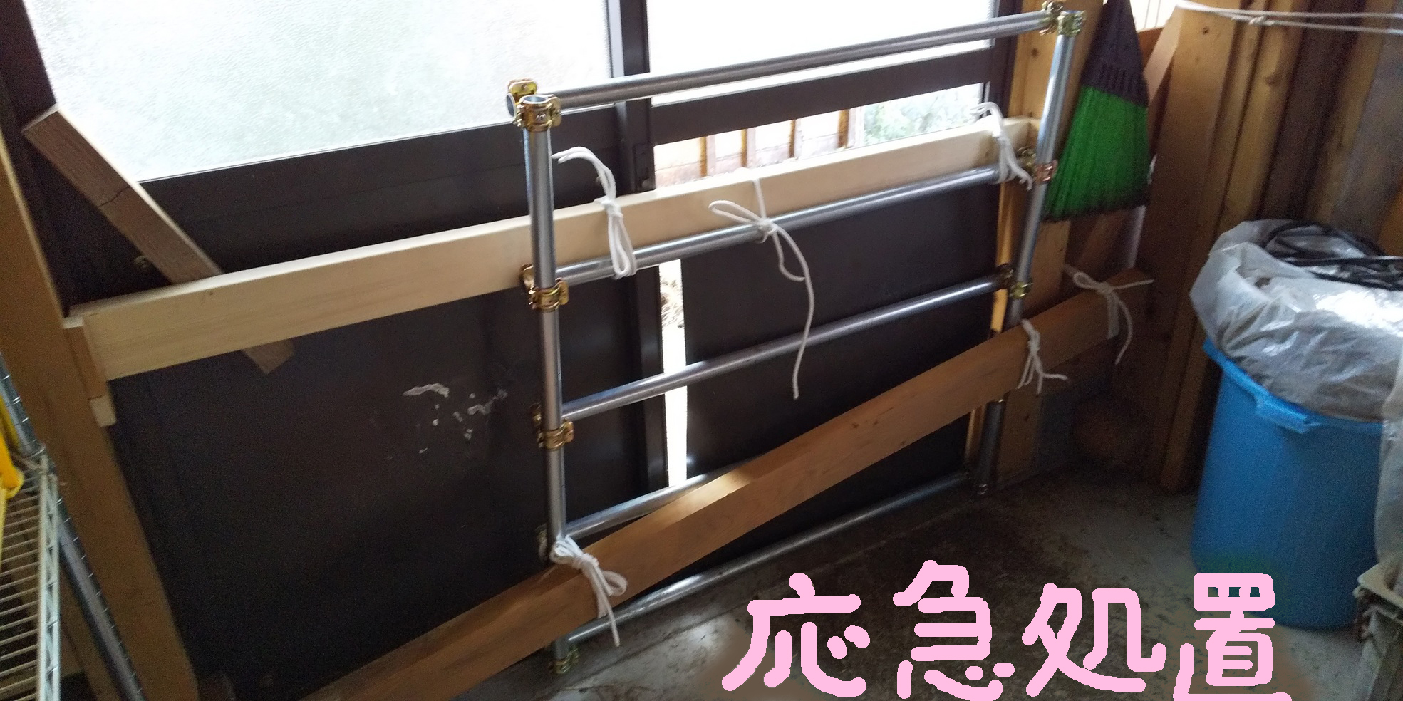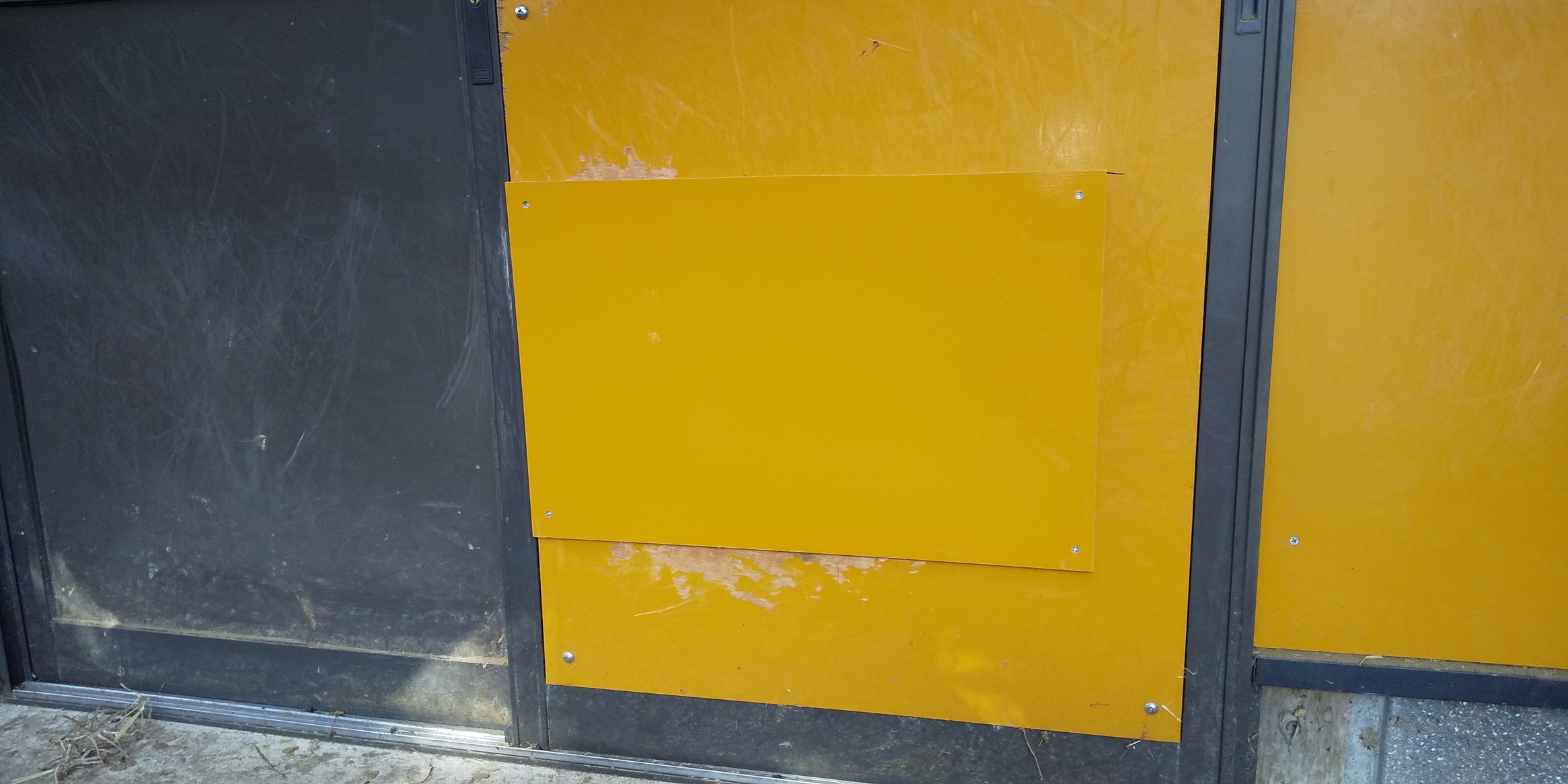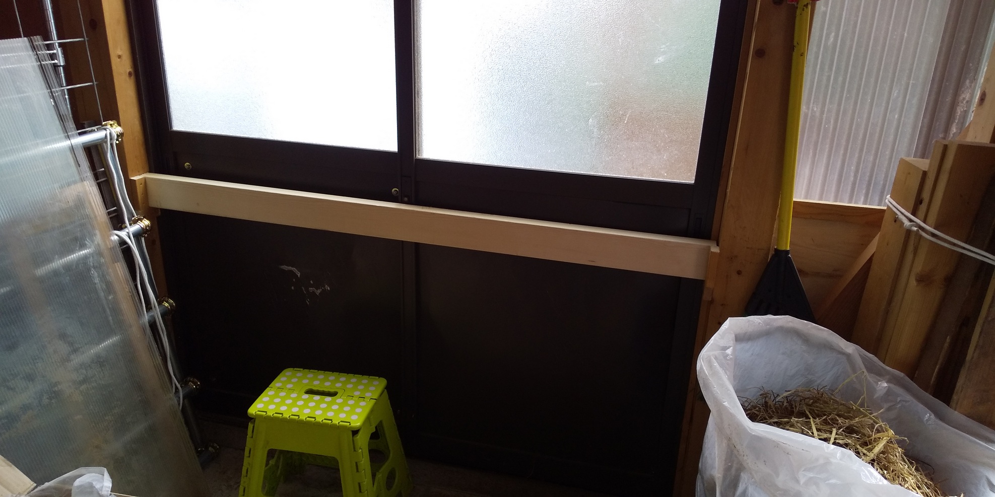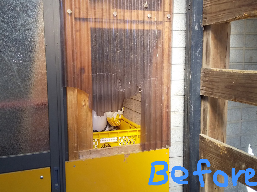 サッシ屋さんが引き戸の金属板を新しいものに交換してくれました。間髪いれず頭突き破壊防止の合板を設置するも,次はまたポリカ波板に穴が! 広がらないうちに修理💦