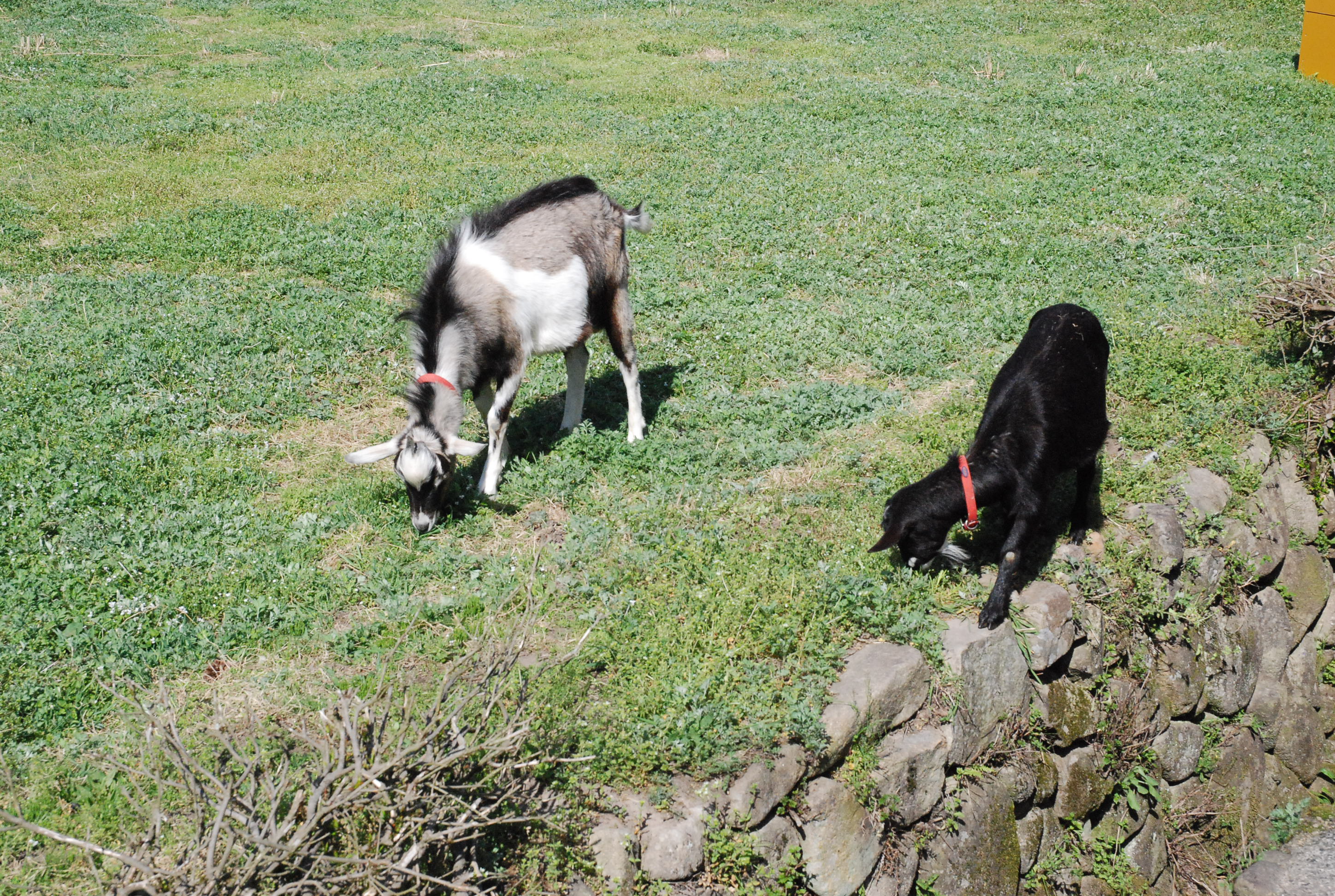 冬の山羊は石垣に並んで日向ぼっこ。石垣イチゴのように太陽熱を吸収した石垣が暖かく且つ風を防いで心地よいのでしょう。しかし!冬場は山羊たちの食料が雪の下💦 乾草購入代金がハンパなく高くて大変💦