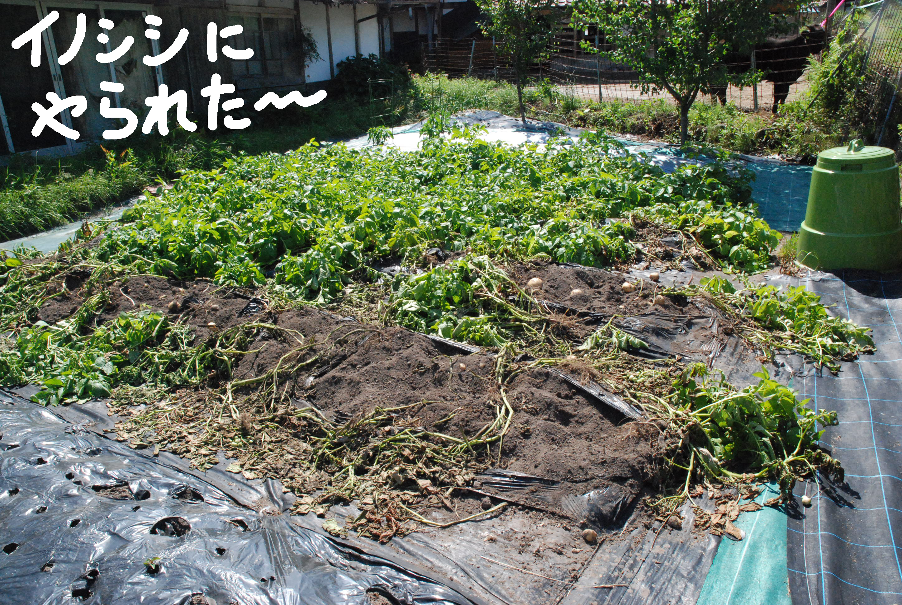 イノシシがジャガイモ畑をぐちゃぐちゃに荒らしてくれました( ノД`)。キュウリも地際に生っているのを食い散らかす動物がいて,これは野ウサギかヌートリア? ネコに頑張って狩ってもらいたいが…無理か。