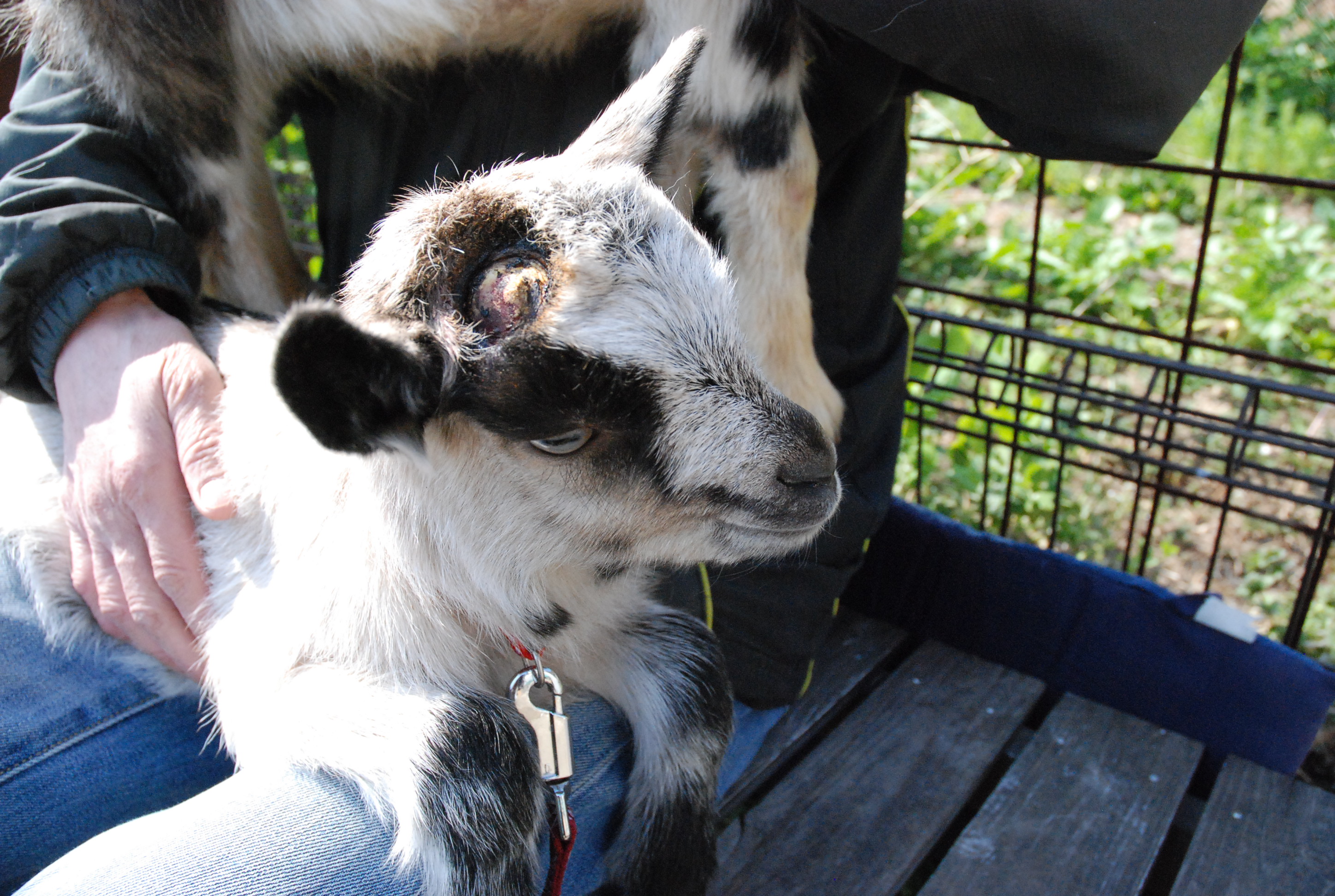 チビビが行方不明! 山羊舎内にも放牧地にも見当たりません。母メラニーは半狂乱。私も必死で捜しましたが見つからず…。メラニーがずっと覗いていた溝に転落していました。ケガもなく元気です。(´Д`)≡3