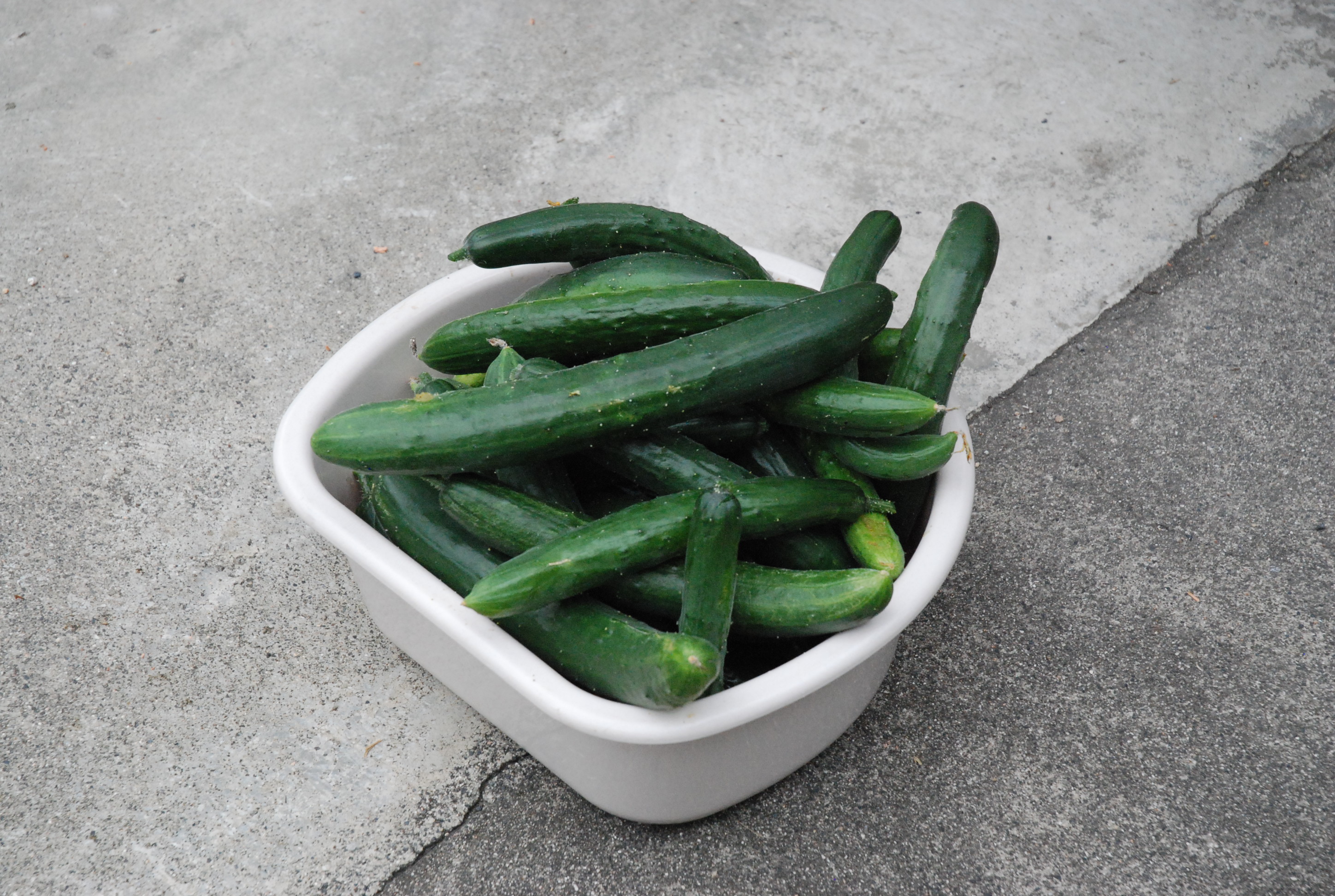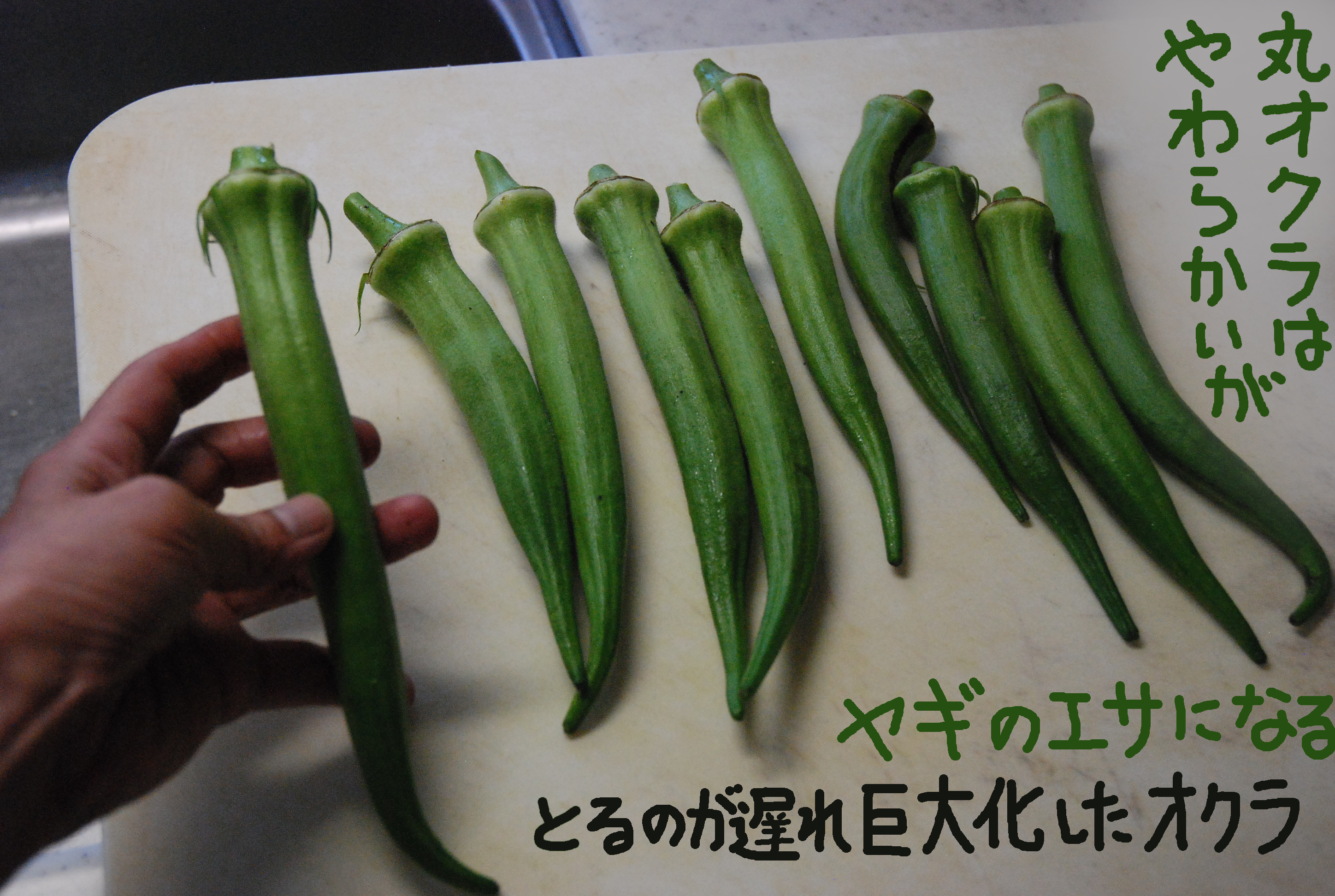 キュウリが毎日20本以上採れます。冷蔵庫の野菜室は夏野菜で満杯。キュウリは刻んで山羊のエサになっています。オクラも山羊エサです。