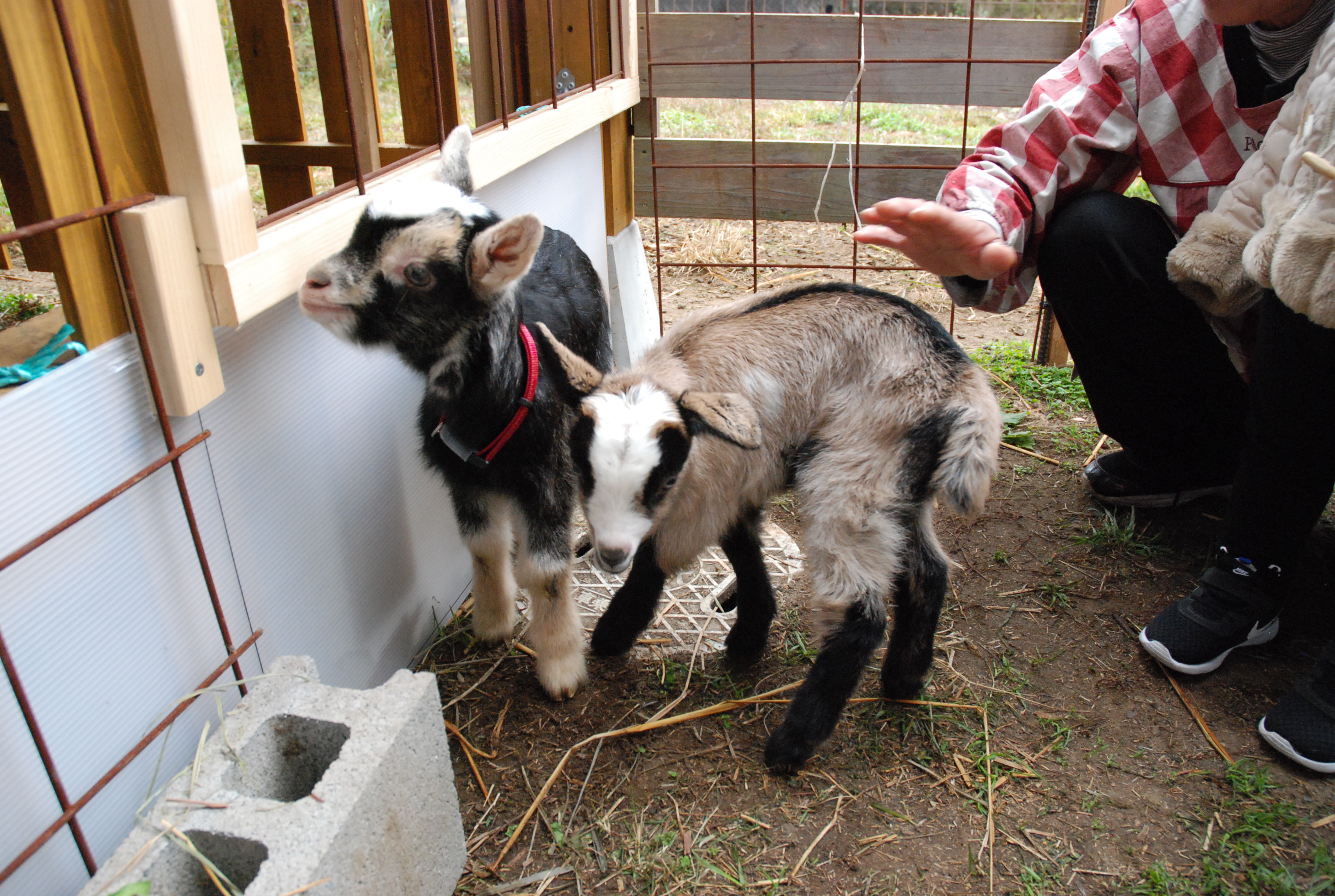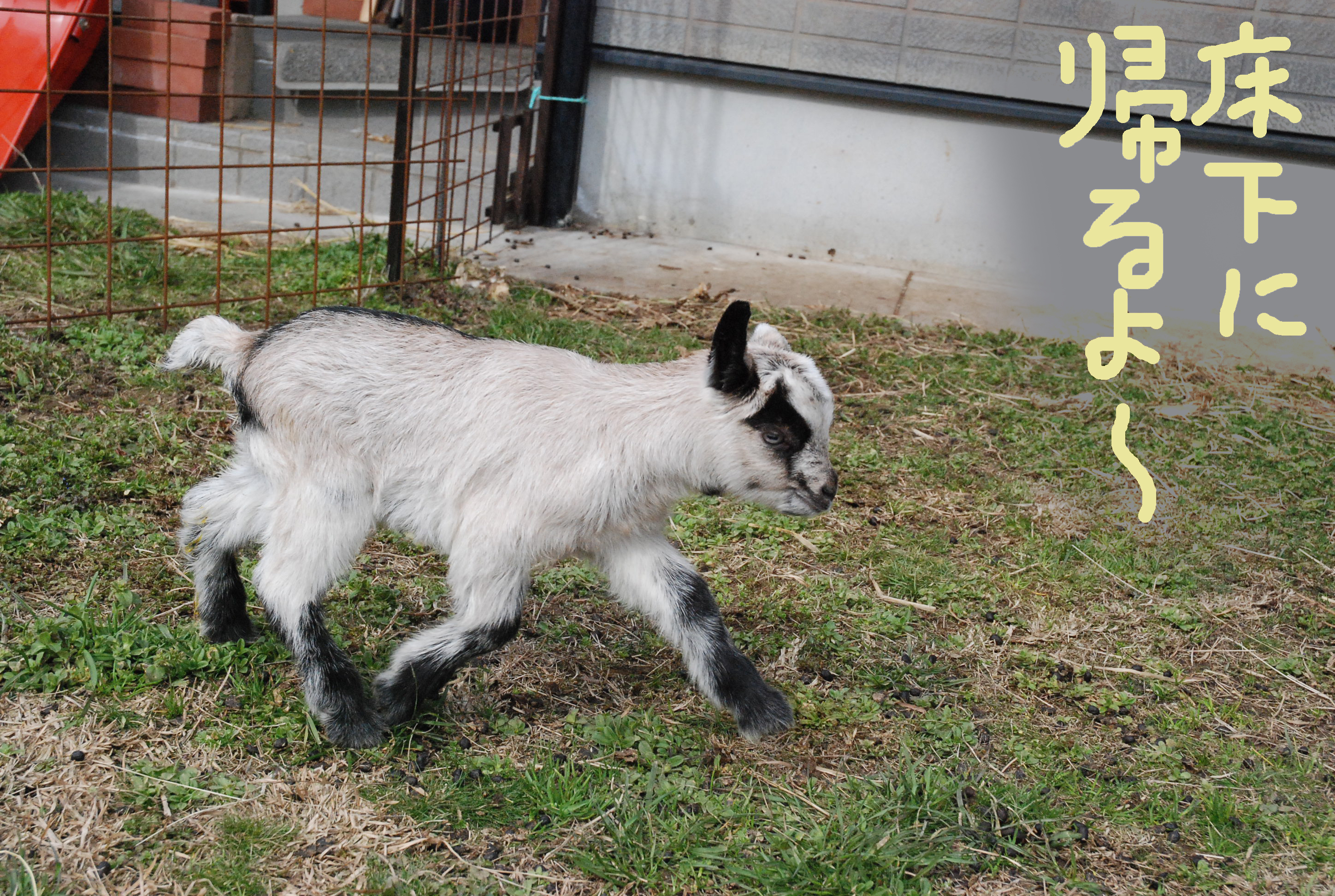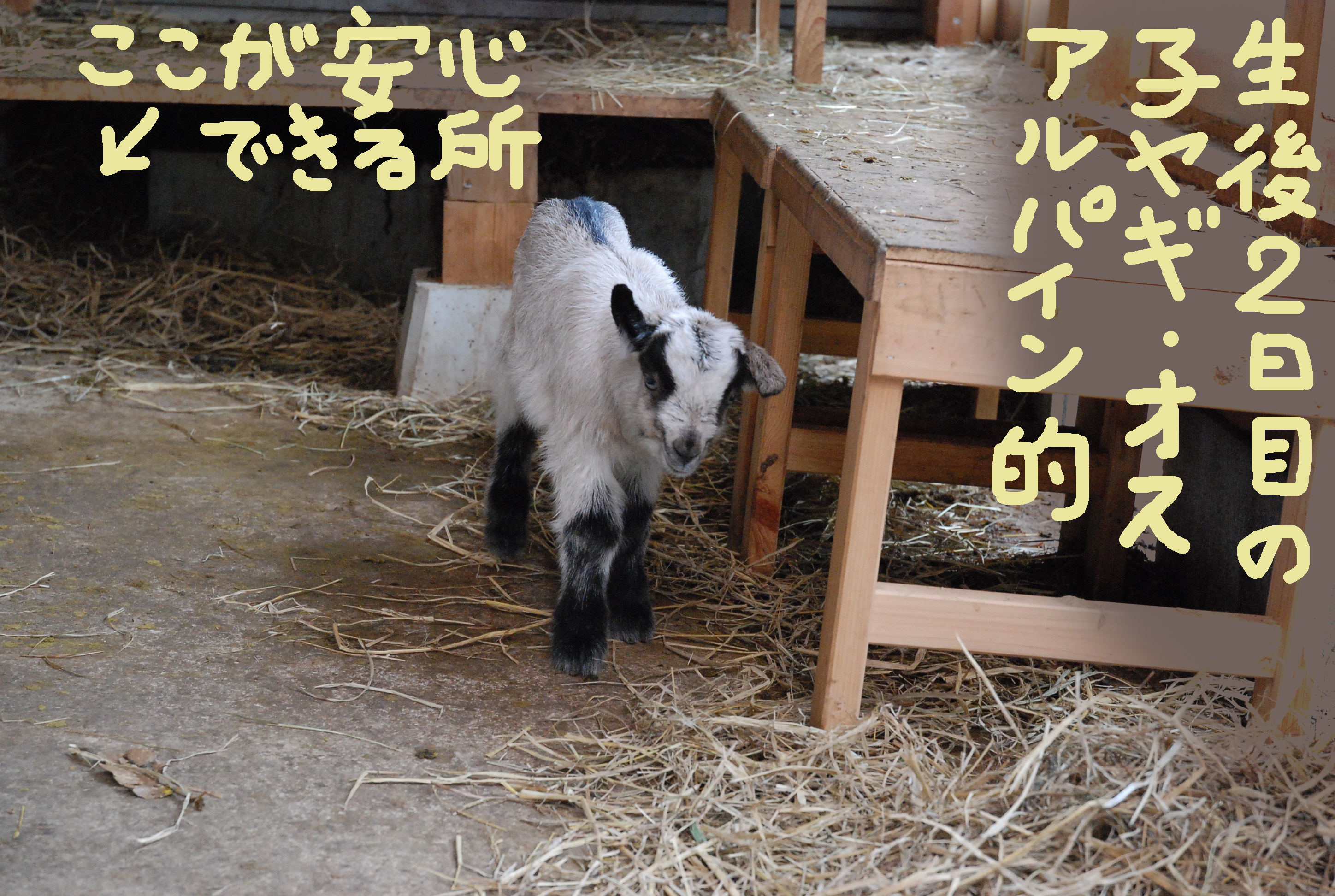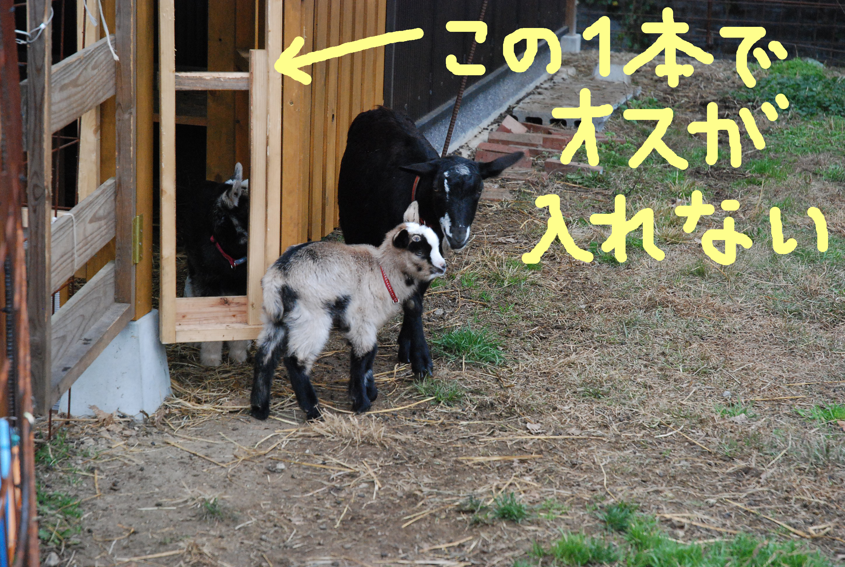 母ヤギと子ヤギ,1週間は産室内でしたが,ついに外に出して運動場デビュー。ルパンは子ヤギを相手にせず,ミル坊が張り合う。写真①運動場の山羊一家。②マロンとタビー,③産室入り口,④可愛い子ヤギ♥。
