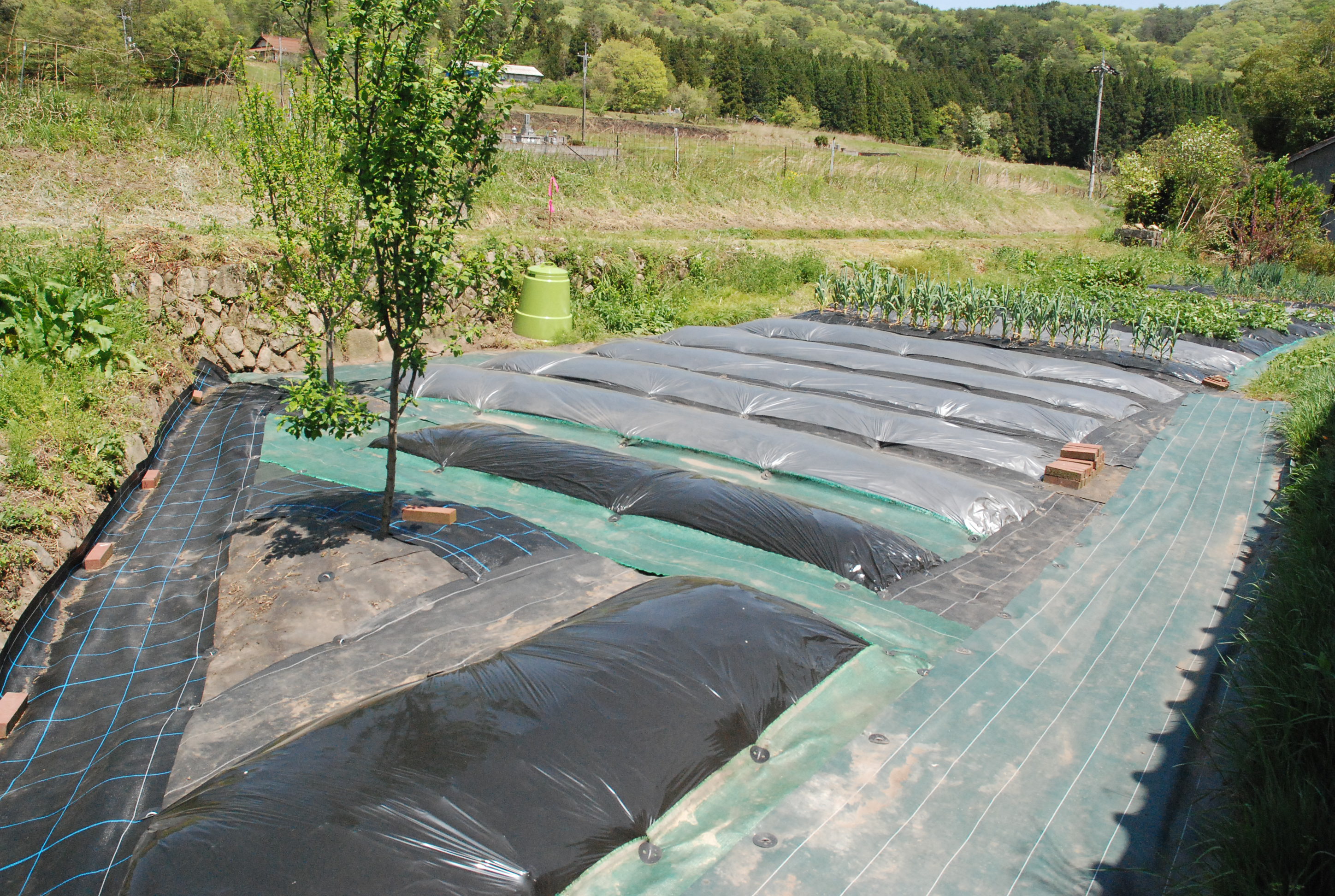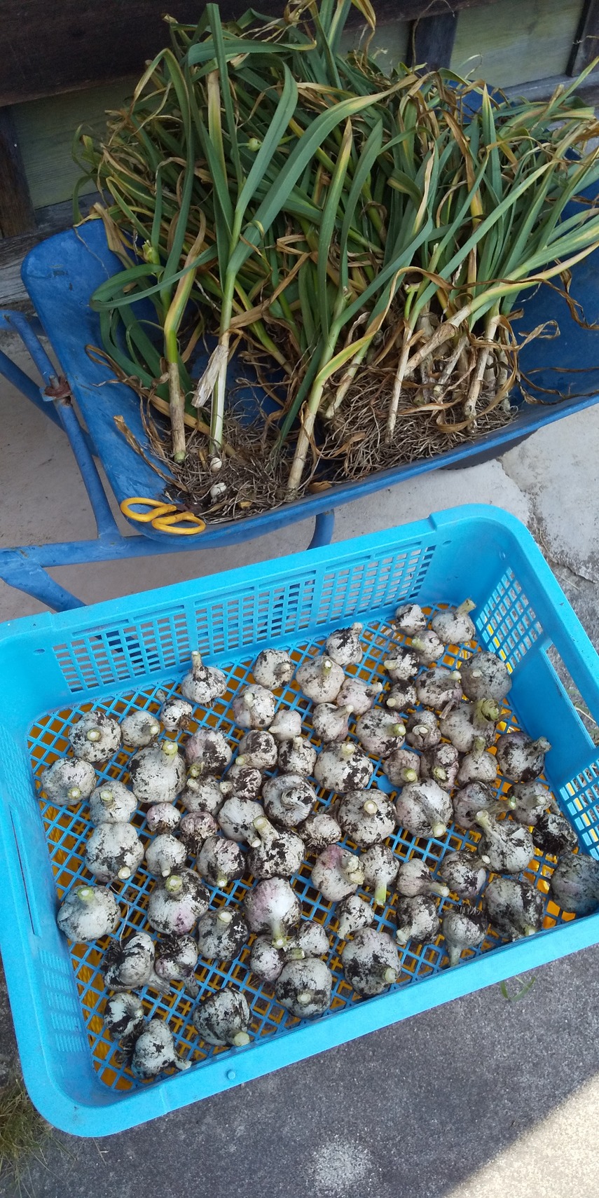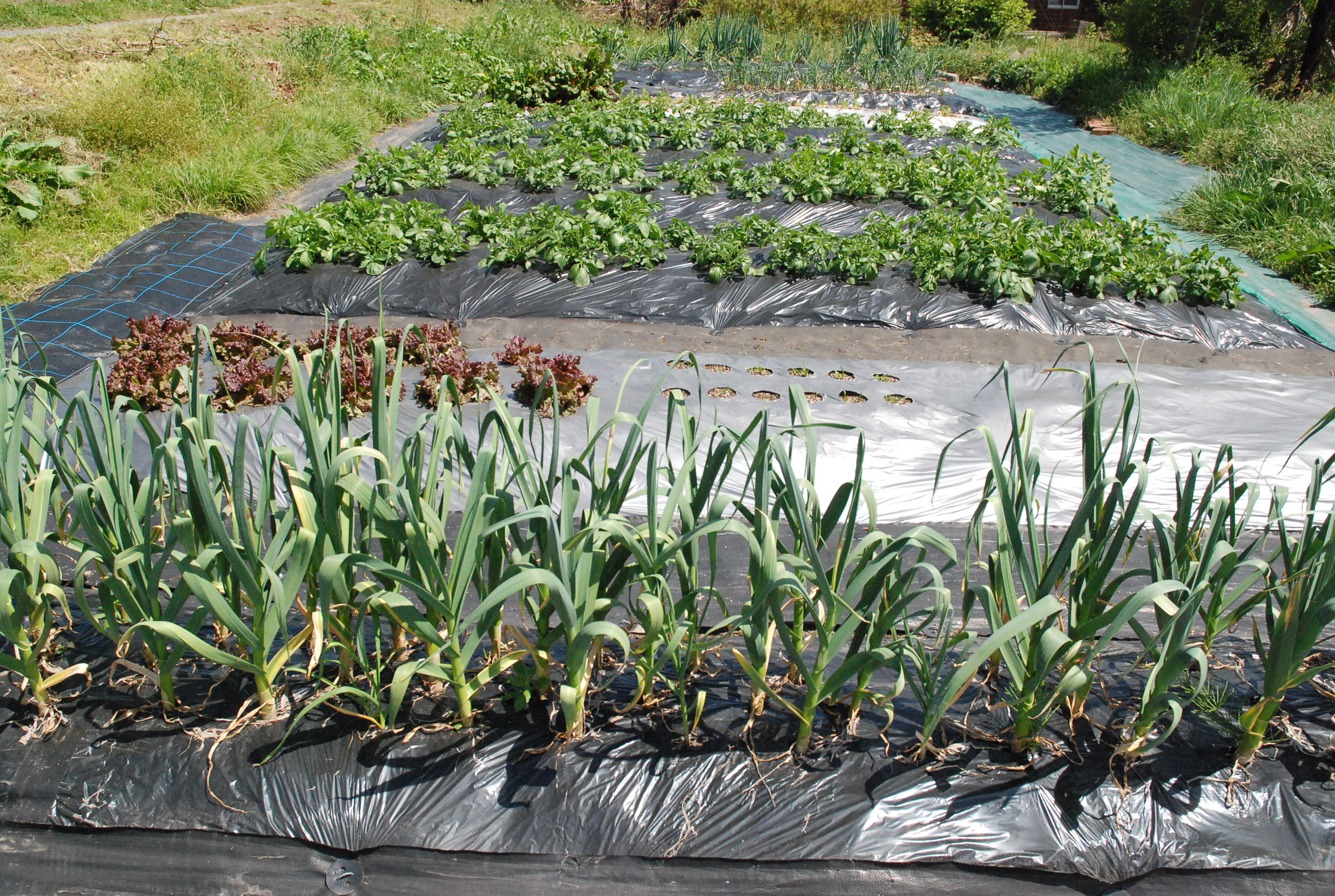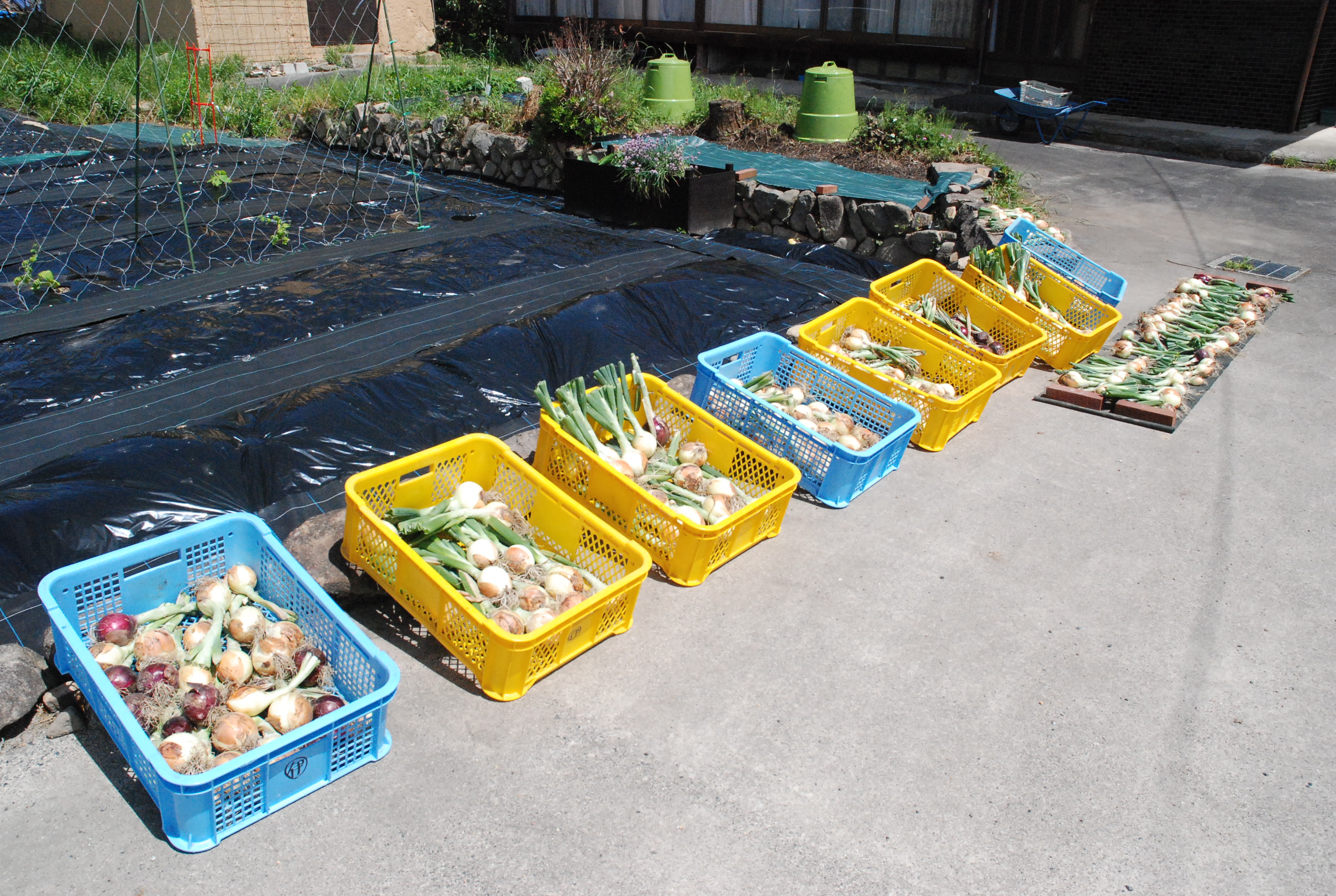 山羊たちは放牧地で青草を食べ,日陰でまったり反芻しています。夏場は乾草の消費が減ります。太陽光線が凶暴すぎて日中畑に出る気がしません。それでも夏野菜をいろいろ定植し,ニンニクを収穫しました。