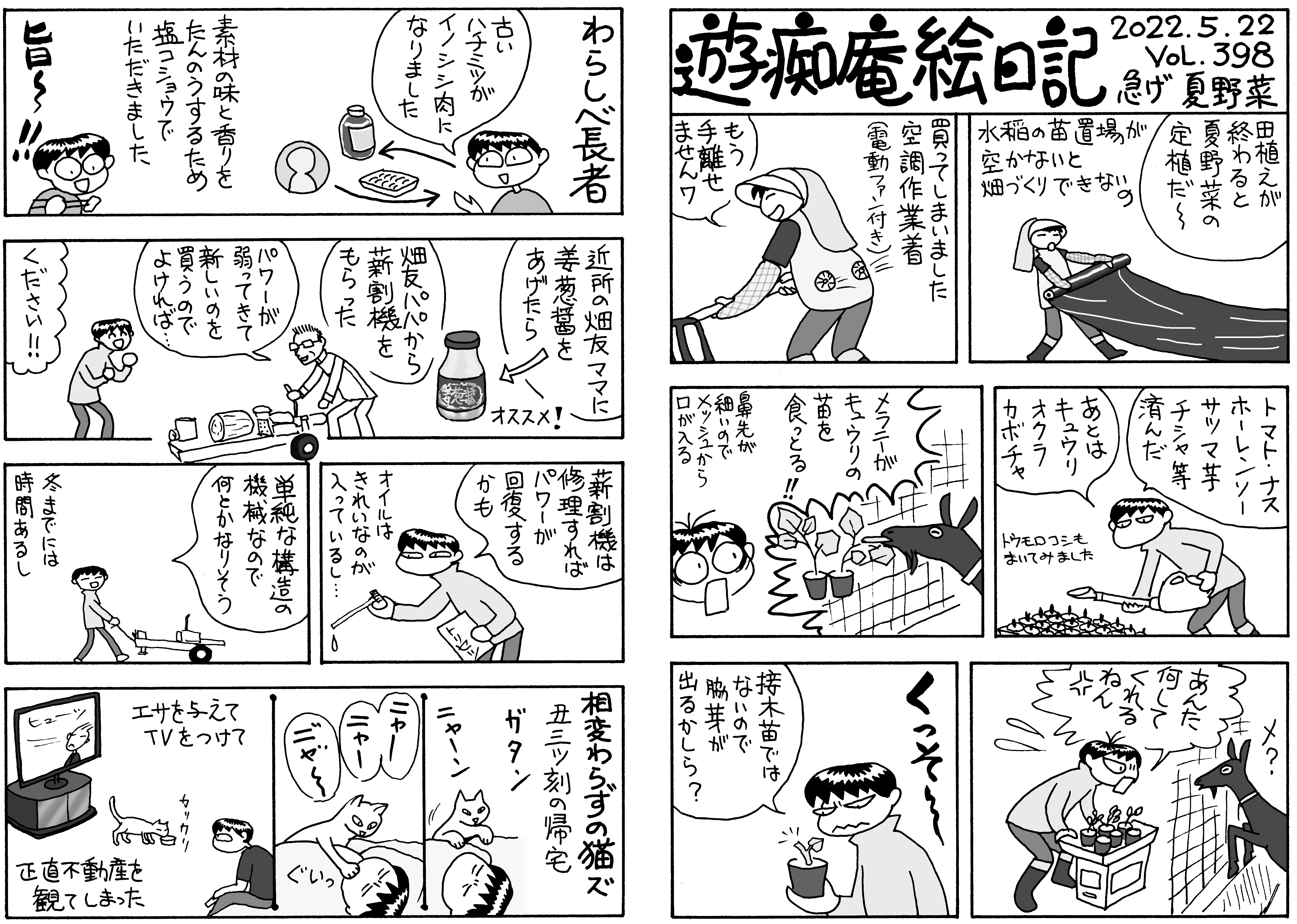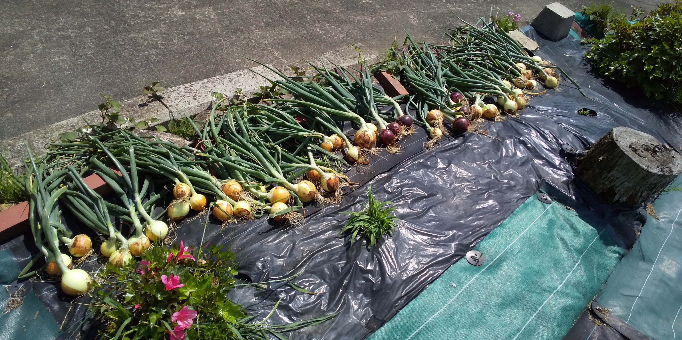 5月なのに猛暑日! でも梅雨前にやることが沢山。熱中症の危険を感じながら苗を植え,タマネギ,ニンニクを収穫。開拓作業にはビーチパラソルが必須。畑は毎日こまめに見に行かないと大変なことに(-"-)。