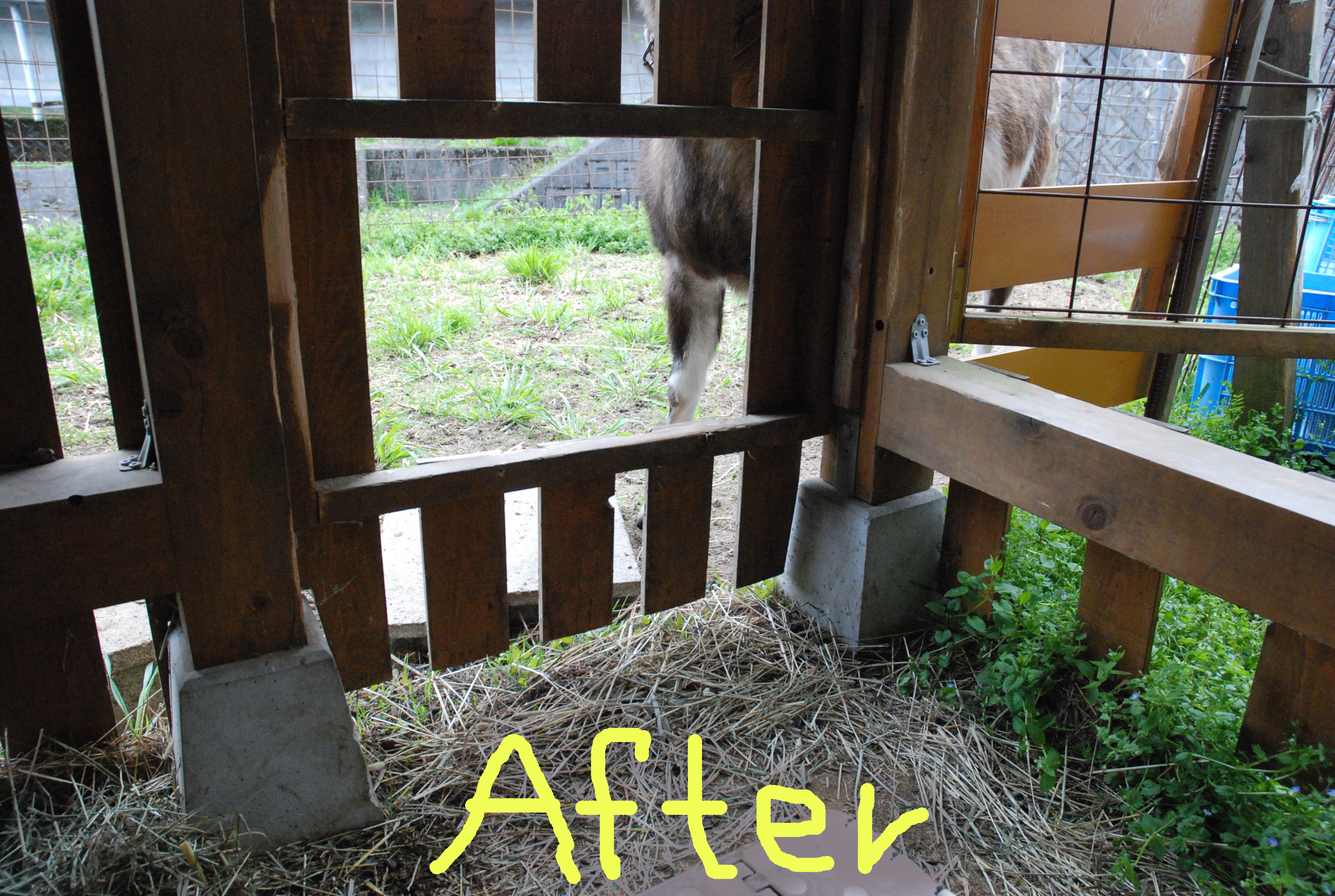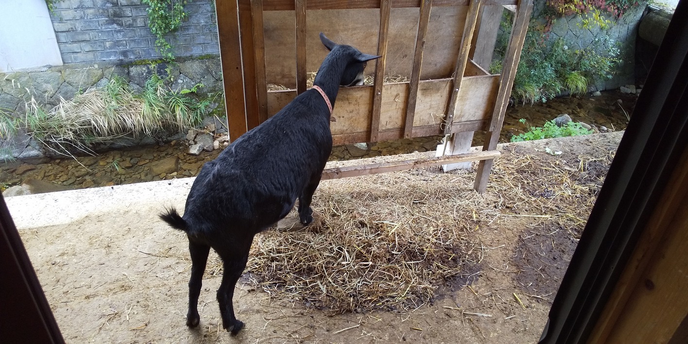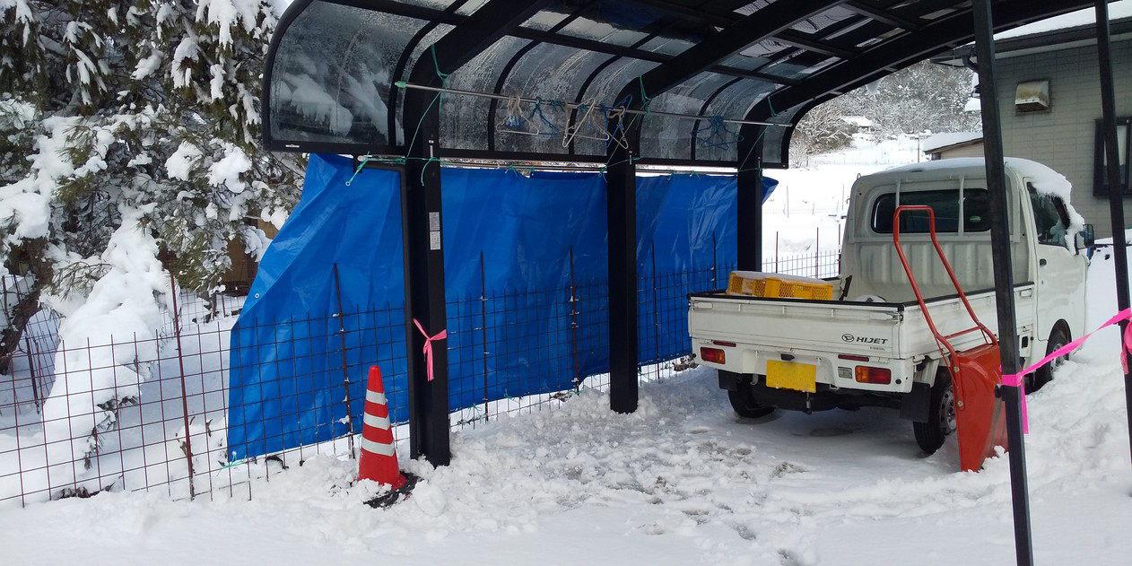 広島県も山間部は島根に近く日本海気候です。冬場の降水量が多く湿度が高いので山羊舎内も乾きません。濡れたコンクリ床に落ちた糞を踏みつけるので,掃除には角スコが必要です。ポリカ板で防風防雪します。