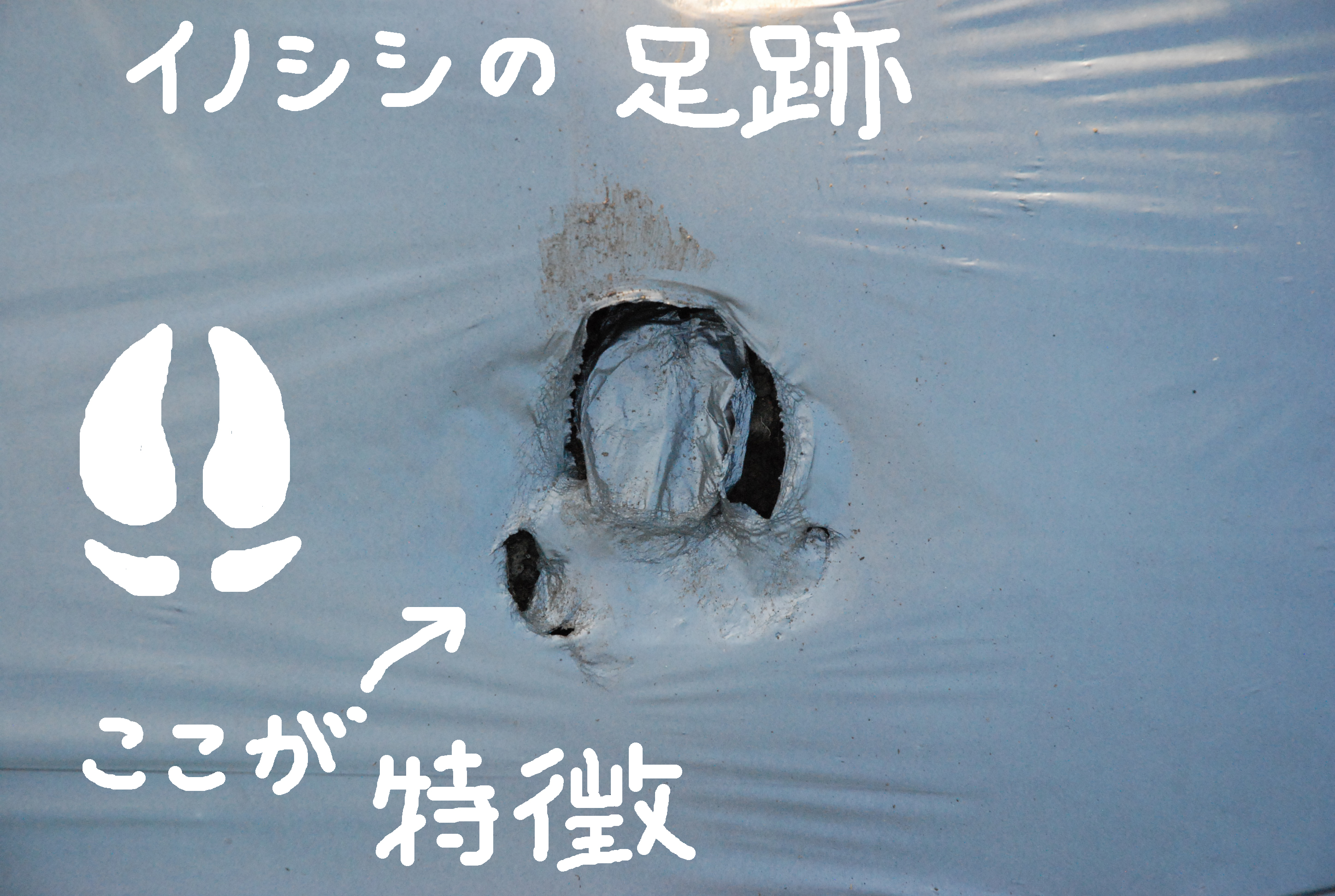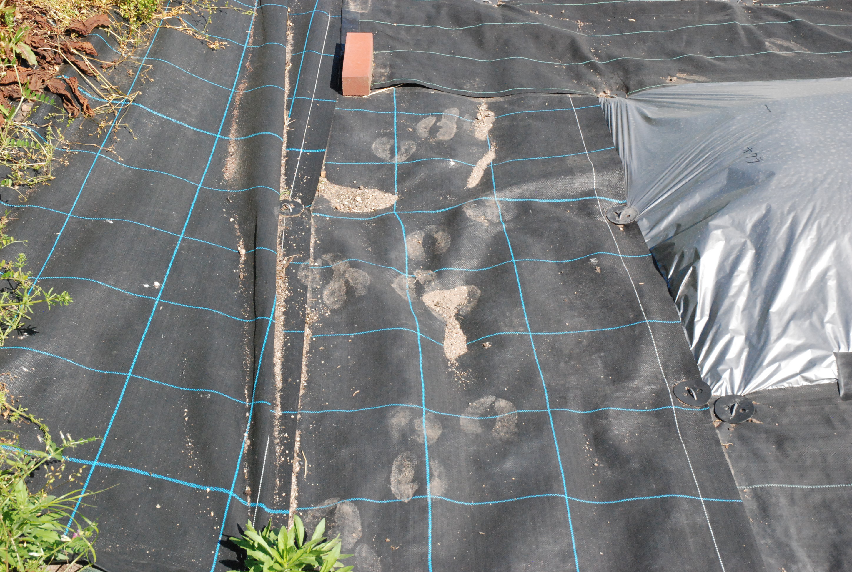 猪鹿蝶は農民の敵。ついに鹿が現れたか。畑の中を歩いてマルチが穴だらけ。防草シートに足跡が。近所では田んぼに入って若い稲を食い荒らすらしい。しかし,鹿にしては足跡が大きい。犯人は親父の牛でした。
