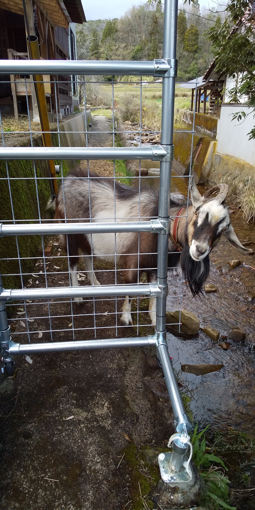 今年の雪は重かったので樹木の枝折れやメッシュ柵の倒壊が多発。山羊目線でチェックして枇杷や松をヤギーズのエサに。葉っぱより樹皮が好きです。メッシュ柵の修理は邪魔なルパンをつないで行いますwww