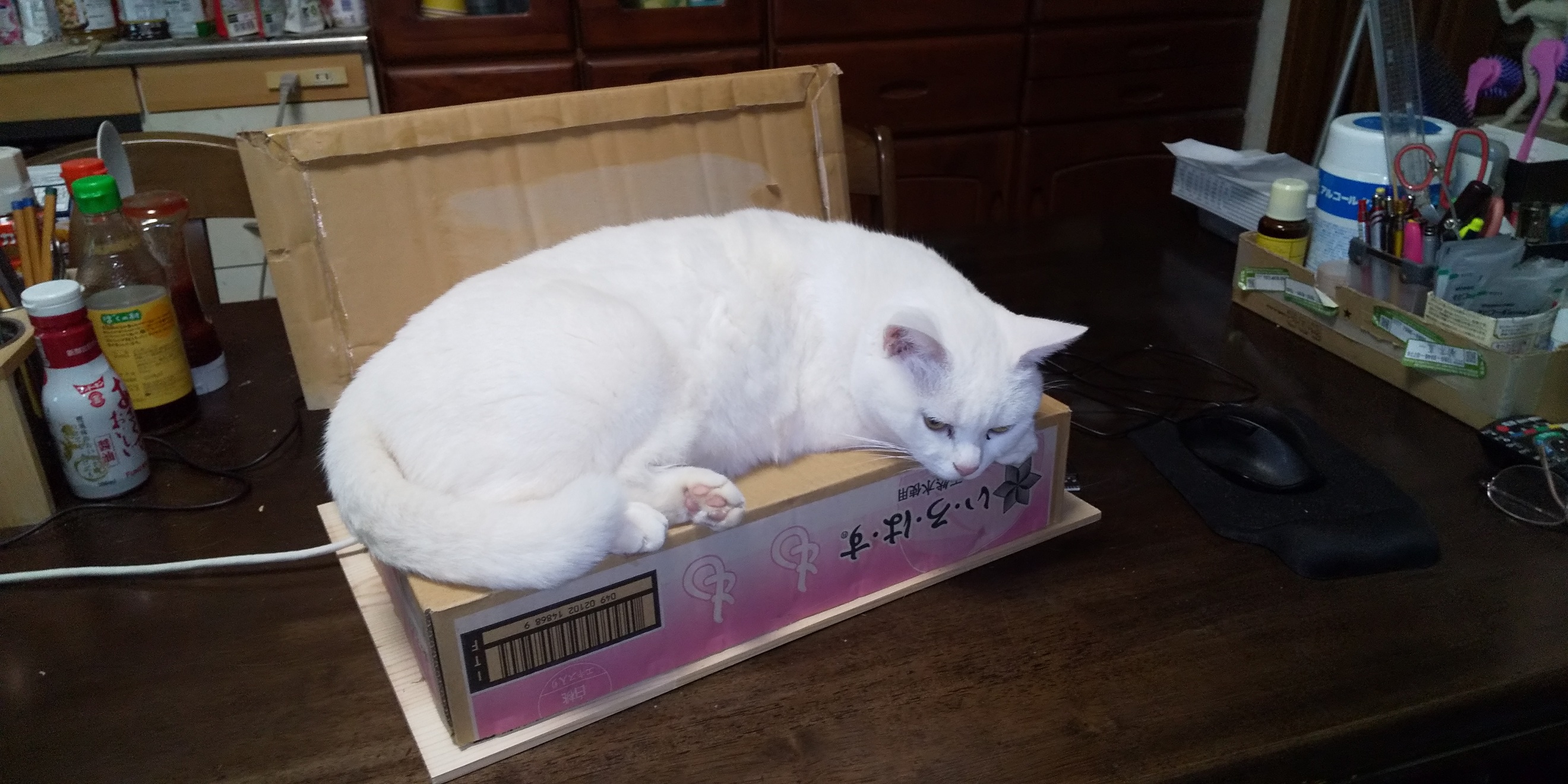 ルパンがDV野郎なので,メラニーとミルクはおちおち満足に餌を食べられない。そこで餌箱を分けることにし,新しいのを作った。写真①入れろ,②入れろ2,③ひとまずできた,④新しい餌箱とルパン,⑤妻子。