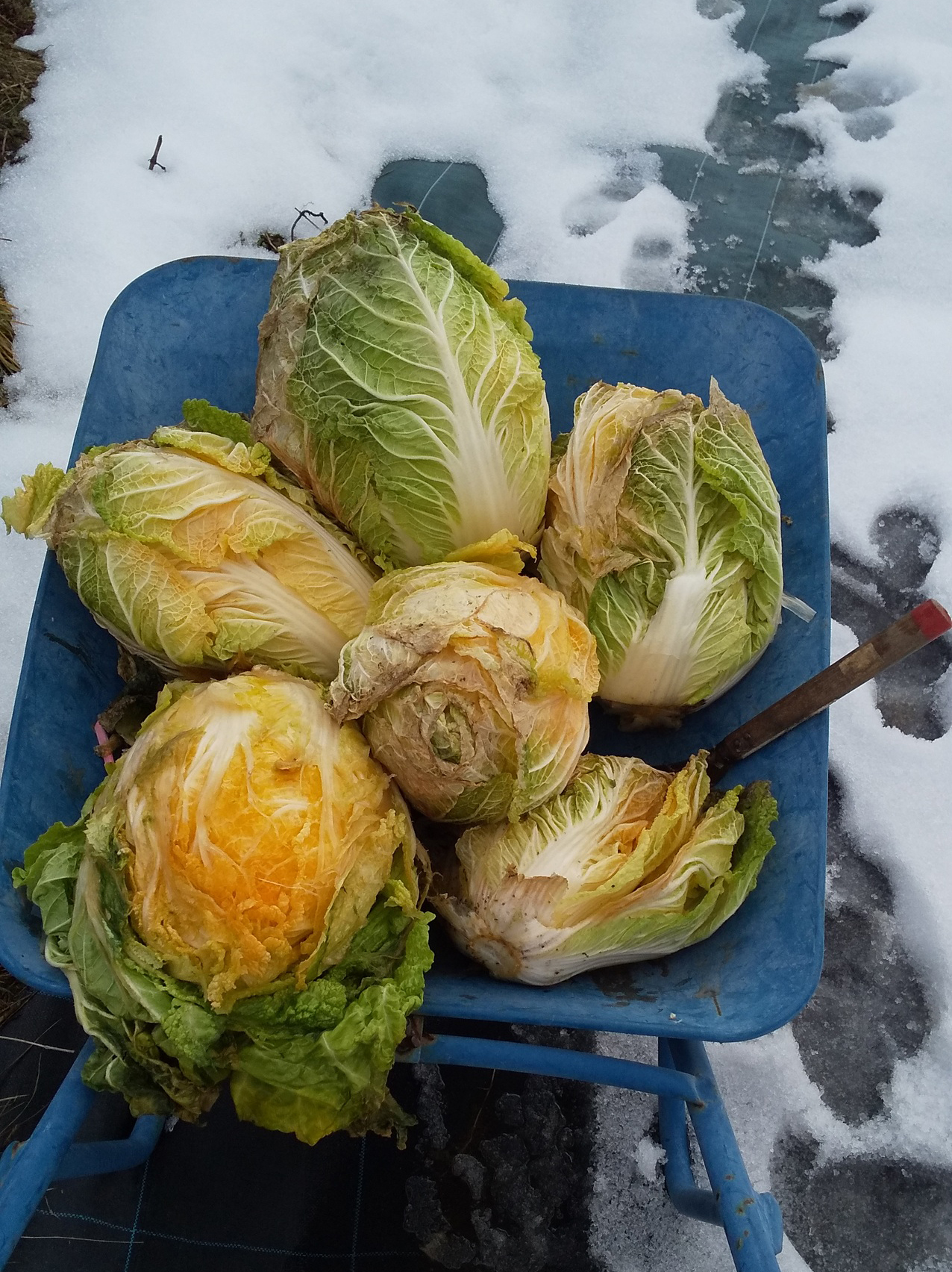 放牧地に風で飛ばされて来た段ボールが散乱。掃除していたら案の定ルパンが「遊んでくれ」と寄ってきて運動会。片付け忘れたチリトリは大破💦 北向きの屋根の落雪はなかなか融けません。雪中ハクサイ掘り。