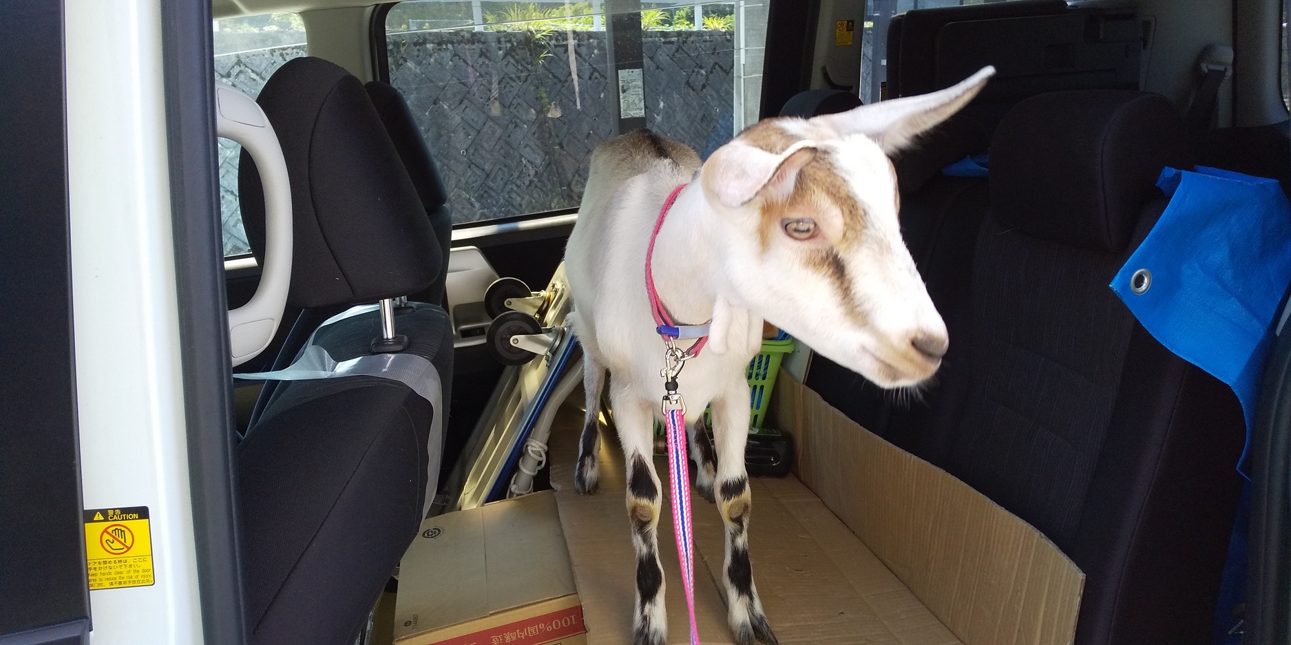 アルパイン種のメスの子ヤギが仲間になりました。ルパンと同じ三良坂フロマージュ出身。ルパンを連れ帰ったときの反省に基き,助手席に乗せました。大正解。帰着してすぐに削蹄。そして群れの中へ・・・。