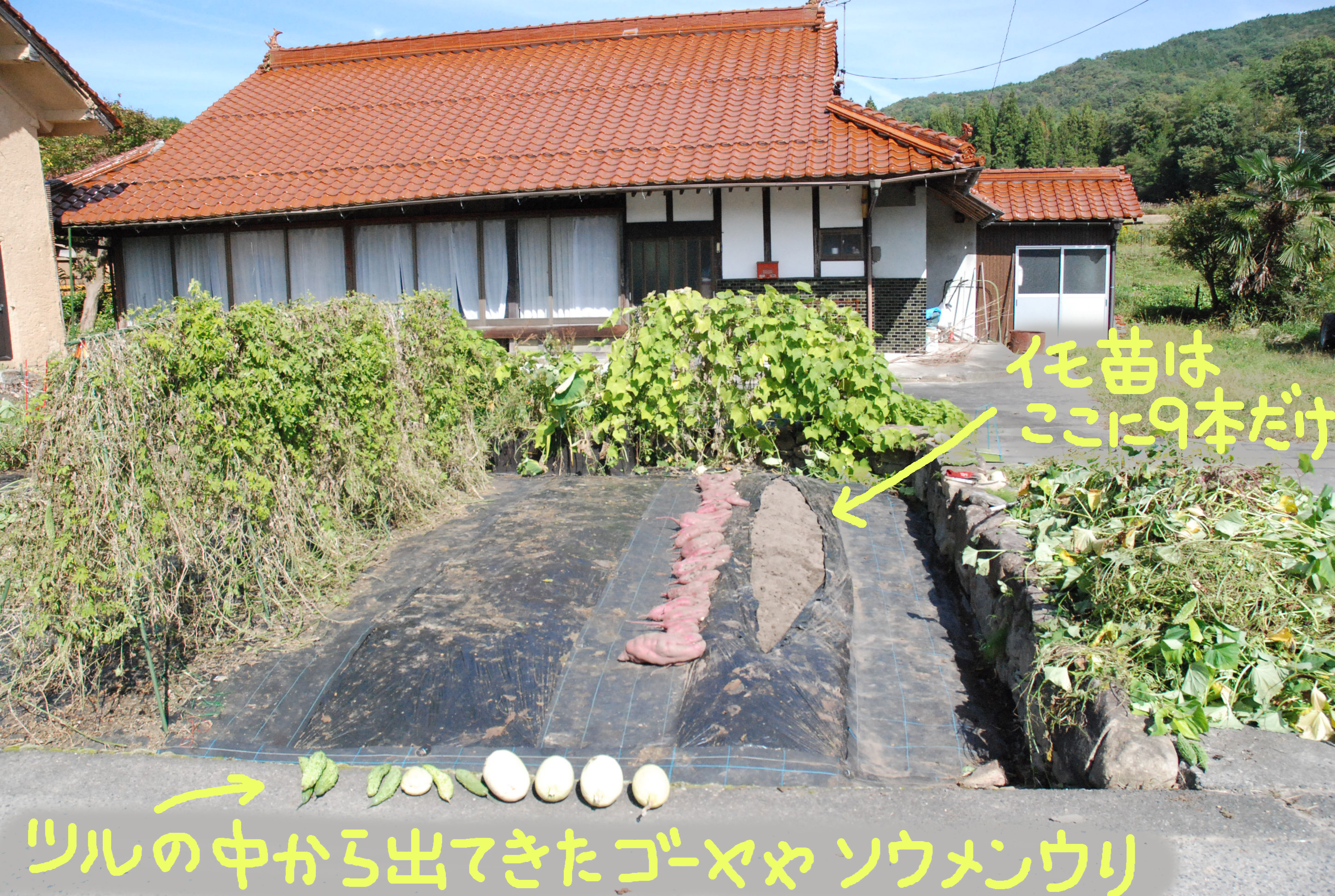 ヤギは意外と夜行性。夜中に草地で草を食べたり寝そべったり。野犬がいないからできることなのでしょう。さてゴーヤ,ハヤトウリ,カボチャなどを片付けて,サツマイモを掘りました。芋づるはヤギのおやつ。