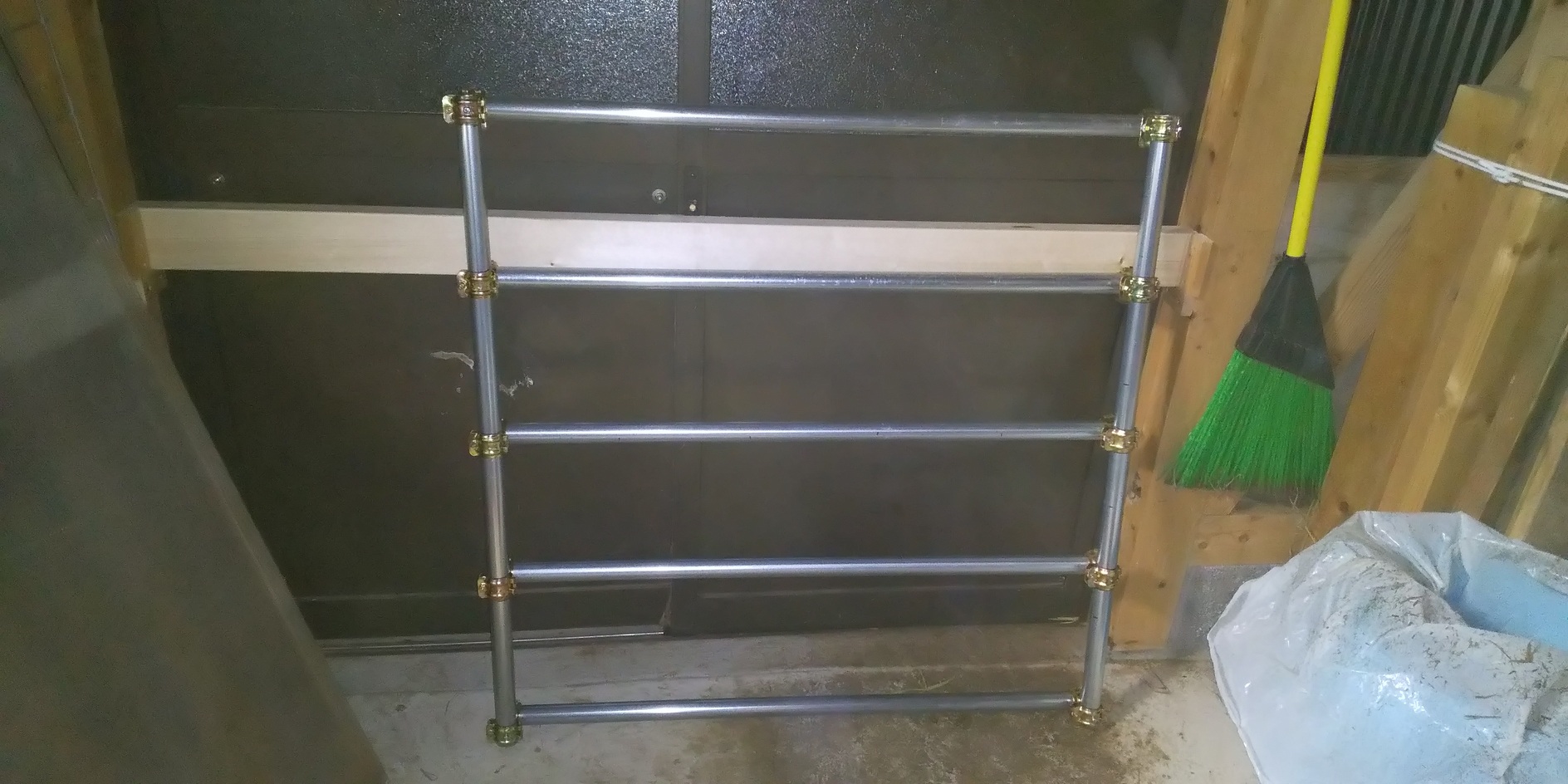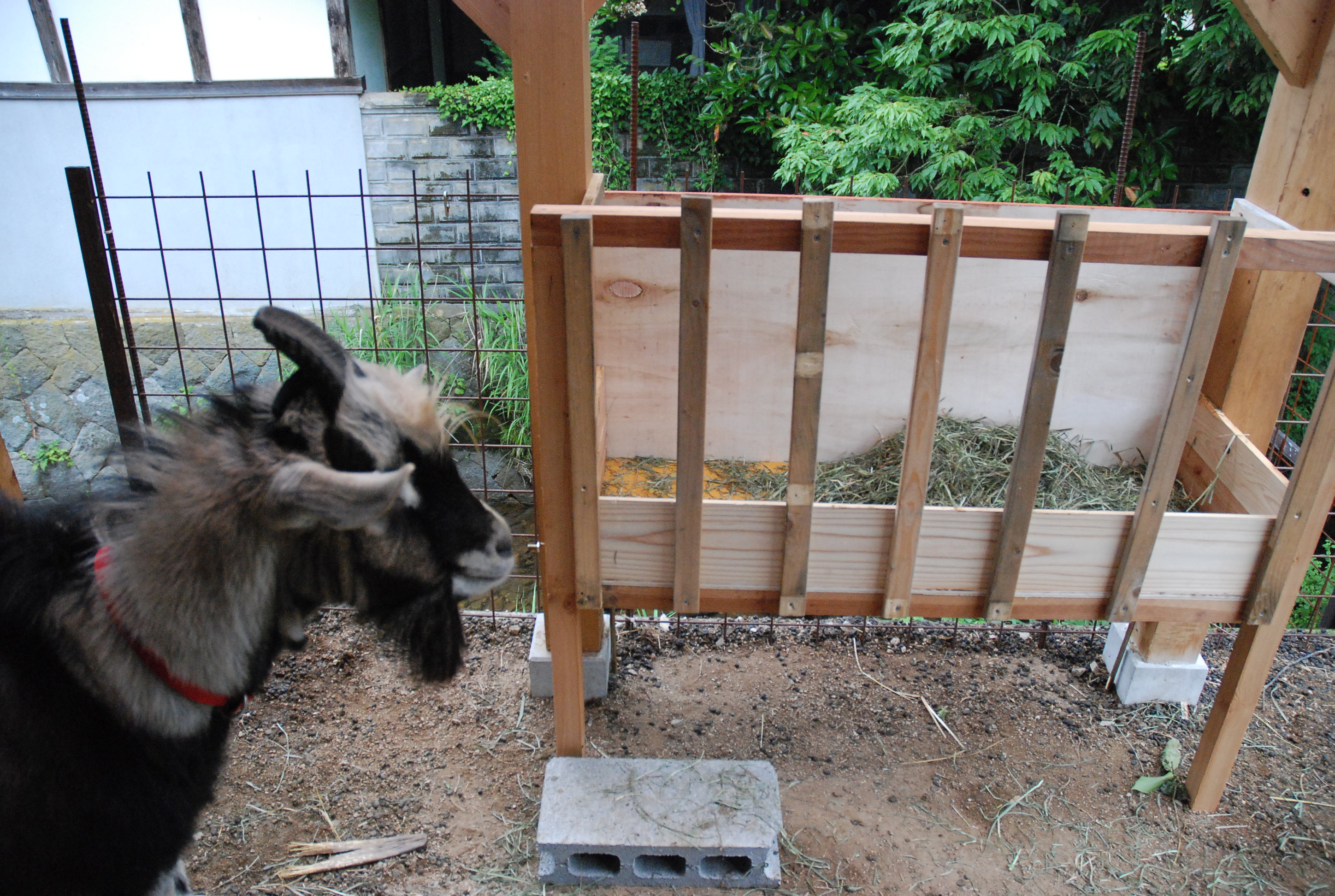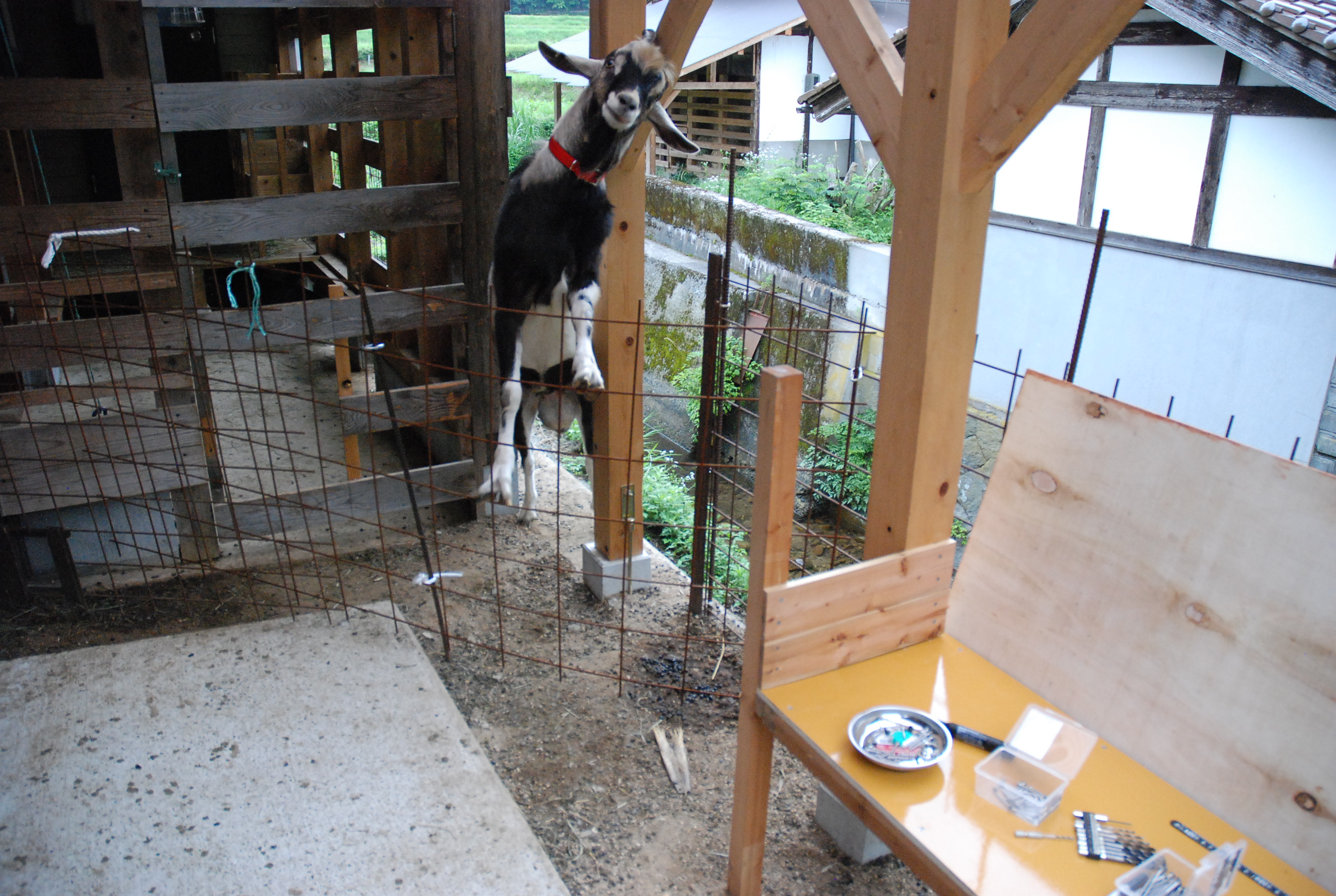 やっと涼しくなりブトも減ったので山羊舎の補修をしました。引き戸の合板の穴にツギを当て,山羊舎入口のドアを鉄パイプで作り,エサ箱に足かけをつけ,引き戸の内側に閂を設置! さて次は夏野菜の処理だ。