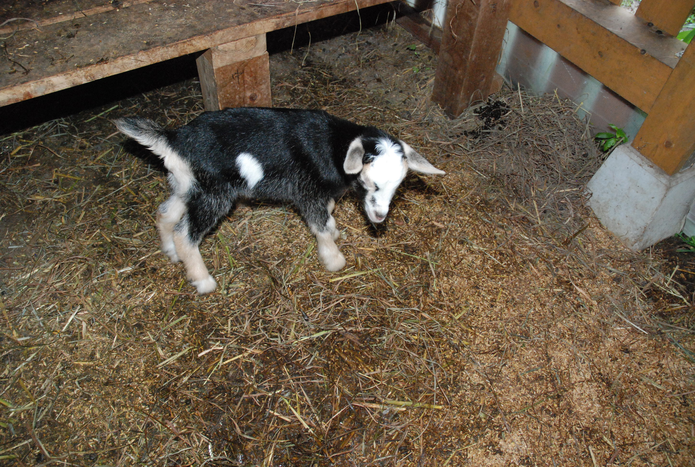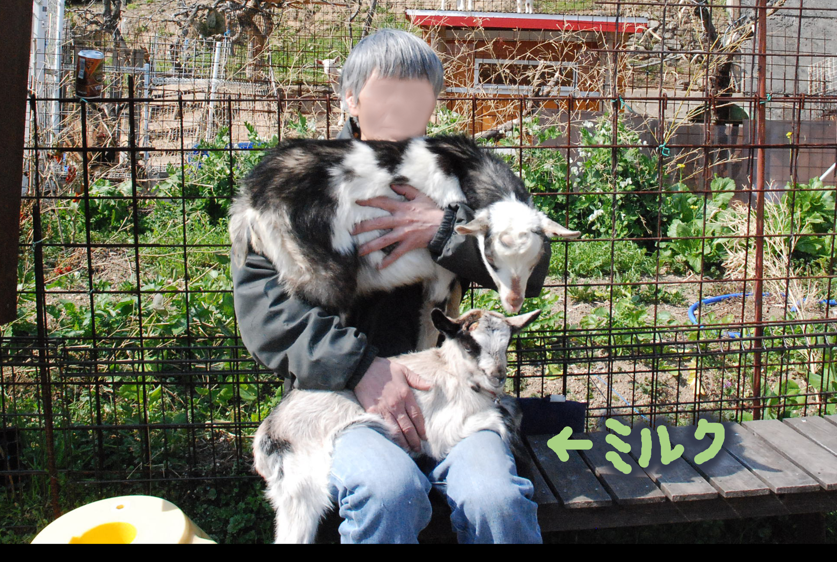 満1歳になるまでは妊娠させてはダメと言われていたのに…。ごめんなさい。メラニーは初めての出産。牛飼い親爺が柵の外から指導助言。なんとか産婆しました。子ヤギはアルパイン的なオス。写真①,②,③。