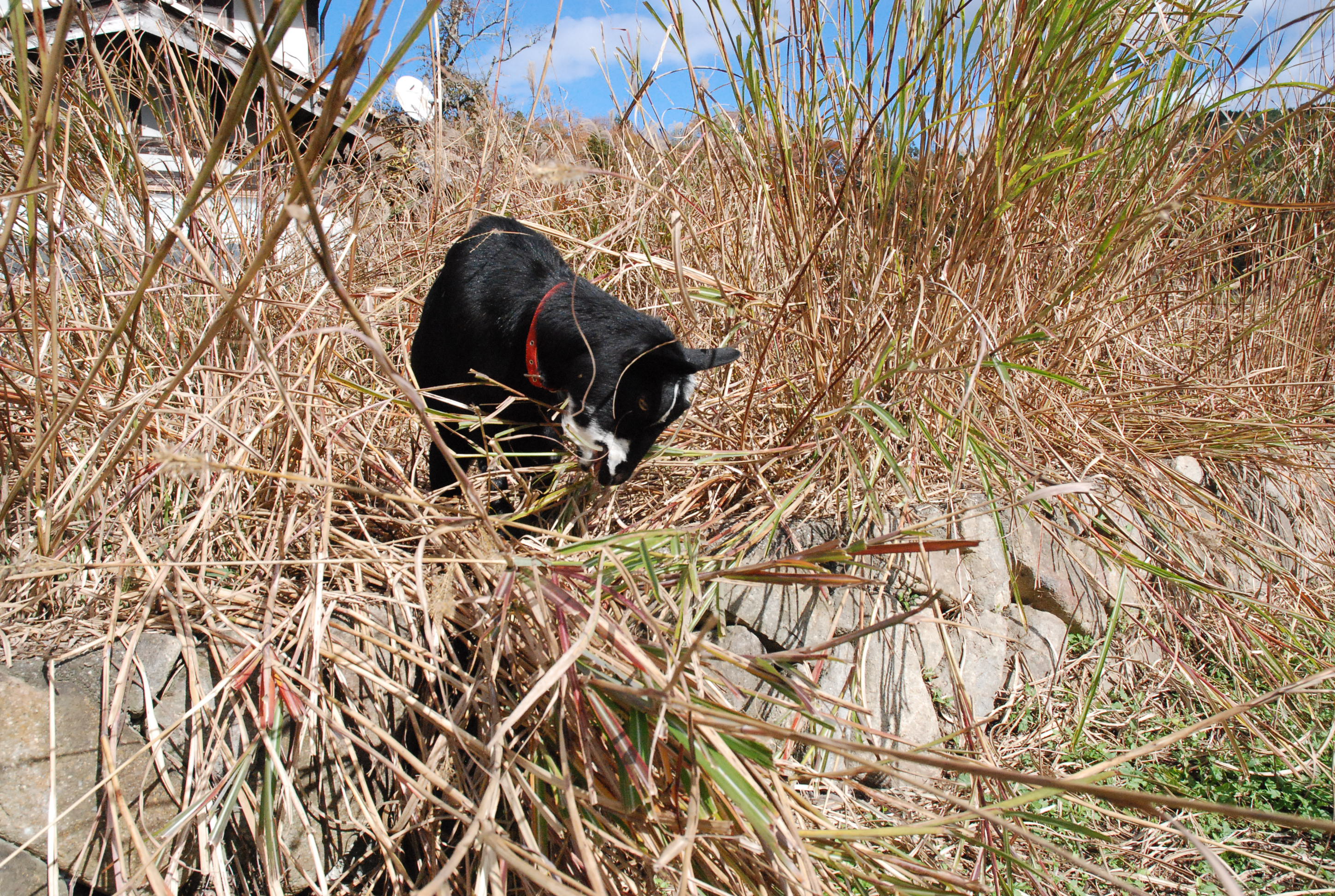 放牧地拡張Ⅱ。しかし!悪い草があったらしく山羊体調不良。メラニーは口から泡を吹き苦しそう。2匹とも車に乗せて獣医に走る(汗)。何とか回復。写真①病み上がりの2匹,②茅を喰うルパン,③同じくメラニー,④除角不十分なルパンの頭。