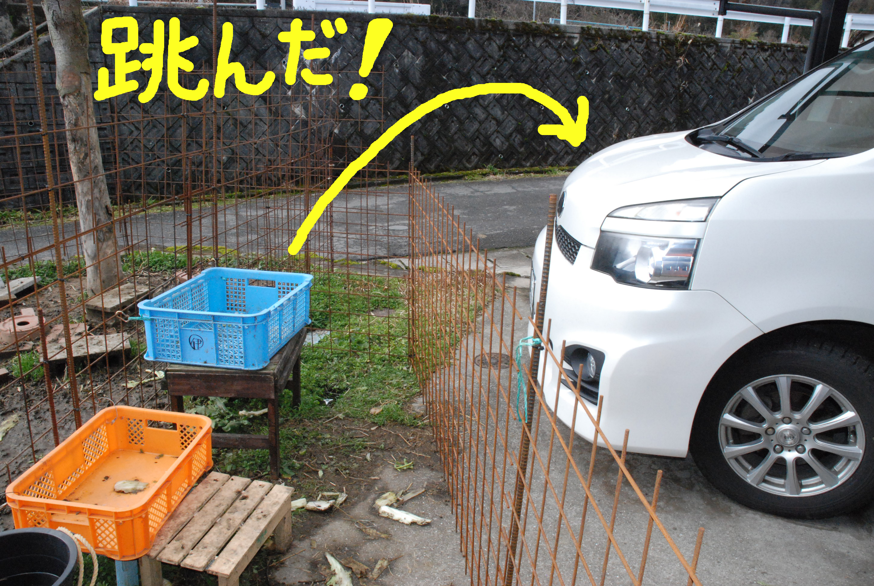 ルパンが1mの柵を軽々と跳び越し大型トラックが走る県道まで出る! 柵を高くしようと材料を買いに行った間にまた脱走! 柵に入れた直後また跳び越そうとして失敗し脚を引っかけた。でも全然懲りない。