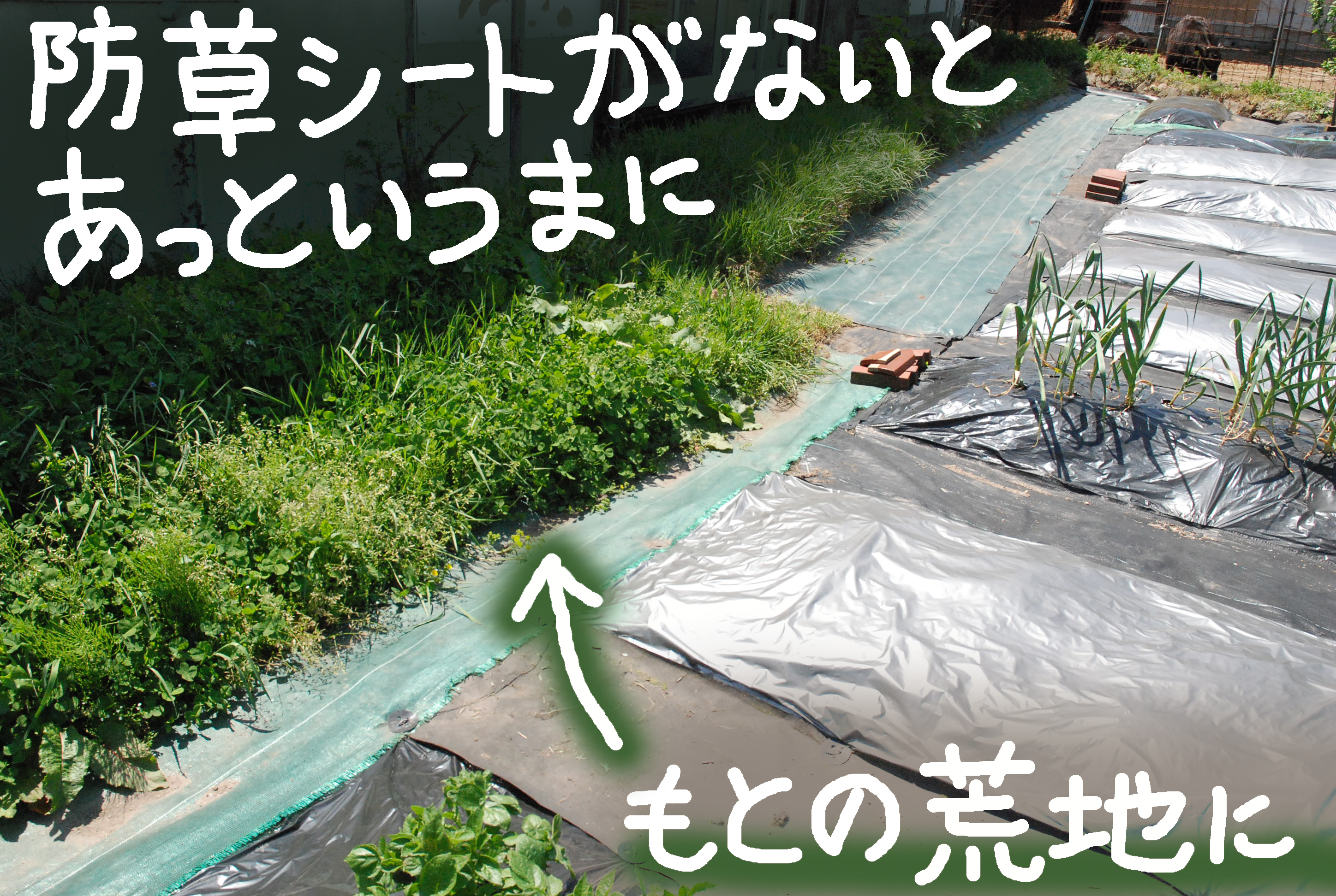 写真①防草シートのbefore,②after,③防草シートを敷く理由,④ニンニク・チシャ・ジャガイモ,⑤アスパラガス,⑥柚子を植えたよ。