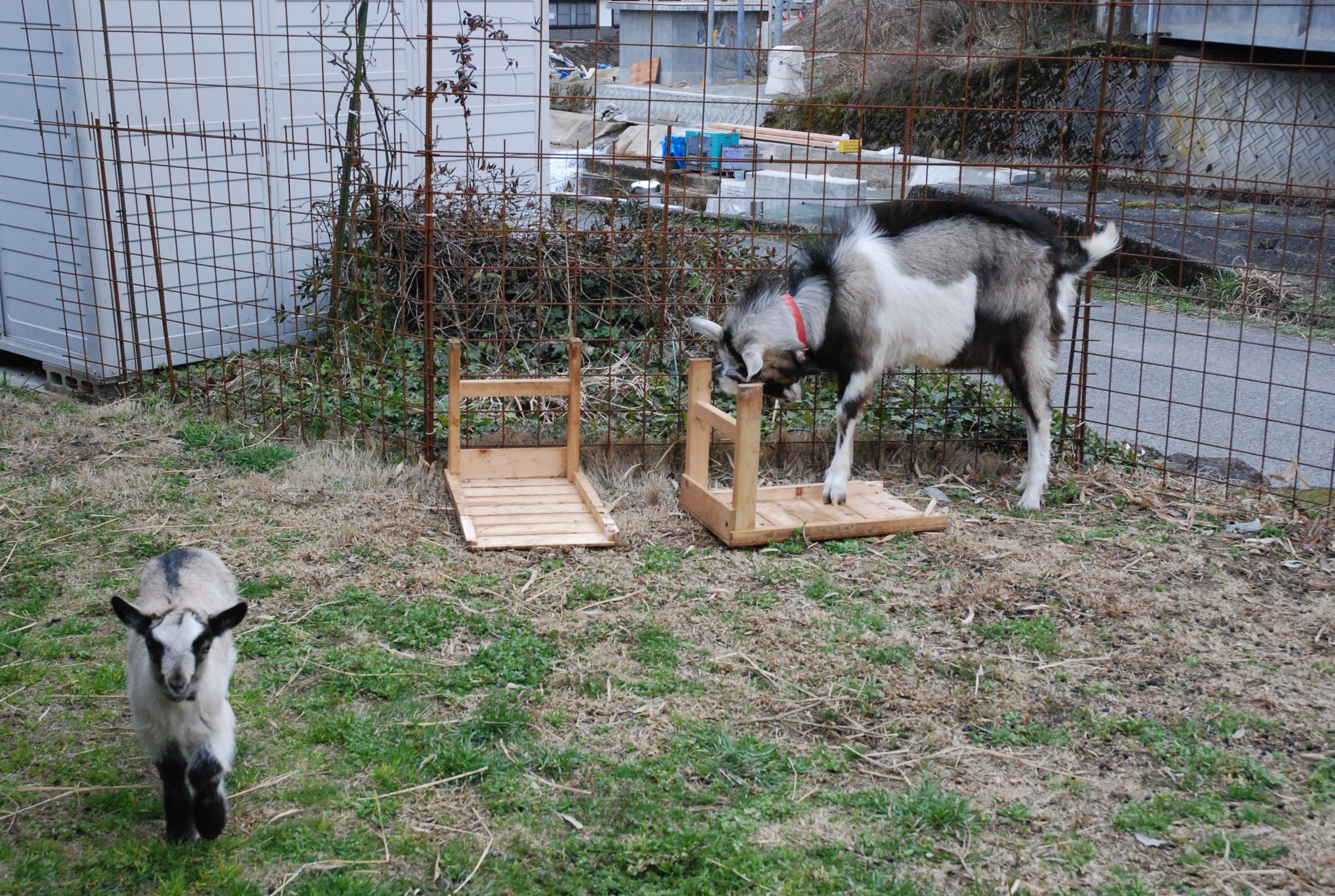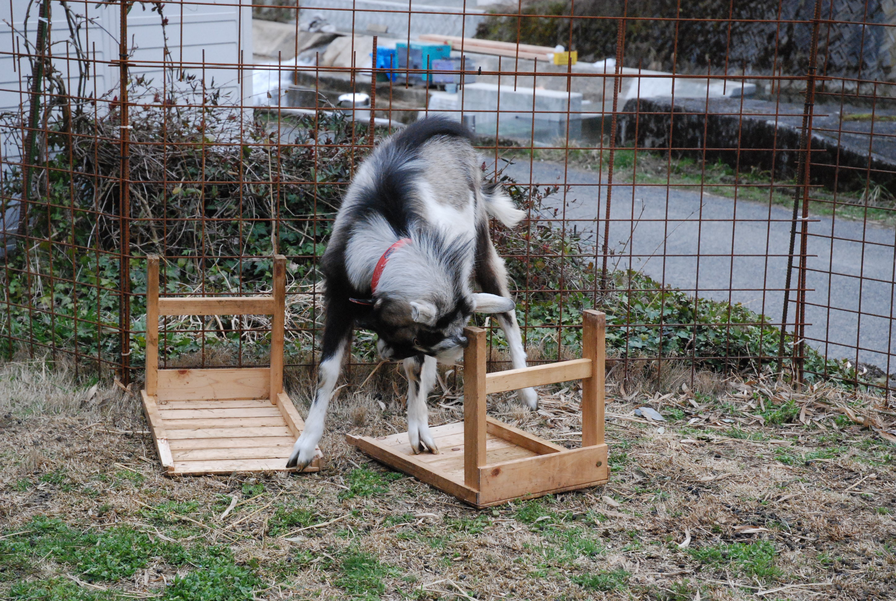 今年の冬は雪が積もりません。温かくていいけど,このままでは水不足になって田植が心配です。山羊たちは雪が降らないので,放牧地で楽しく遊んでいます。ルパンは力を持て余し,破壊に勤しんでいます(-"-)。