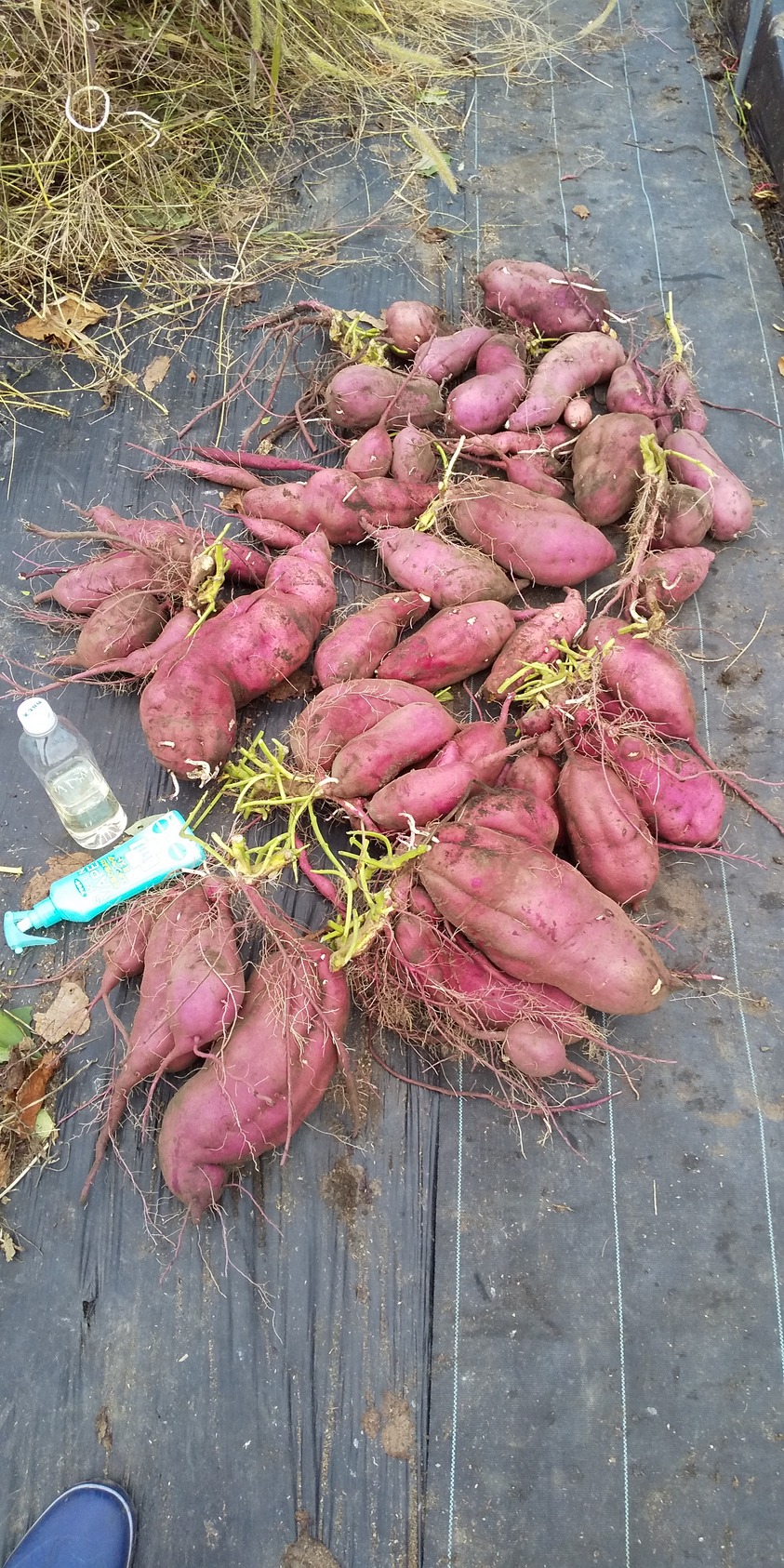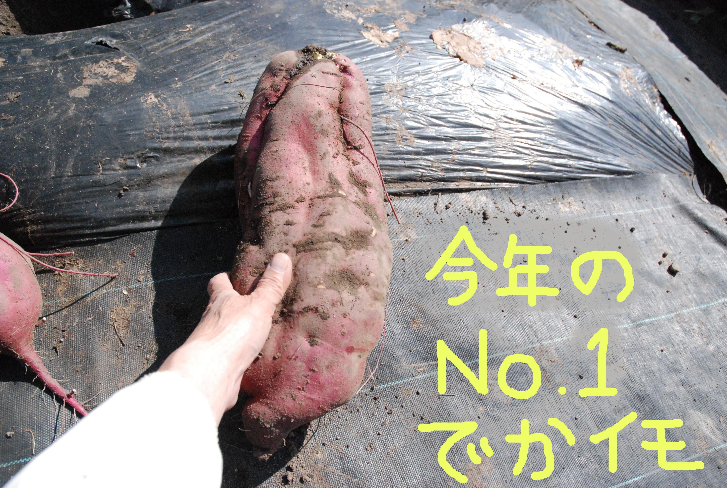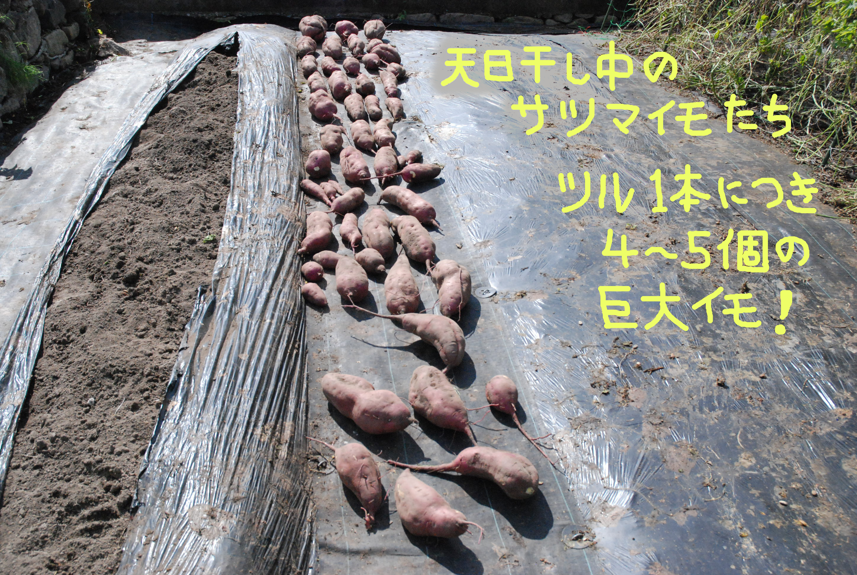 やっと秋晴れになり芋堀り。芋づるを刈り,抜こうとするがビクともしない。地中にぎっしり巨大な芋が埋まっていた。写真①掘る前の芋畑,②堀った後,③収穫した芋,④今季最大の芋,⑤20㎝の隙間とルパン。