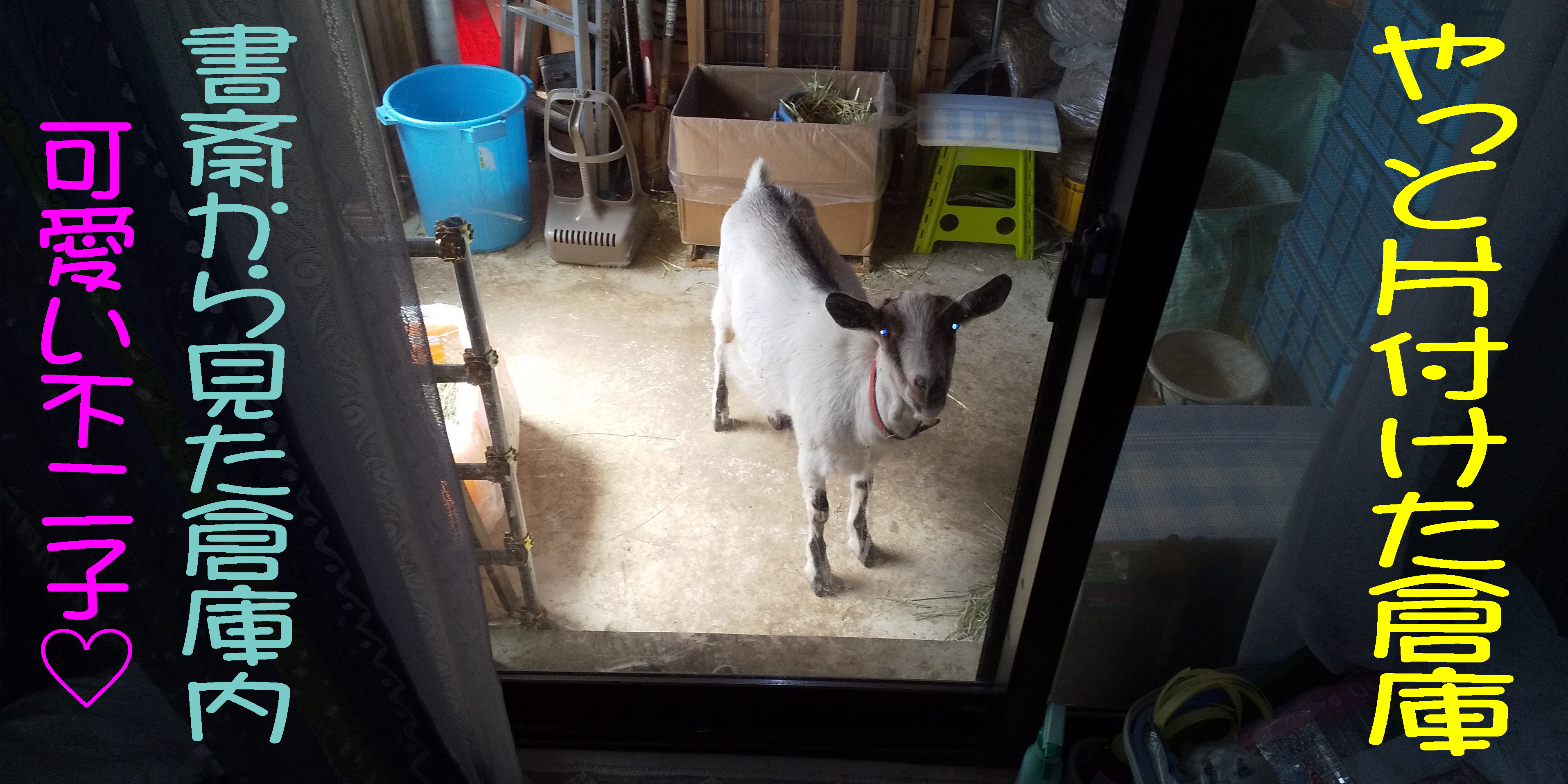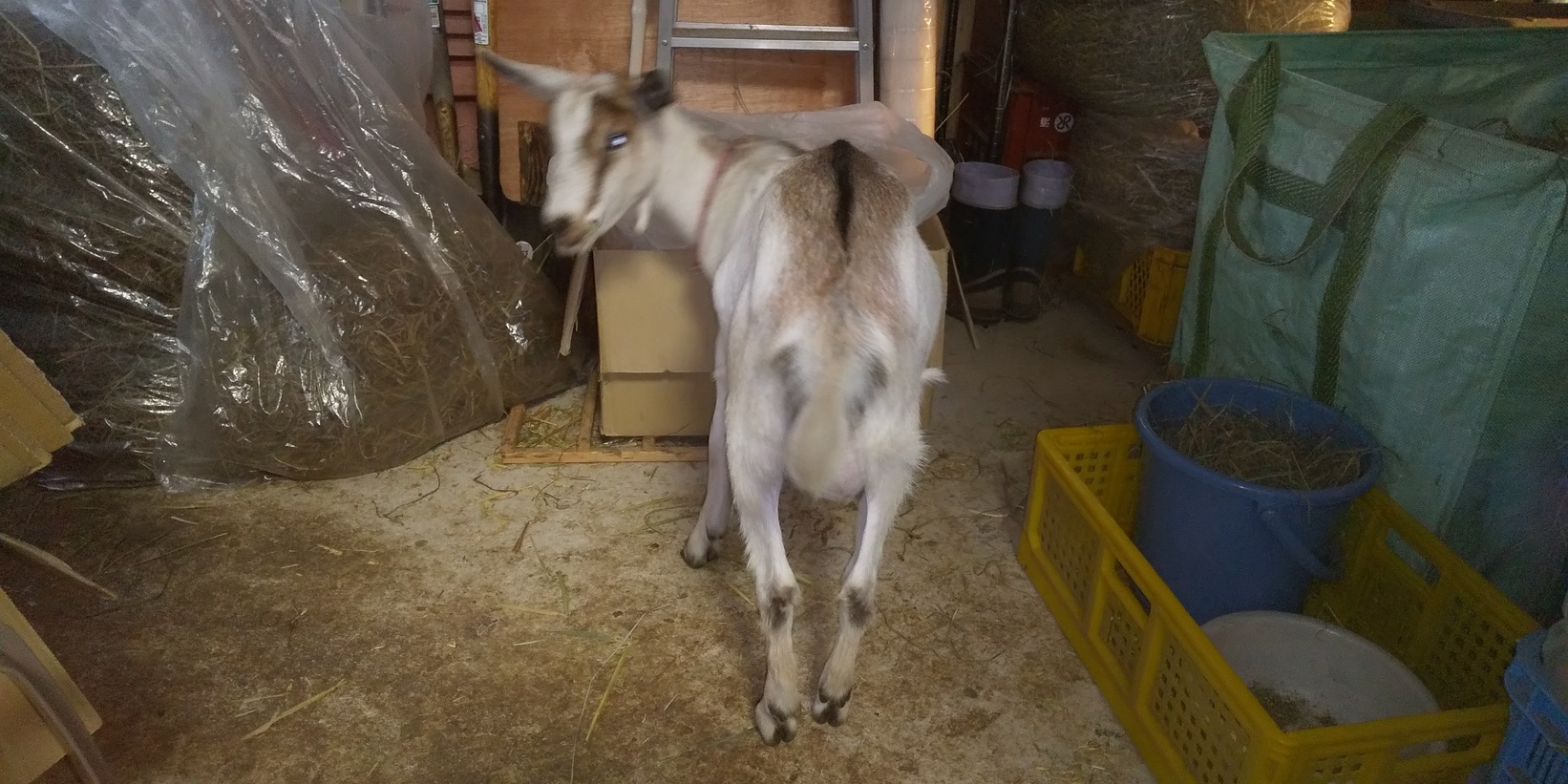 不二子は倉庫内で乾草を食べさせていますが,ときどき別の用事をしていて倉庫から出すのを忘れます。この日は一晩中倉庫内に封じ込めてしまい,荷物散乱に糞尿で悲惨な状態に💦 掃除後の倉庫と不二子です。
