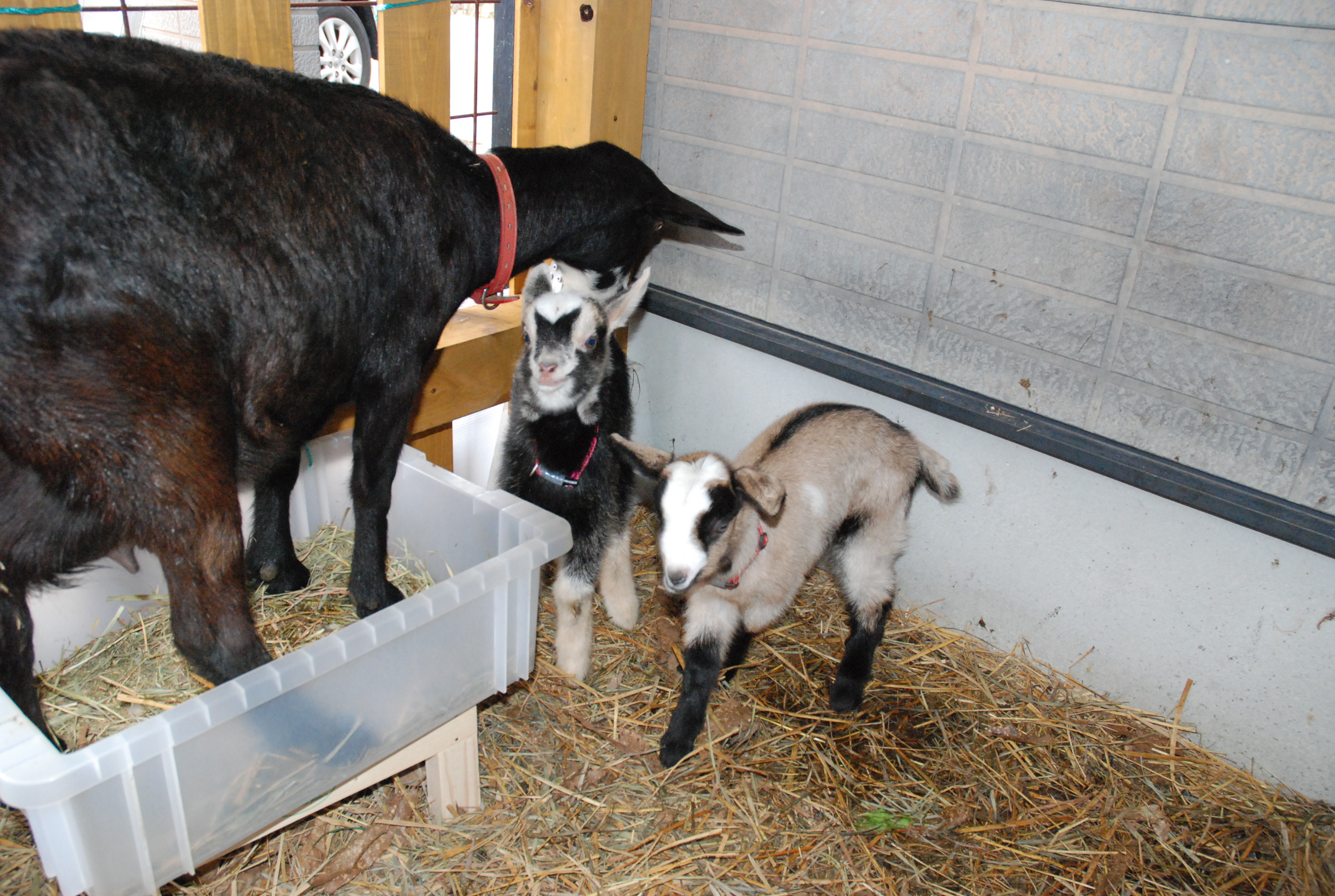 11月18日,メラニーが双子を出産! クラス旅行の前日だったので,旅行中,息子に山羊たちの世話と,毎日写メを送るよう指示。写真①出産直後,②旅行から帰って。③,④,⑤,⑥。茶色がオス,黒がメス。