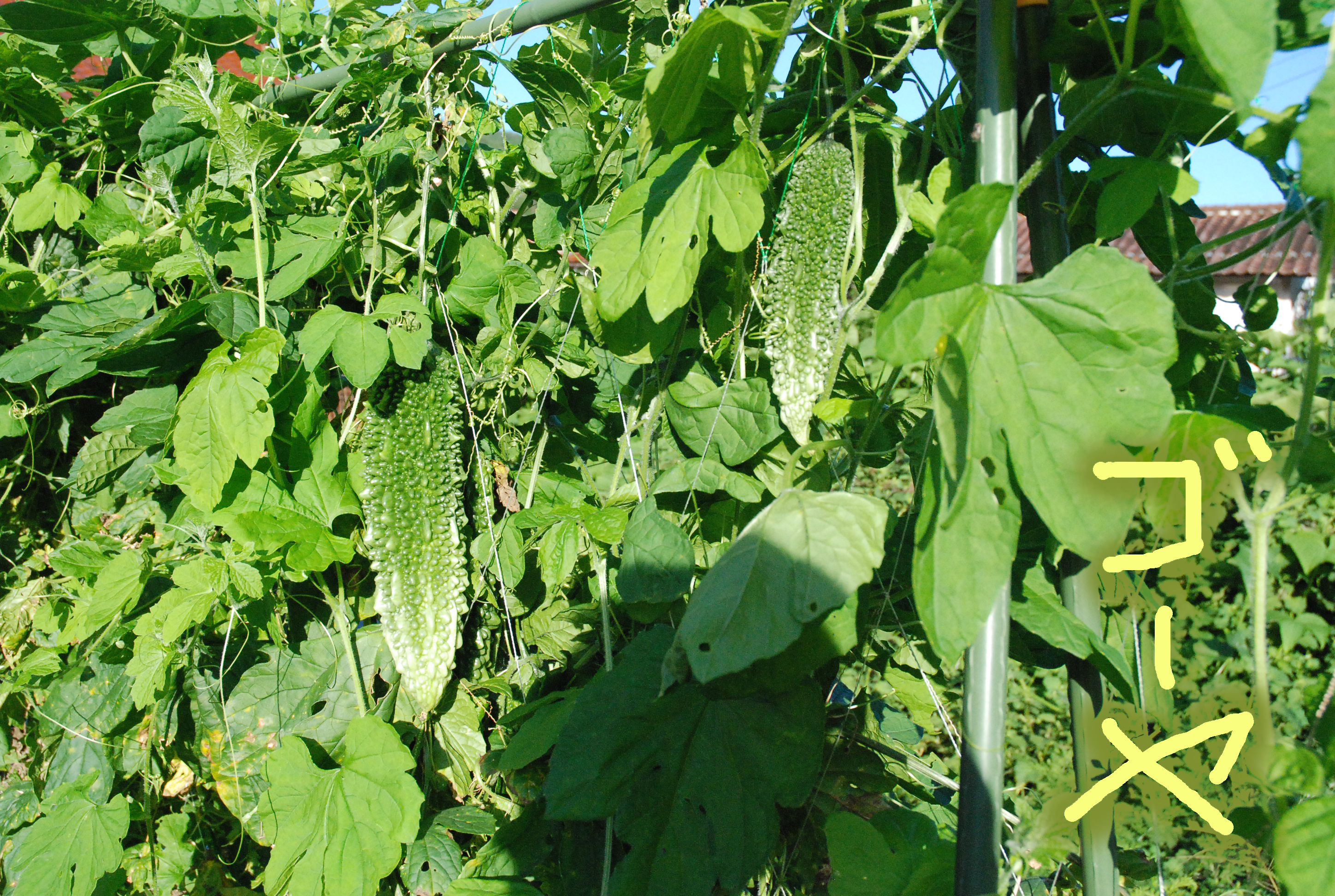 台風9号のせいでゴーヤが倒伏💦 起こしましたが,ゴーヤが好きでない親父は「このまま枯れればいいのに」と思っていたようです。不二子はどんどん成長しワガママ娘になってます。まあ不二子ですから😝