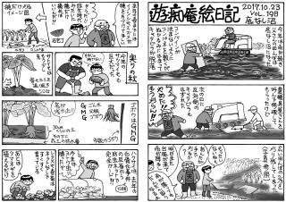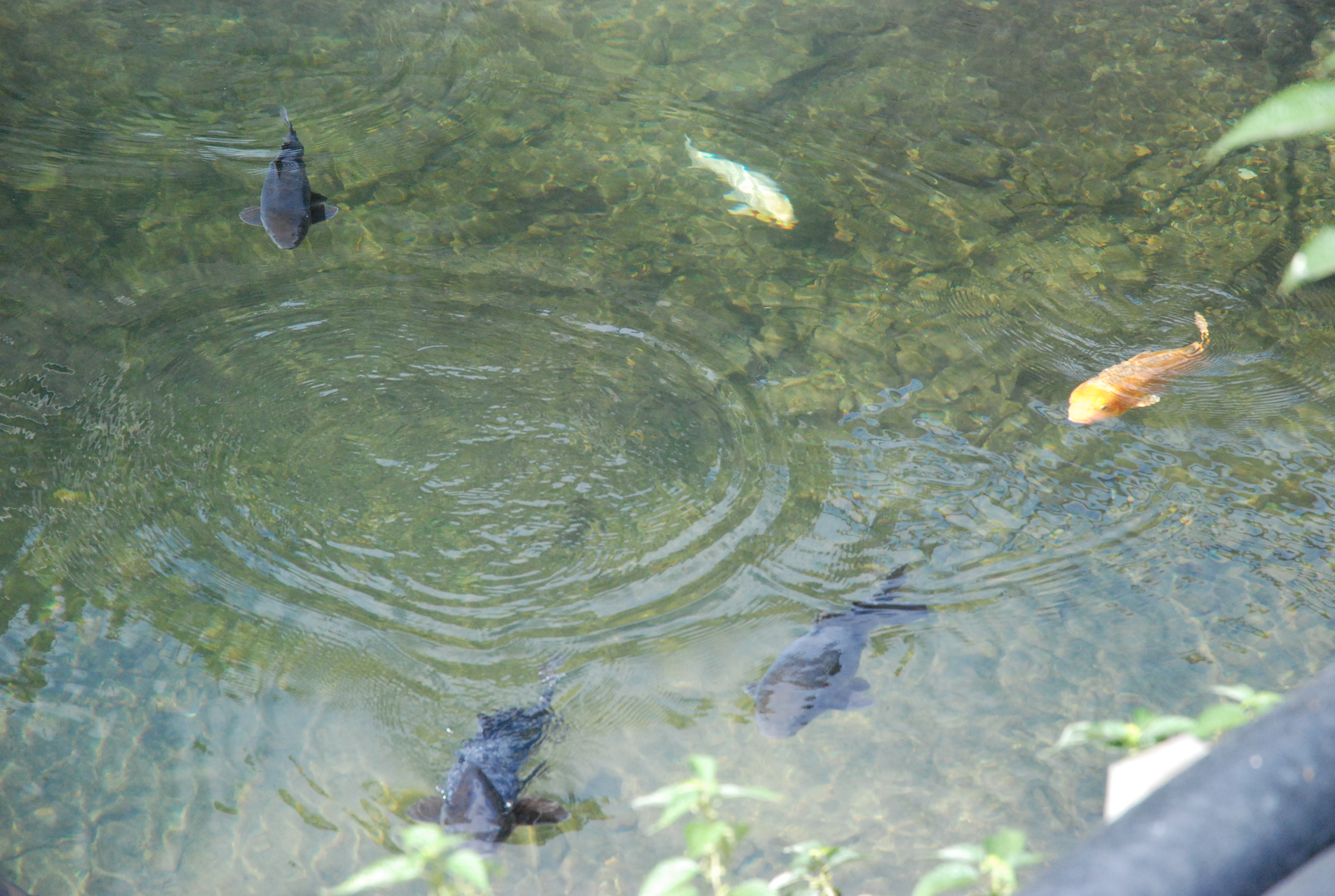 秋の野菜づくりに勤しんでいます。写真①超過保護な白菜と大根。②背が高くなり過ぎたオクラ。③元気なナスビ,④サトイモ。⑤新しい井堰の上に⑥棲みついている鯉。近所の人々が餌をやるので懐いています。