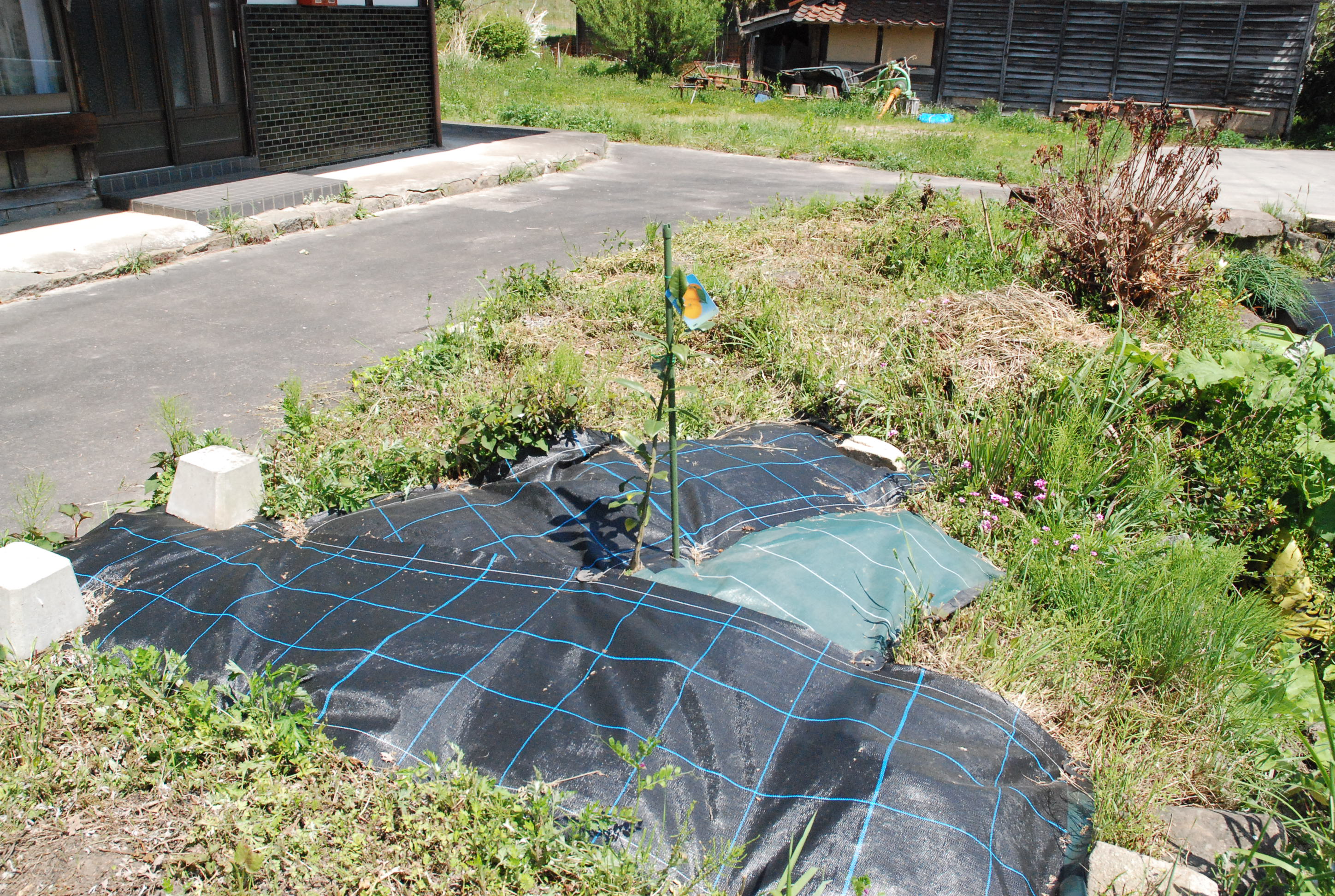 タマネギ収穫。天日干し~根と葉を切ってひもで縛って吊るします。ユズにアゲハの幼虫がついていたので捕殺。苗箱置き場にカボチャ,ウリ類を植え,サツマイモも活着したので周囲をメッシュで囲いました。