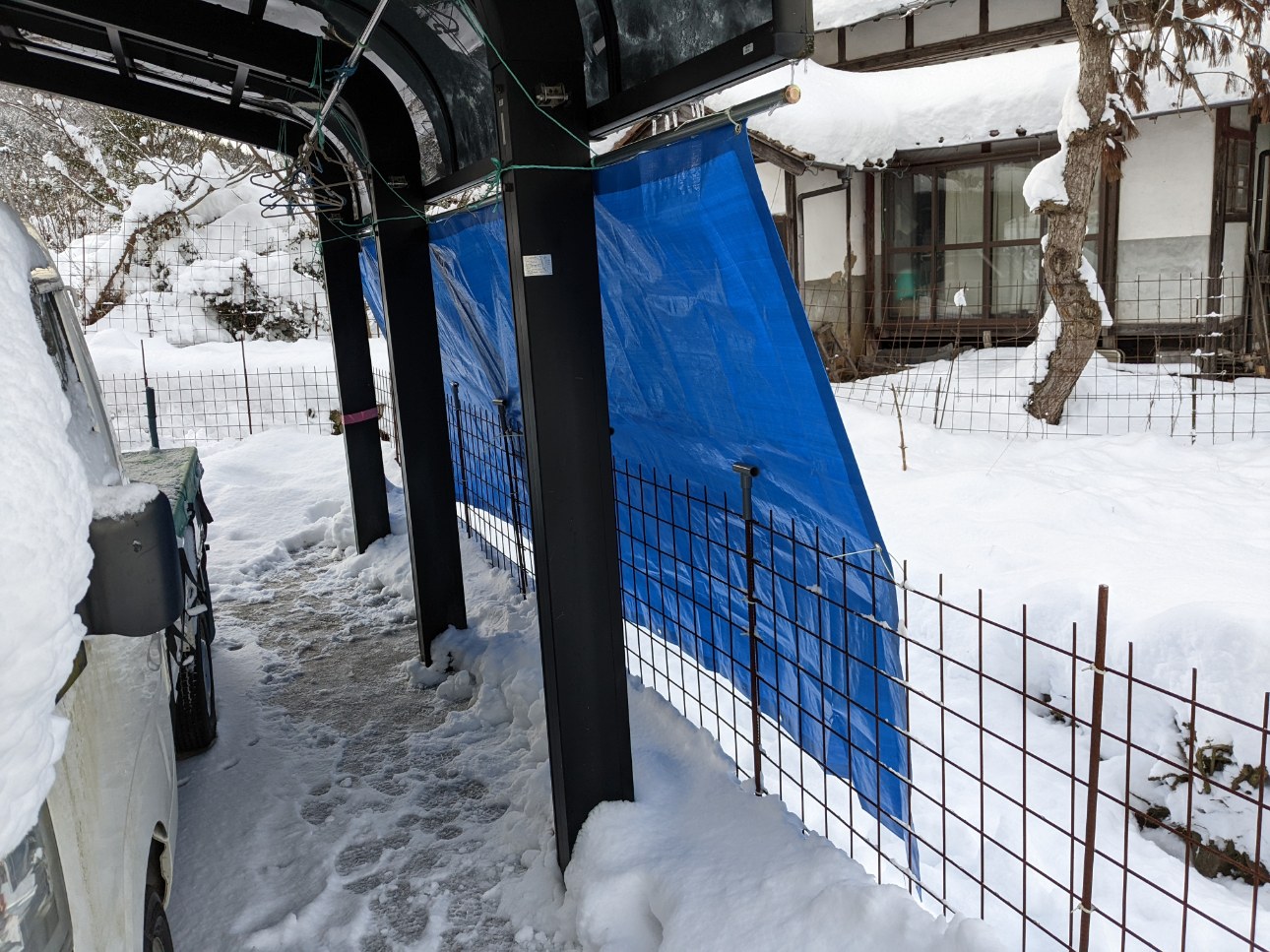 サッシ引戸。ルパンの角による破壊を防ぐため12㎜合板を貼り付けていましたが穴をあけられ,上からさらに12㎜合板を貼り付けたのに,それにも穴があきました。屋根からの落雪を足場にポリカ波板も破壊が(-"-)