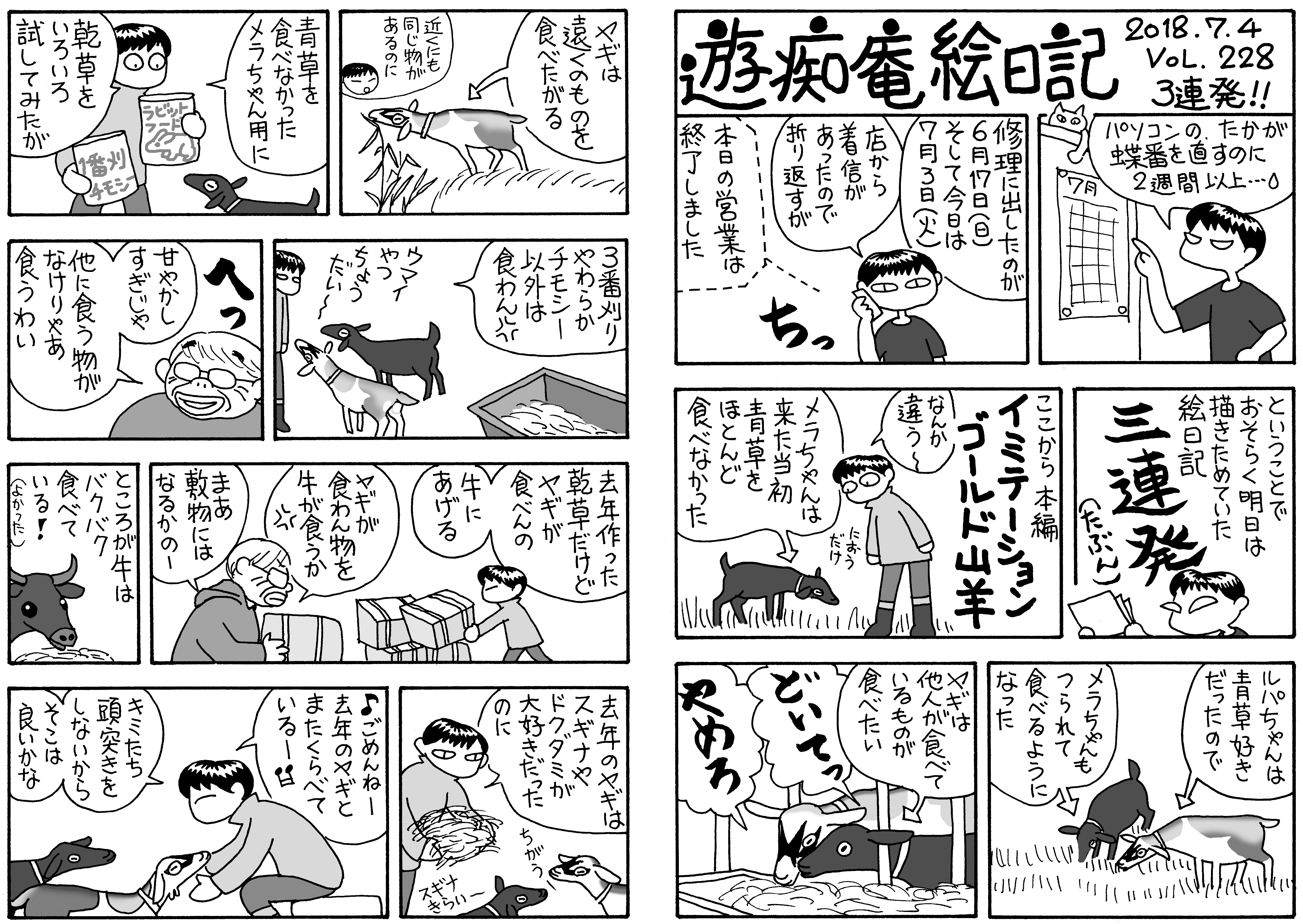 連休がやっと終わり,平穏な日々が戻ってくる。連休にしか休めない勤め人は混雑覚悟で行楽に。連休に休めない子持ちは,学校や保育所が休みなので苦難の日々。勤め人でない農婦は山羊の乾草用の牧草を播く。