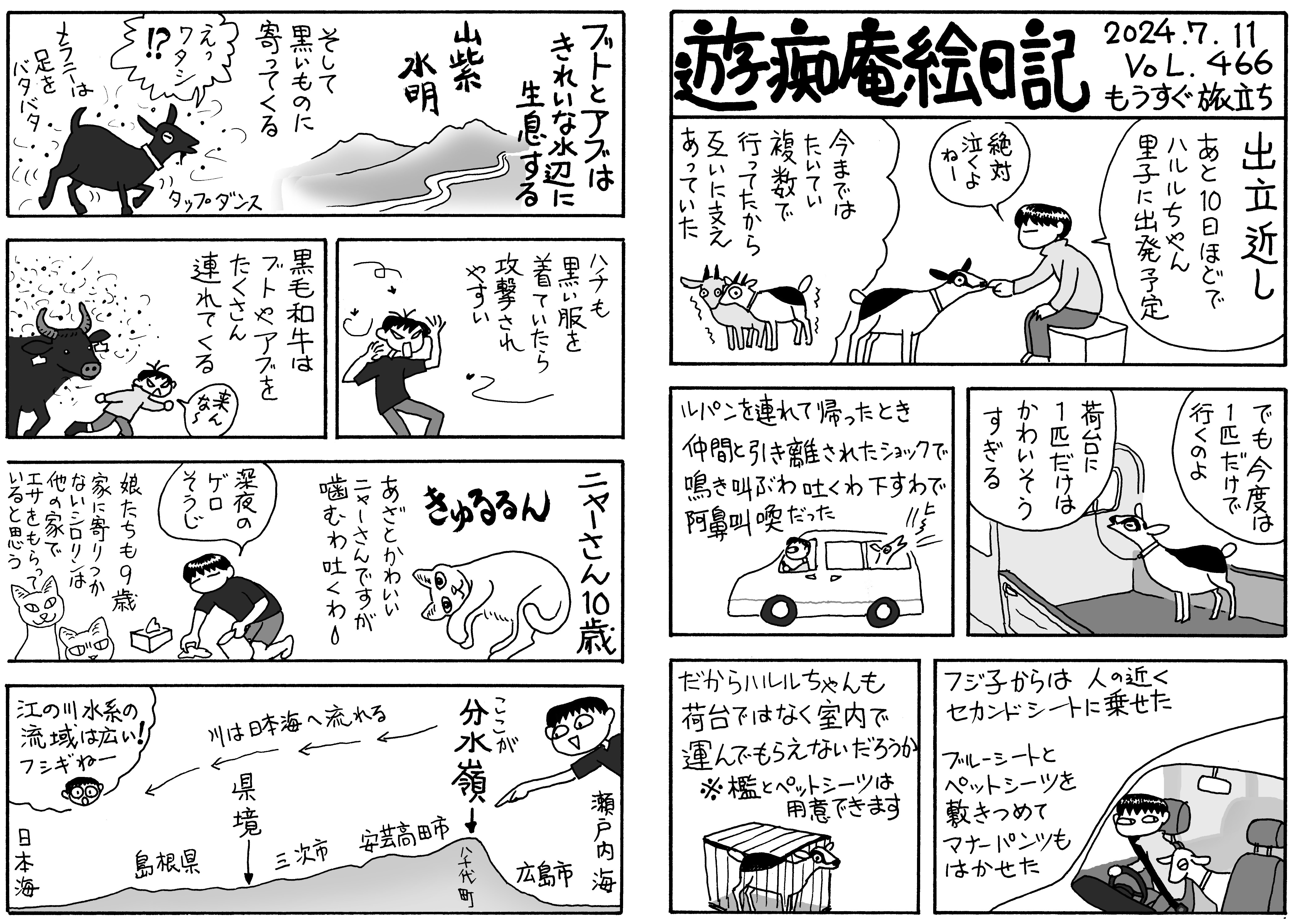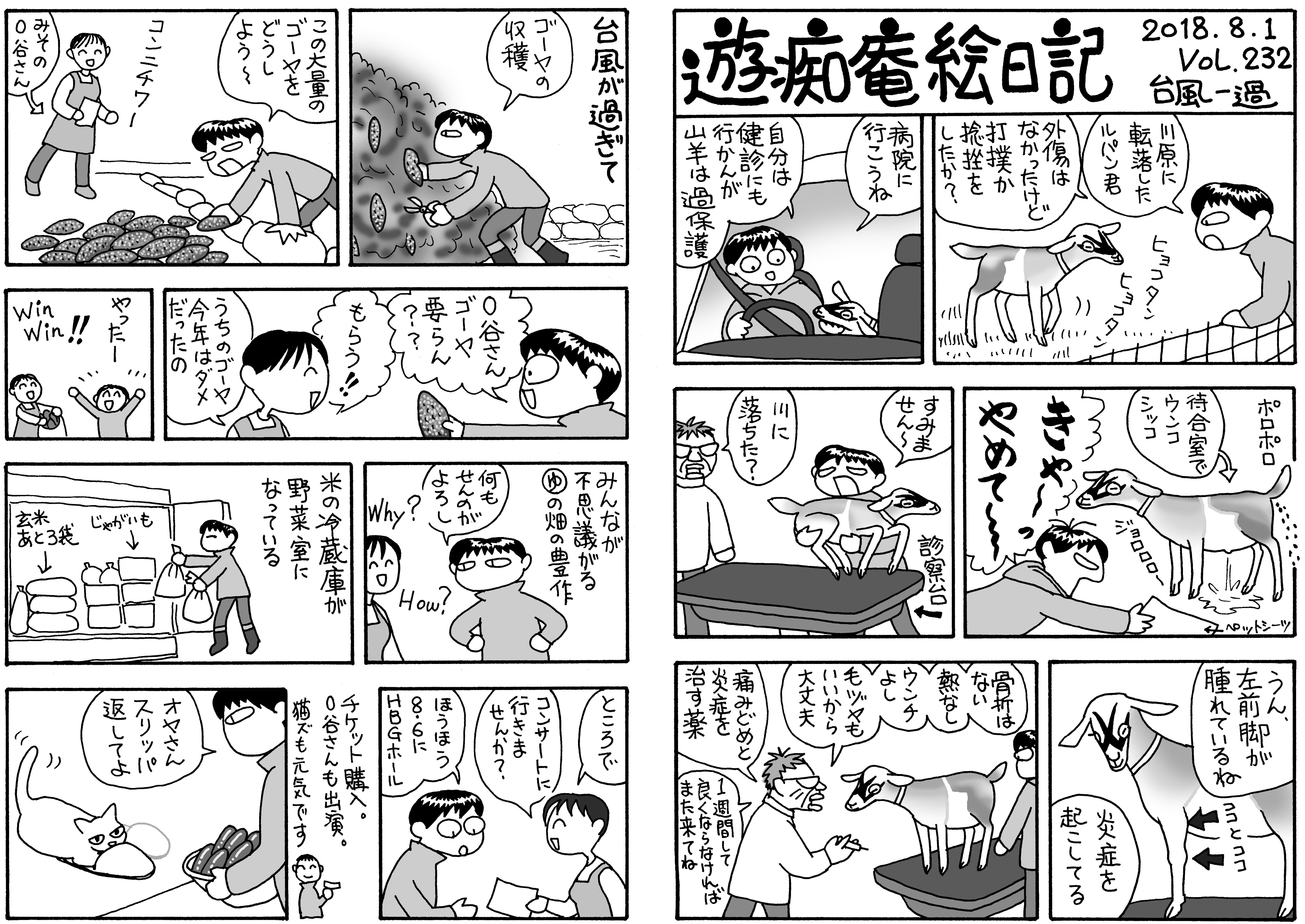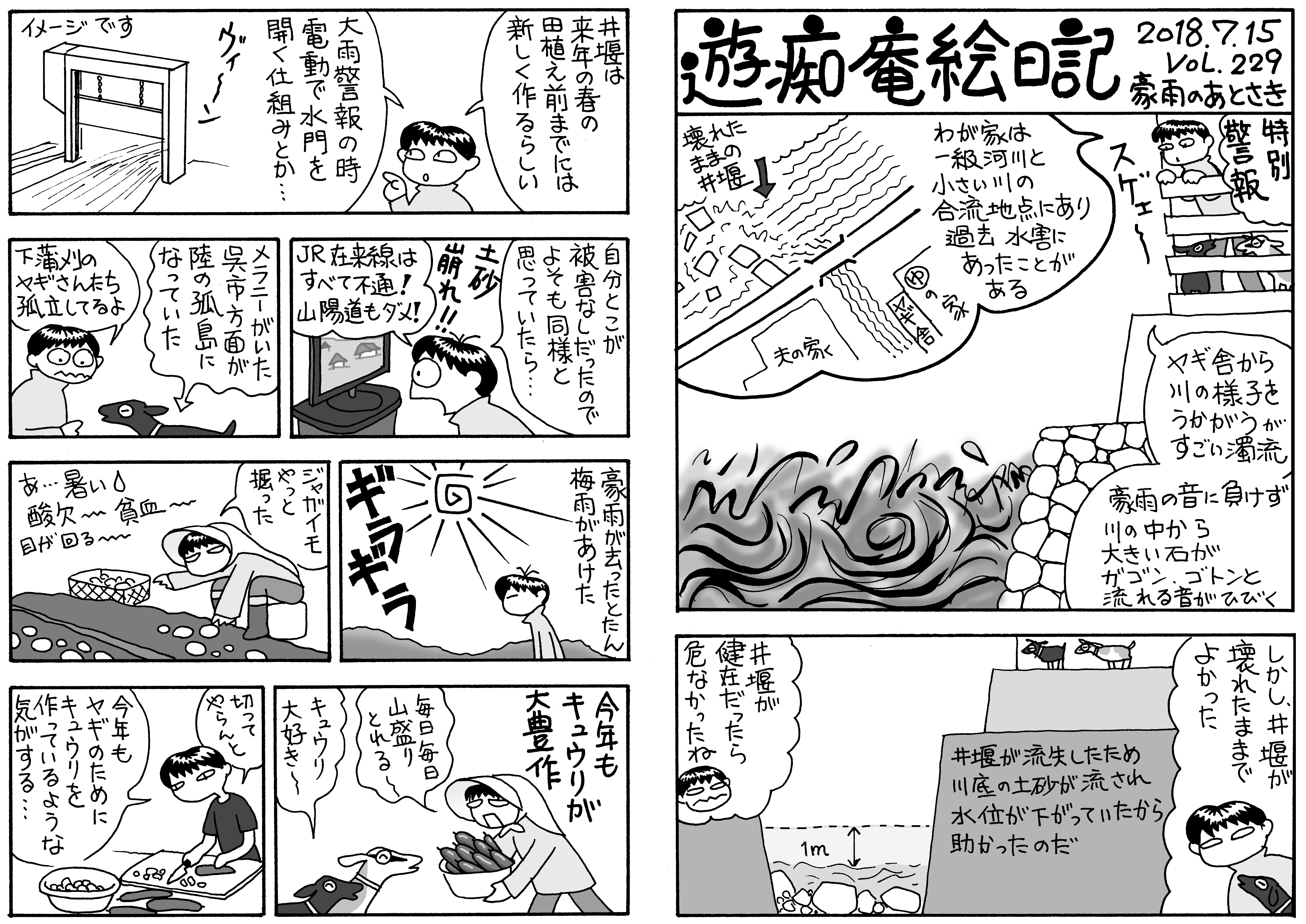 梅雨が明けない。シロりんは丑三つ時に濡れた体で帰ってきてエサを要し,食後布団の上で吐いたりする。山羊小屋は雨が続くため乾かない。写真①増水した川,②やや水が引いた川,③毎日キュウリ地獄(笑)。