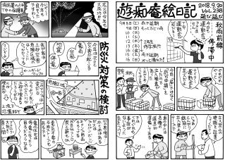 母になったメラニーが生まれた下蒲刈島まで行き,スガハラ師匠に子ヤギの除角をしてもらいました。写真①除角のあと,②他ヤギも一緒に記念撮影。その夜は土砂災害の説明会。土砂災害と水害は担当が違うと!