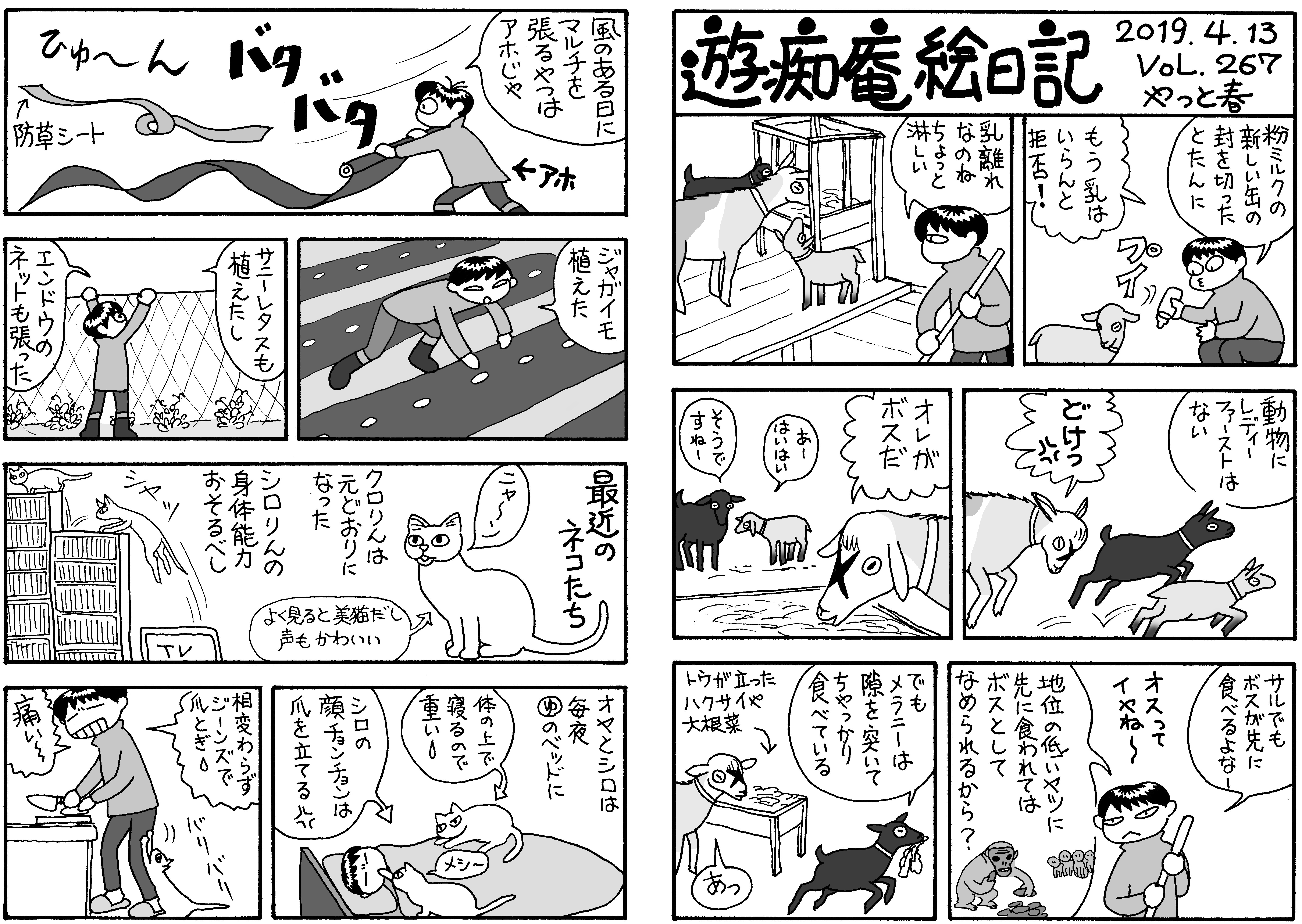 やっと桜が咲き,畑仕事開始。しかし親爺は「まだ早い言わあのー」と呆れ顔。ミルちゃんは生後2か月になり乳離れして淋しい(T_T)。