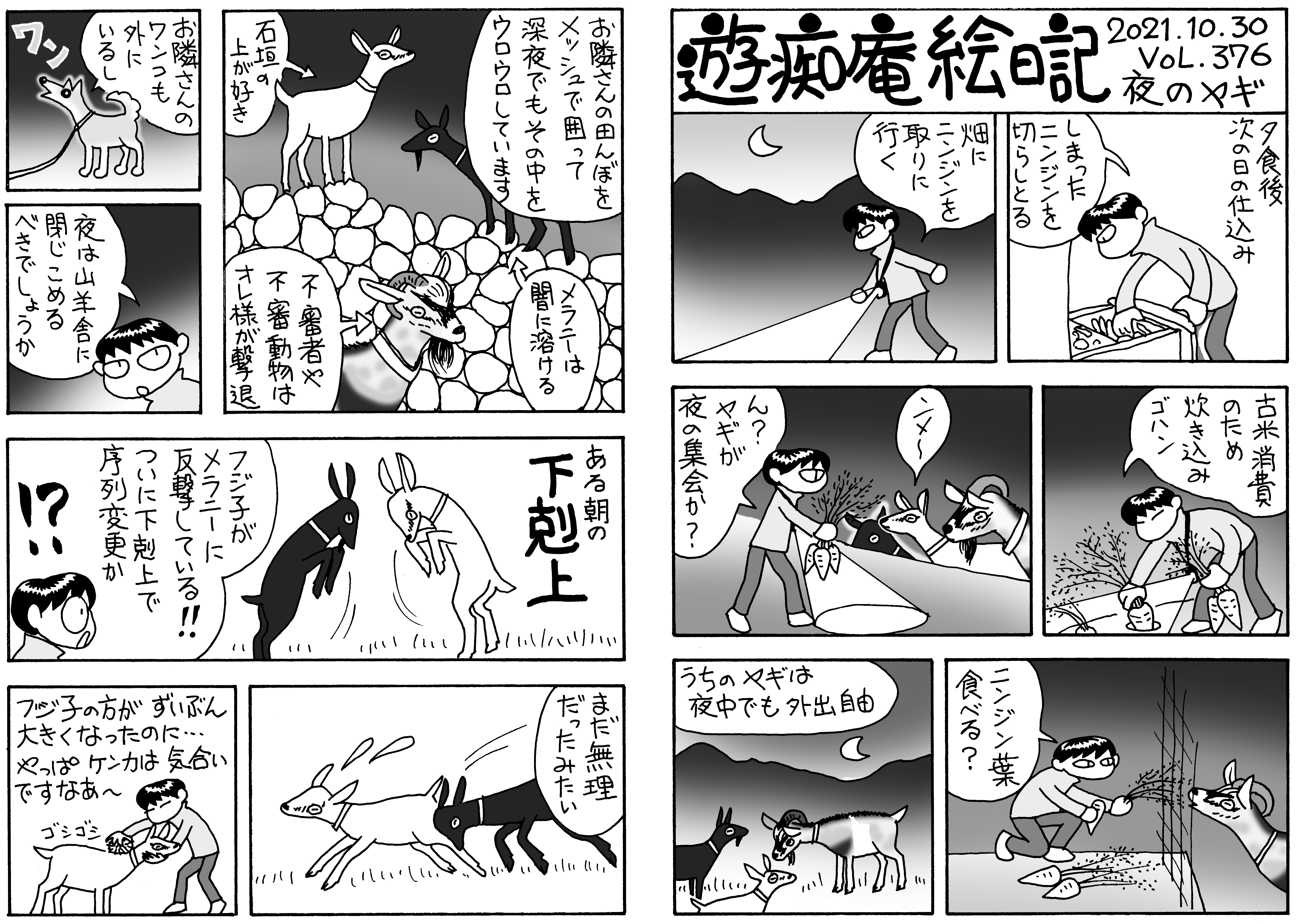 深夜の山羊脱走さわぎ。マロンは川に転落し橋の下で鳴いていた。梯子をかけて救出。ジゲンは毎日深夜になると脱走している。柵を点検し補強しまくったのに脱走する。もう,四次元の穴があるとしか思えない。