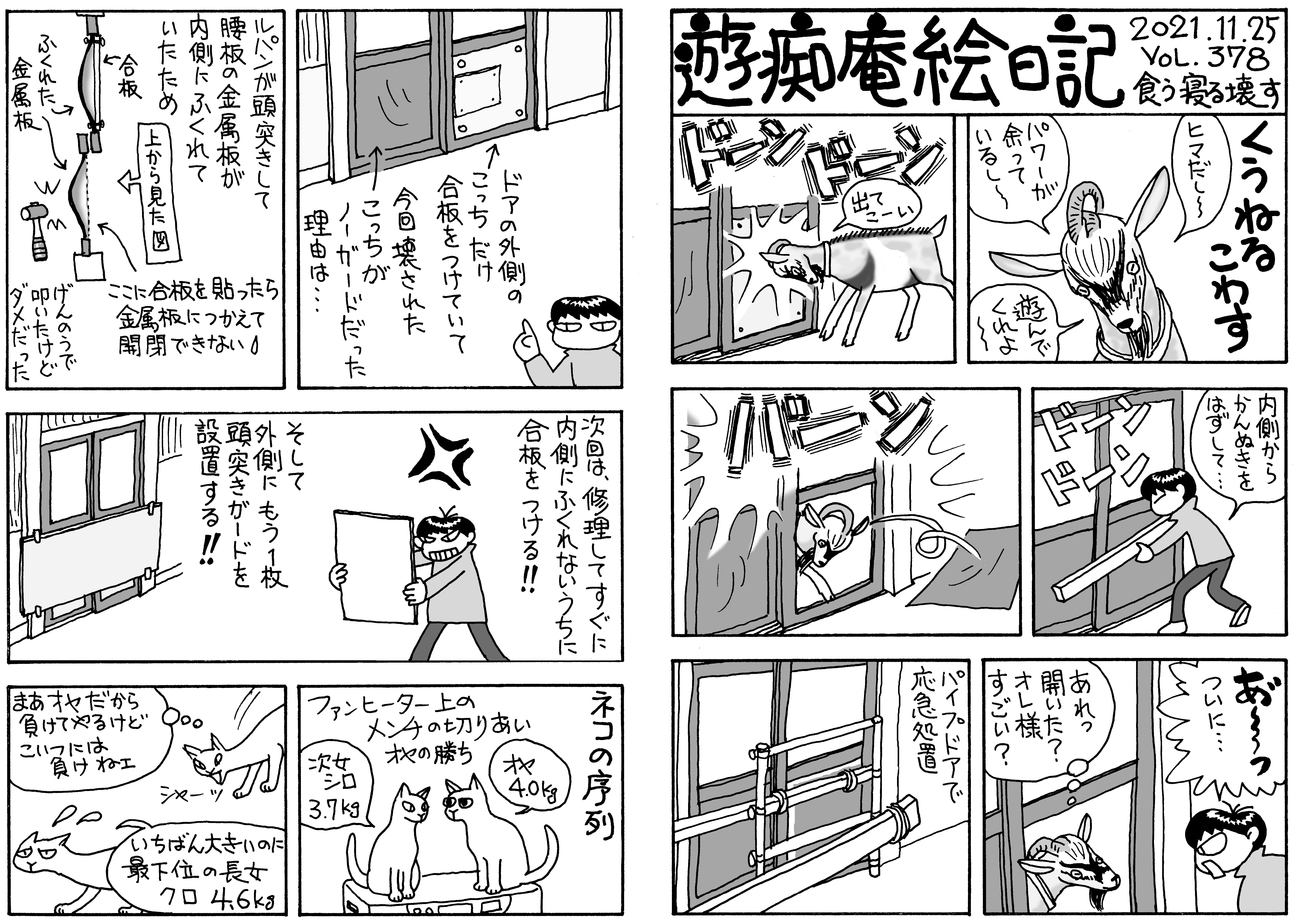 チビビ3ヶ月,生意気盛り。不二子にマウントしたり頭突きしたり。そのチビビも新しい飼主さんのもとへ出発しました。倉庫の引き戸の12ミリ厚の合板をルパンが破壊しました。ブトは山紫水明の地に発生する!