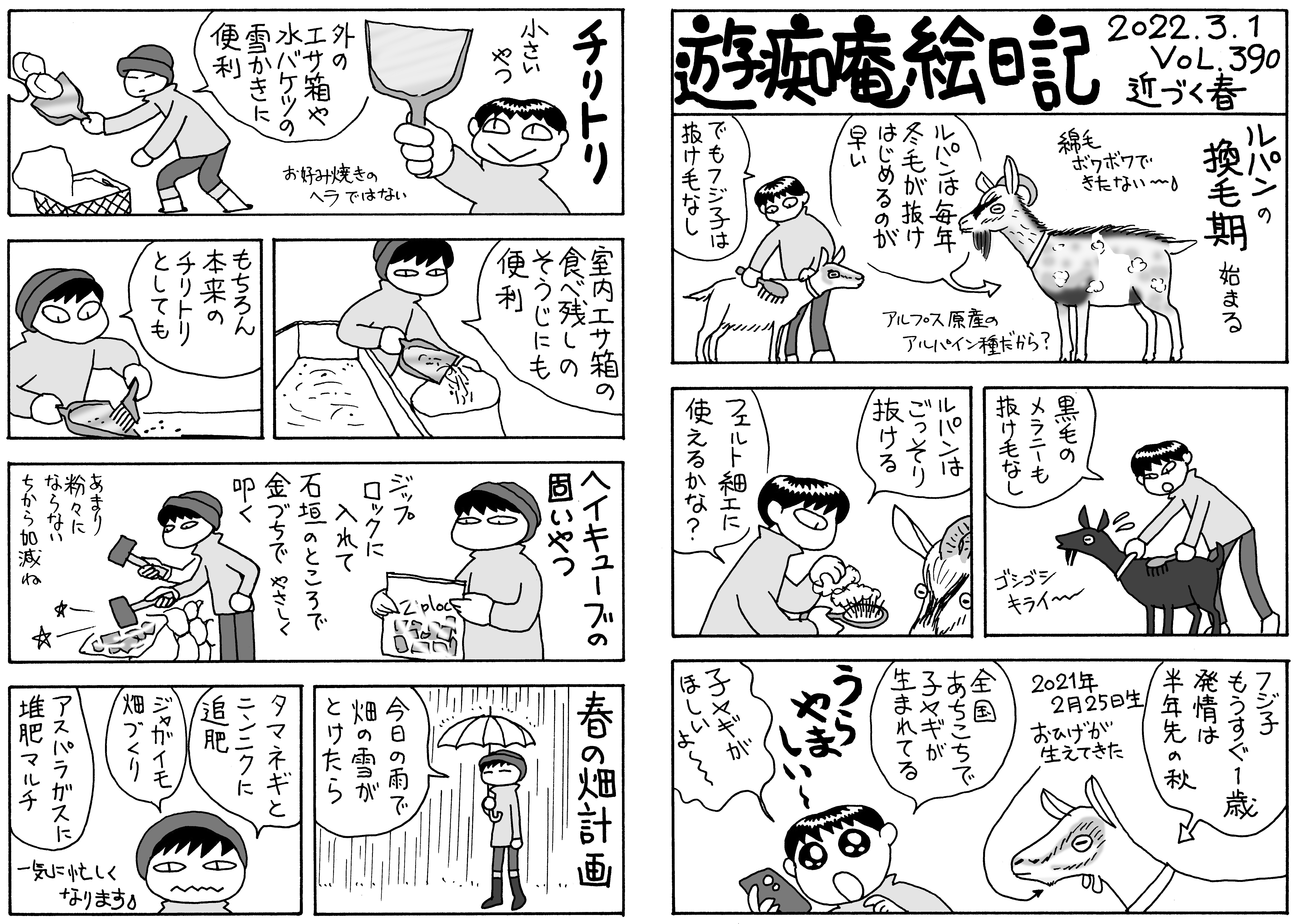 啓蟄になると一気に春になります。雪の時期に倉庫に溜まっていたヤギ堆肥を牧草畑に広げます。ヤギ堆肥の90%は食べこぼした乾草です。もったいない。ところで啓蟄ですが,蛇も蛙も蛤も蜘蛛も虫ヘンですね。