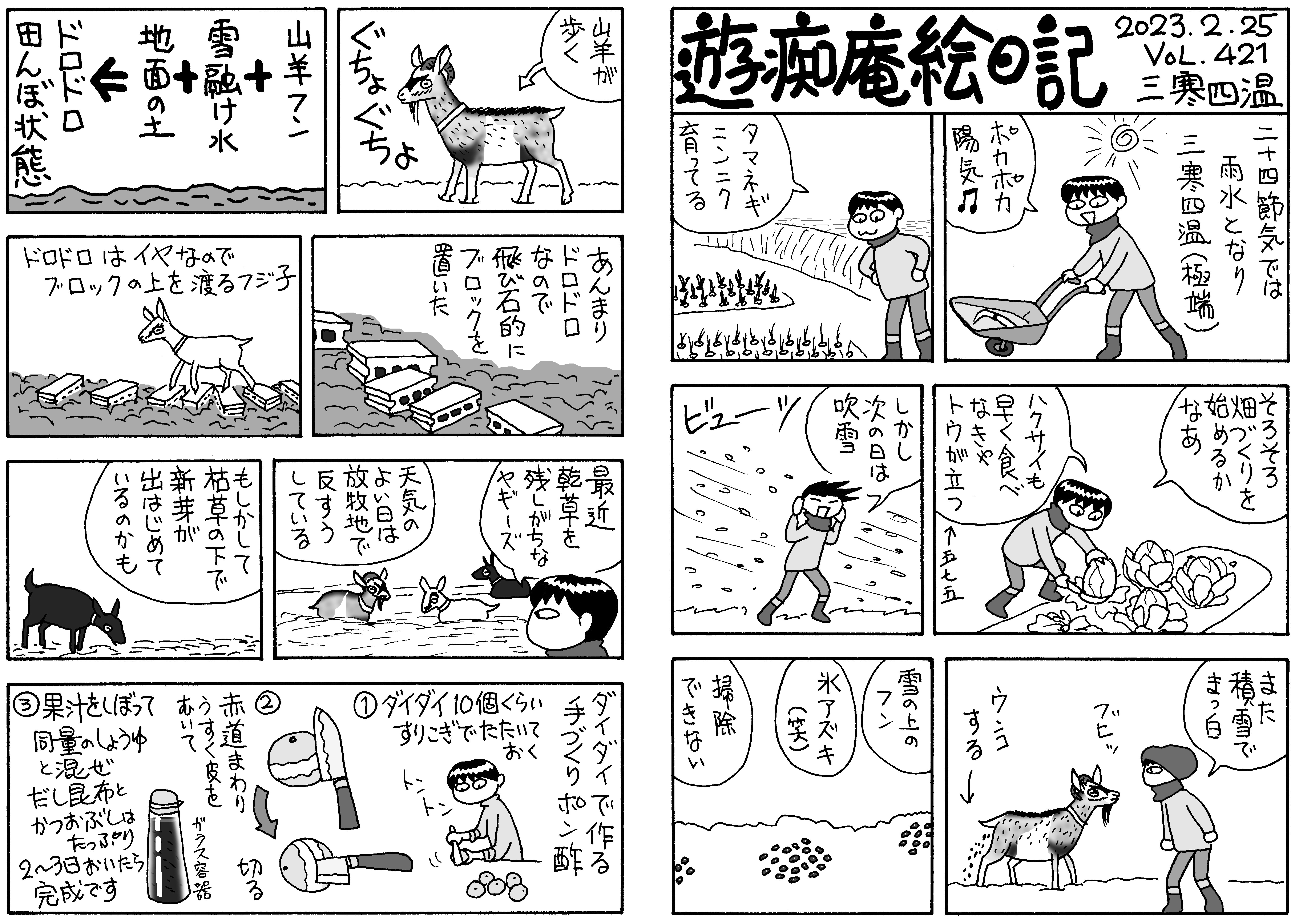極端な三寒四温。汗ばむ陽気と思えば吹雪で積雪。雪の上にヤギが糞をして氷アズキ。そこをヤギが踏んで土と混ぜ合わせてグチョグチョですわ。早く雪が消えてほしいです。ダイダイ酢で手作りポン酢,旨い。