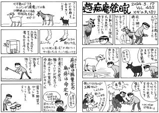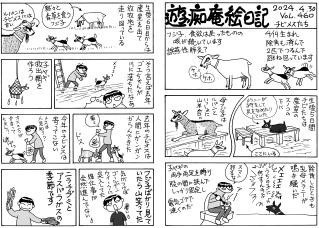 4月頭には雪が積もっていたのに,半月経ったら夏日 (;´Д`)。汗をかきつつ畑づくりをすれば筋肉痛。春の農繁期です。ヤギたちは放牧地で優雅な生活。写真①放牧地の山羊,②ユニコーン・ルパンの一本角。